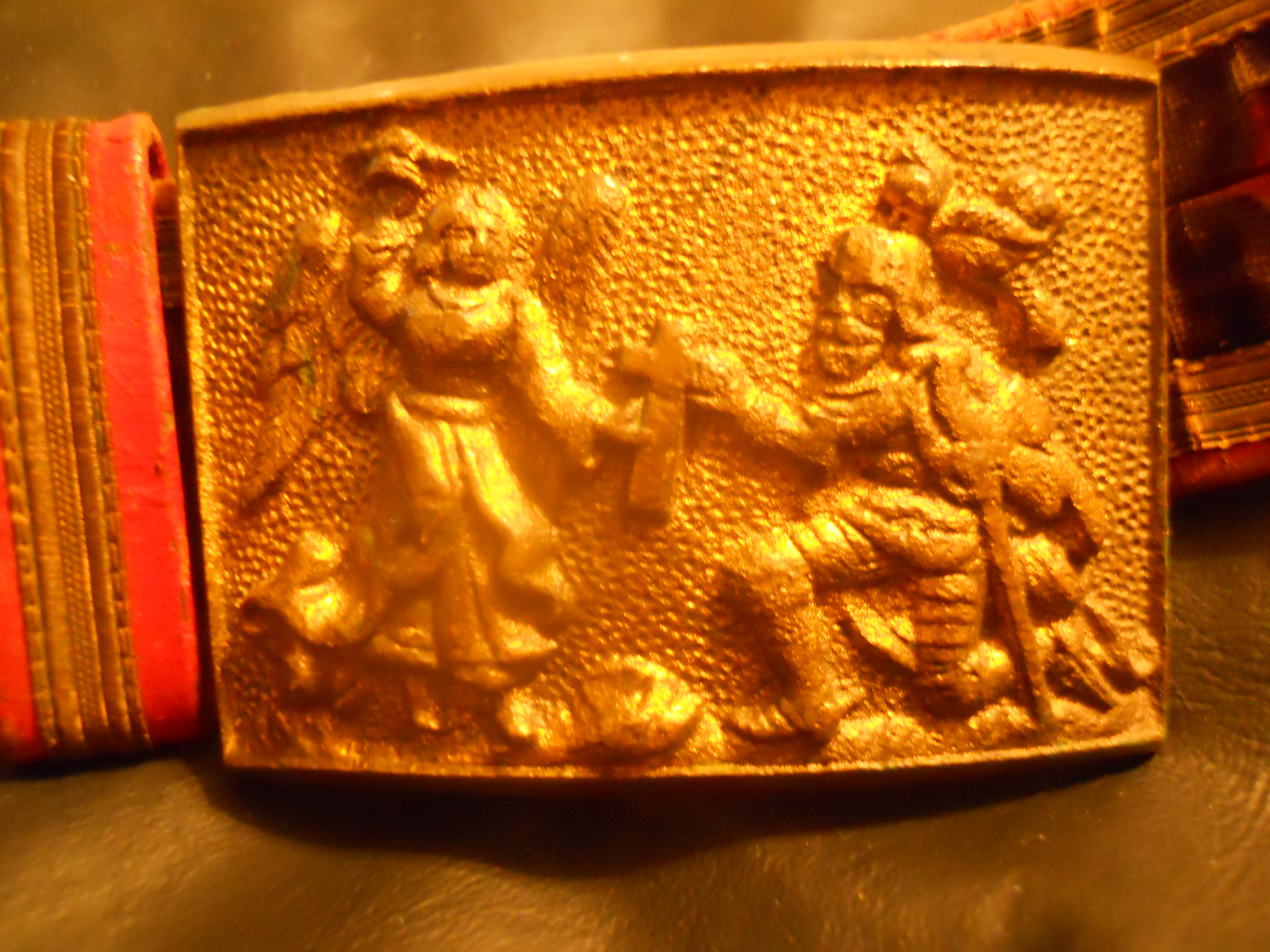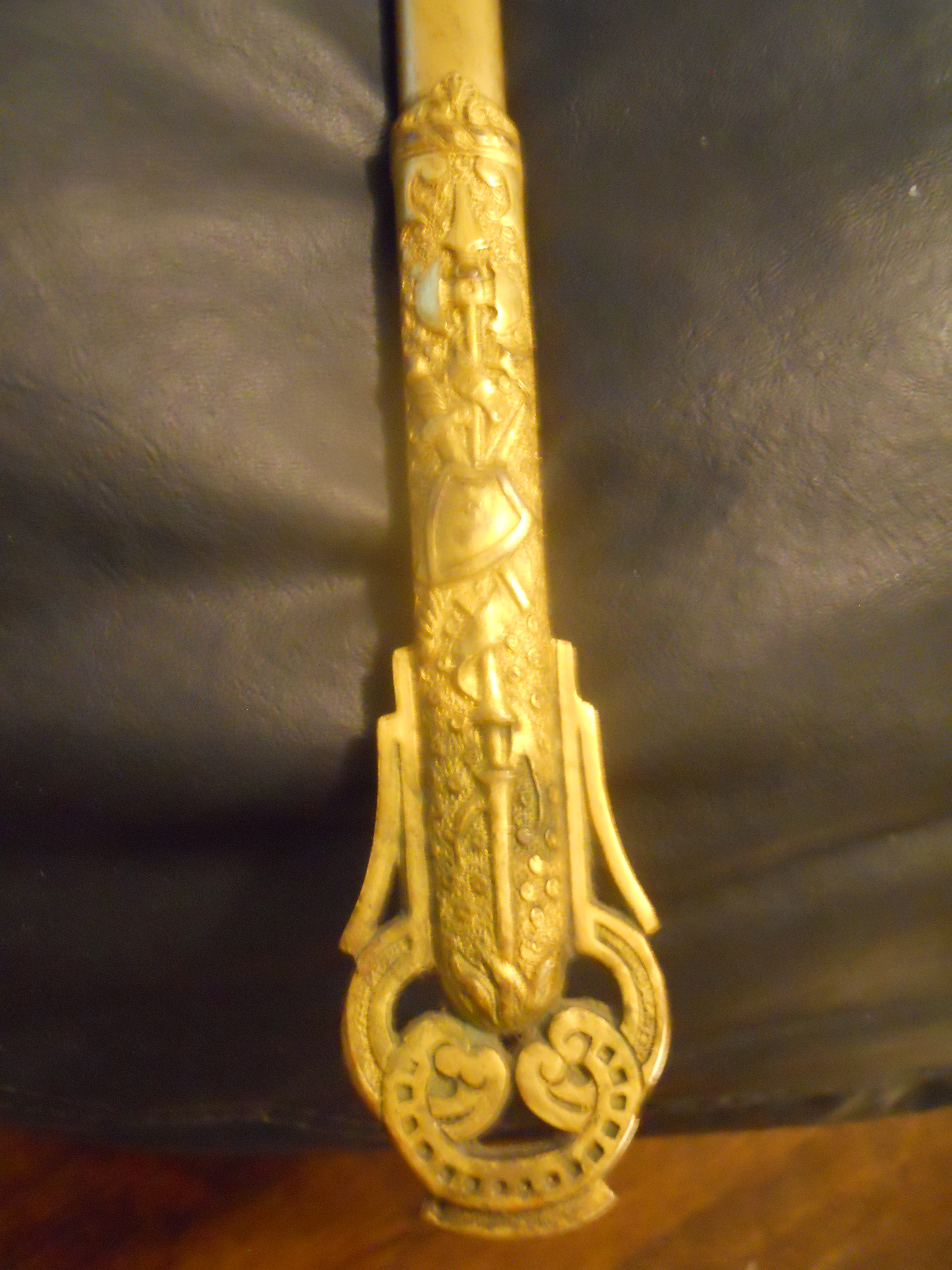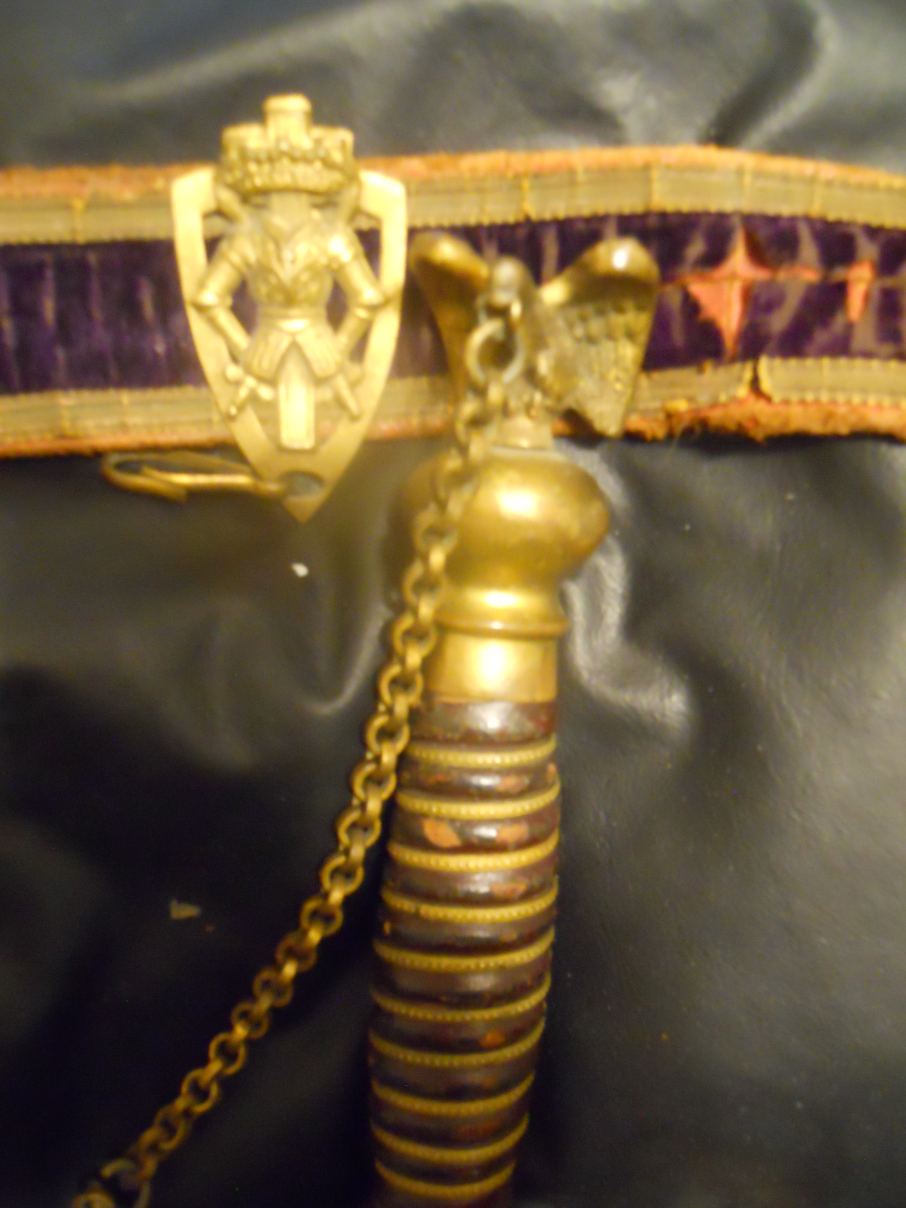 Knights of the Golden Eagle, ceremonial sword, with Harry Lyon printed on the blade. Picture of Harry Lyon, wearing sword, taken 1891 or slightly earlier, in Salina, KS. Tip of sword broken off, resharpened by my father sometime around 1962.