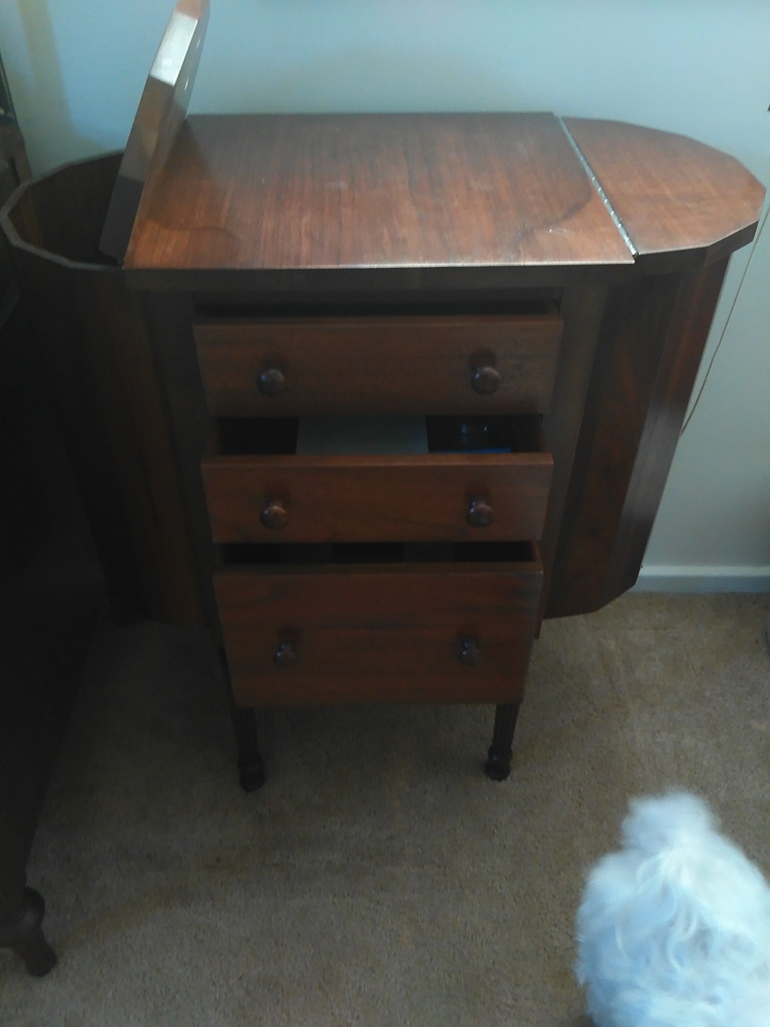 Description Has a metal tag with the following information:. Ferguson, Hoboken, NJ. # 3998 Mom referred to this as a knitting cabinet. Both ends have a hinged panel that lift up to a storage area. Any idea what kind of price range it's in?