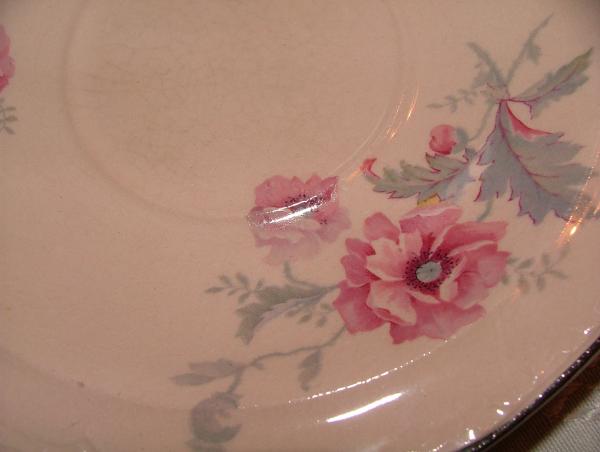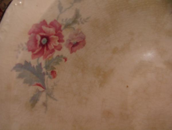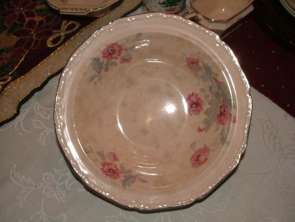 Most if not all of the china has the "cracking" throughout. The piece in the worst shape is the serving bowl with the brown spotting I've tried to attach.