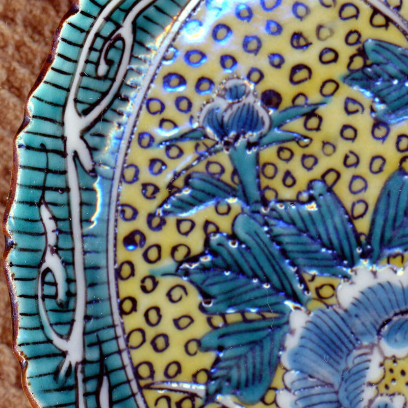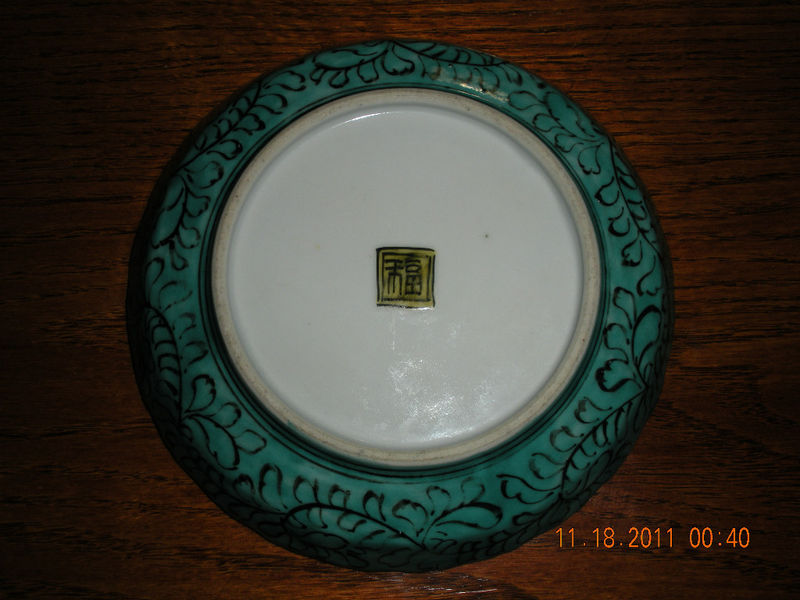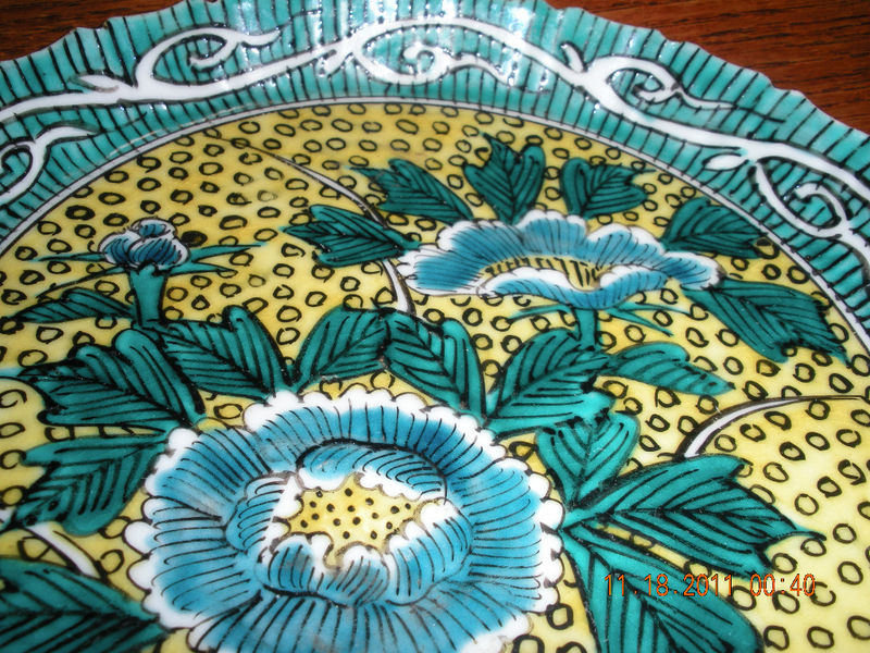 This is a green, blue and yellow plate. I am uncertain or the maker or time frame as to when t was made. The plate is also very thick.
