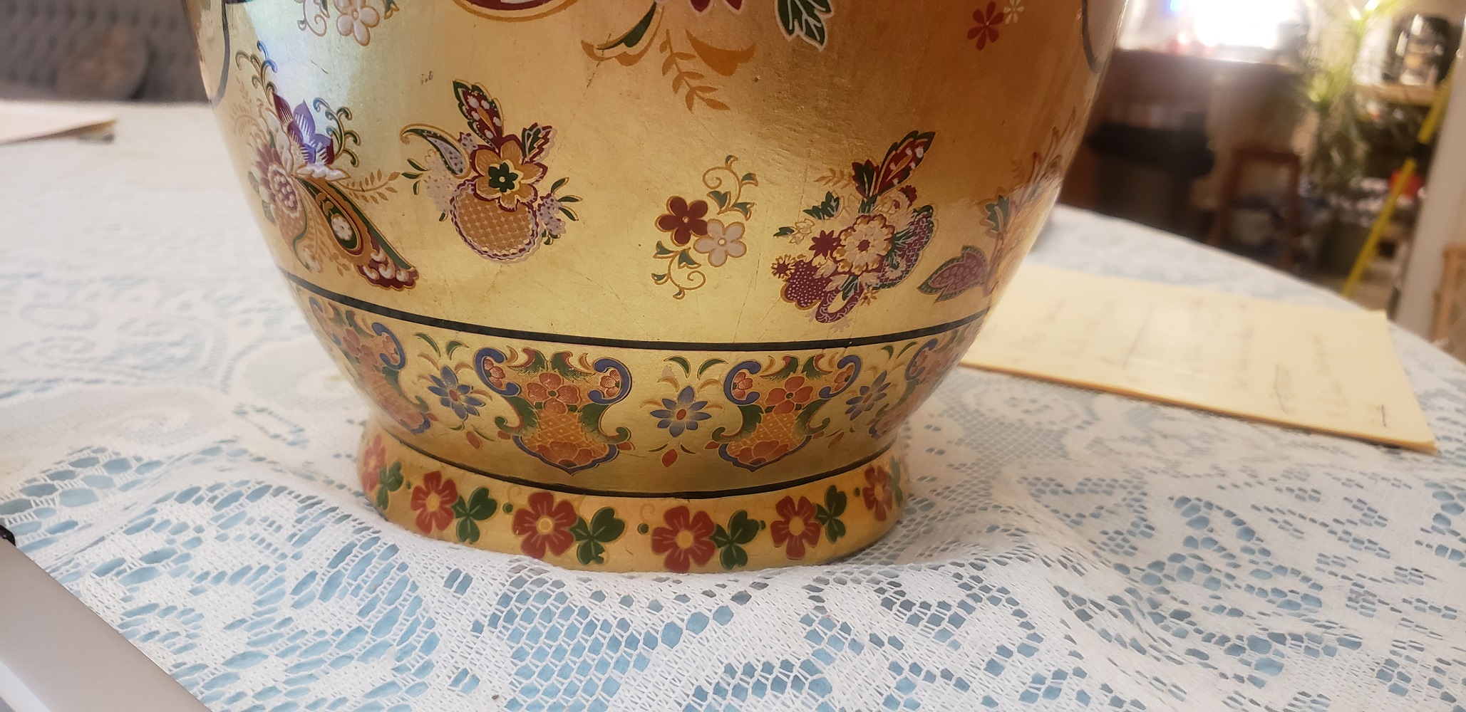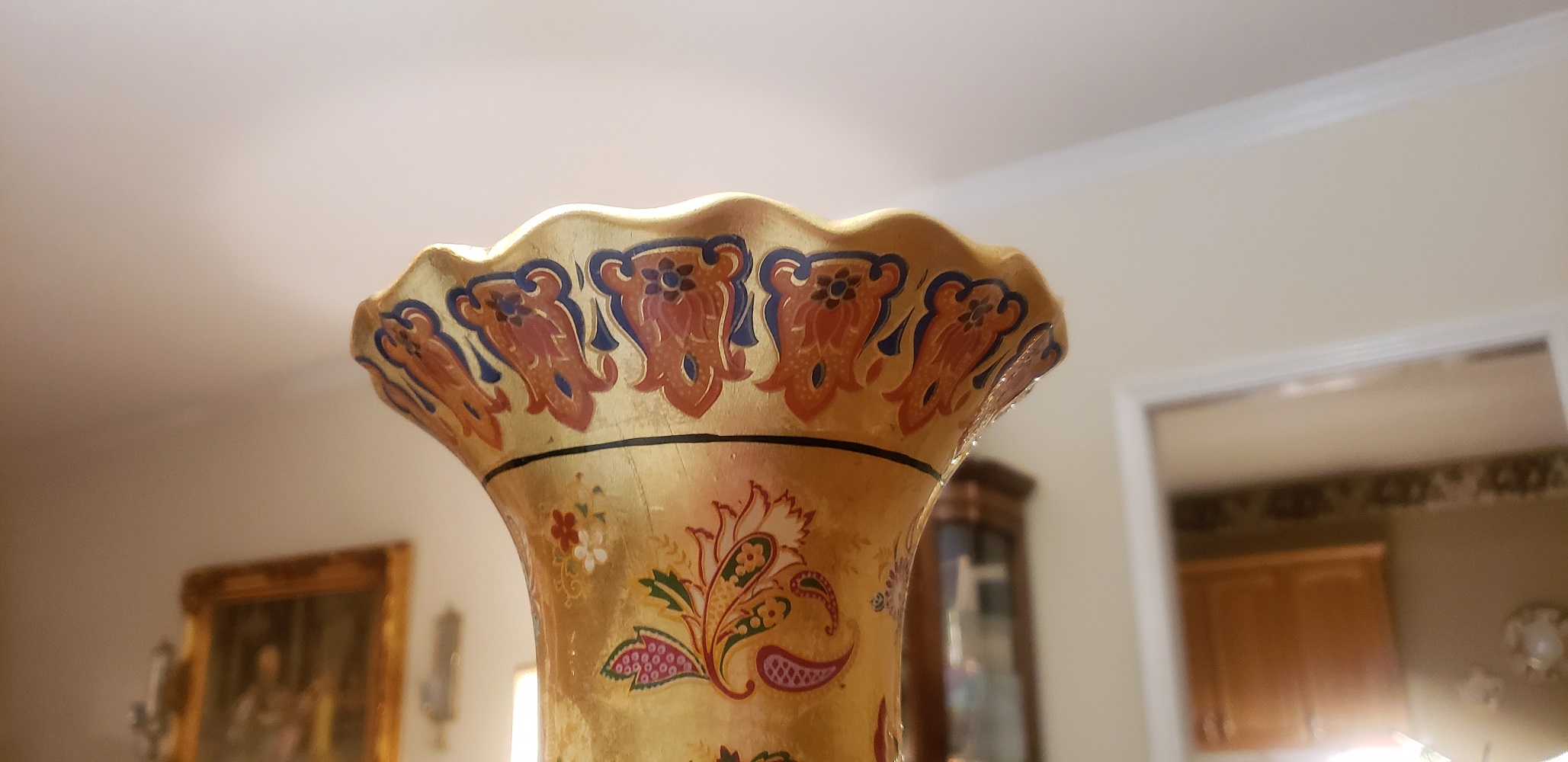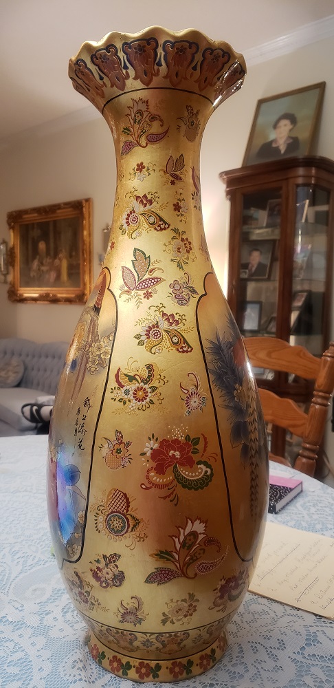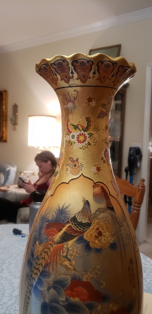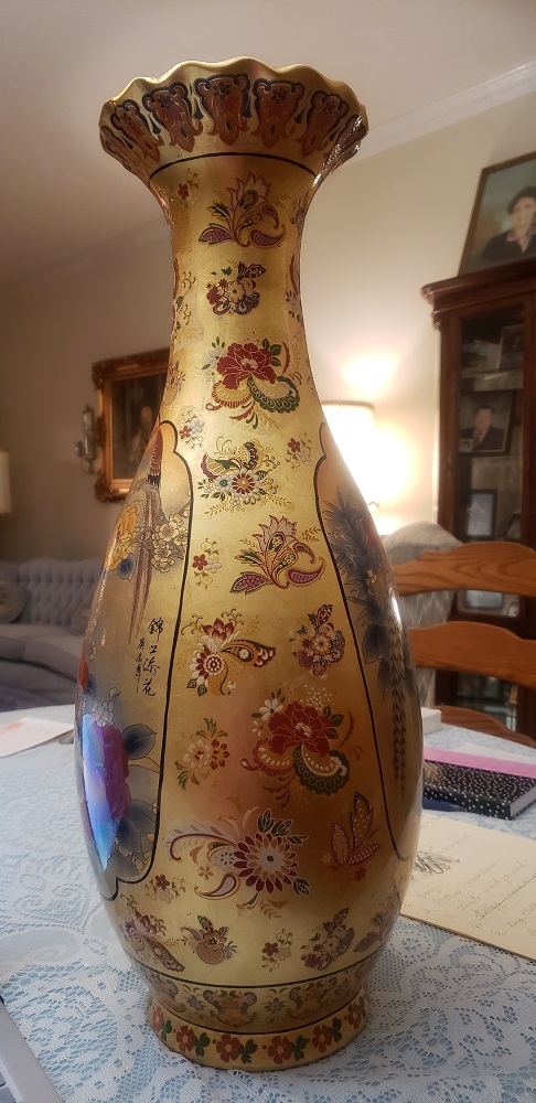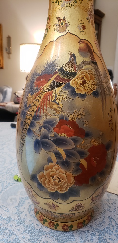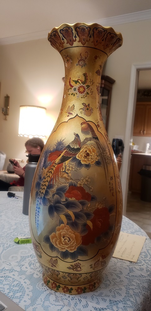 Large Chinese vase with birds and flowers. Has fluted edge at the opening.