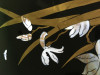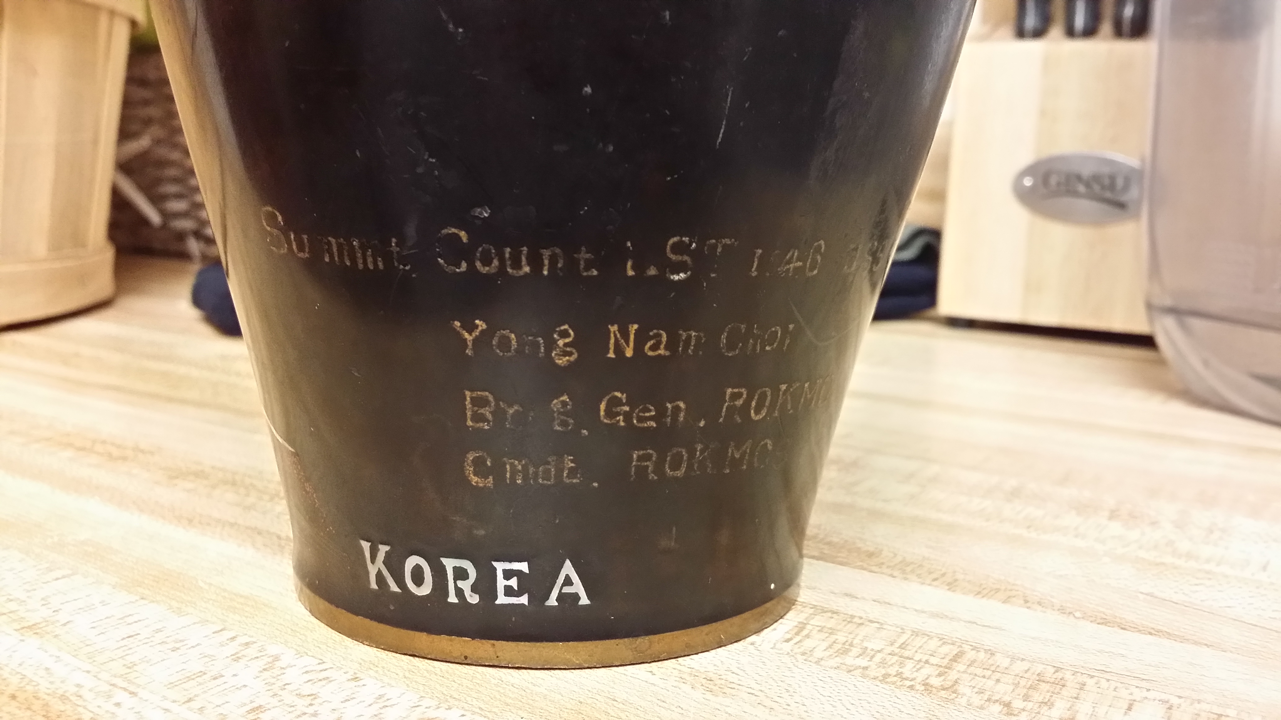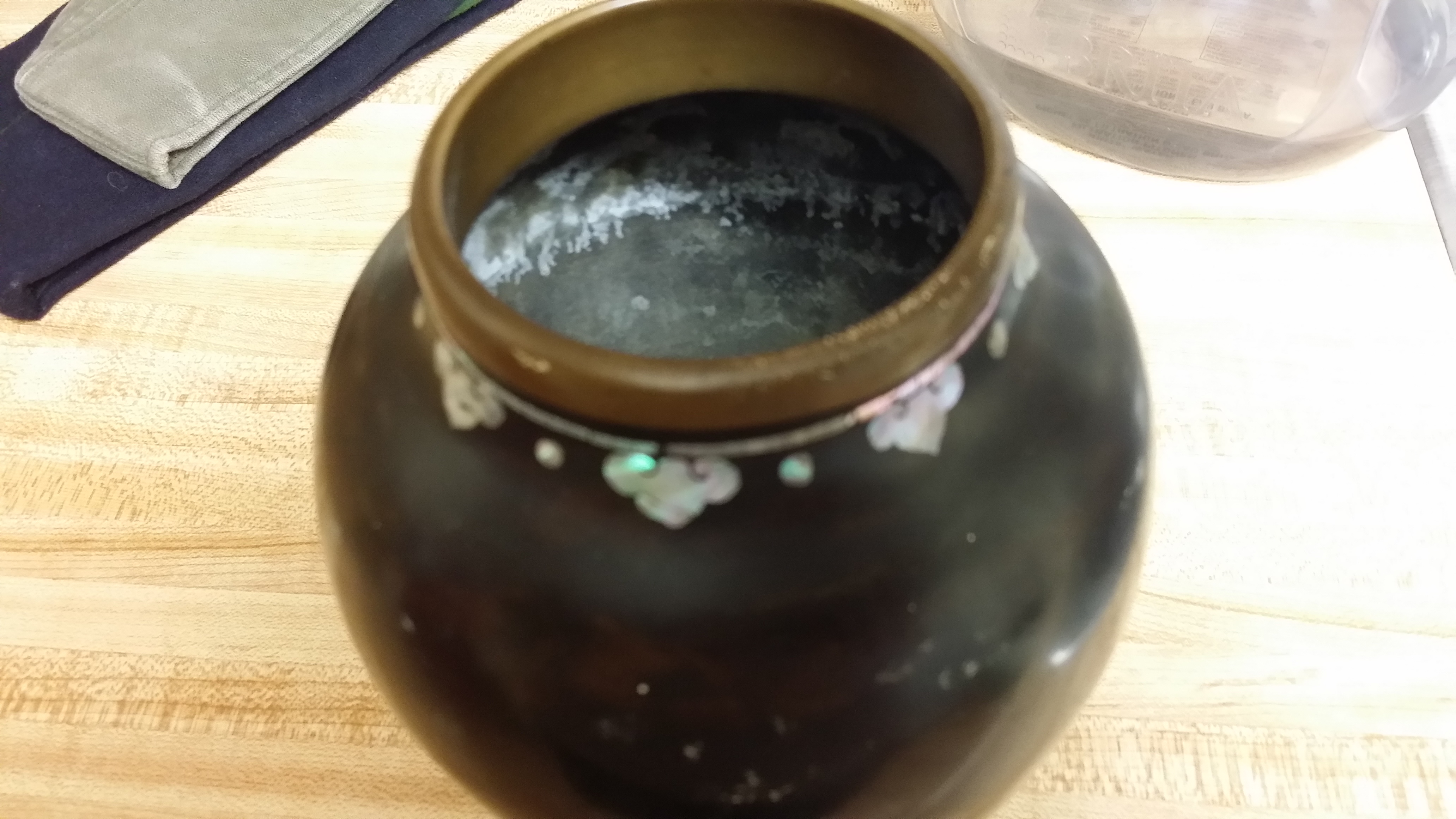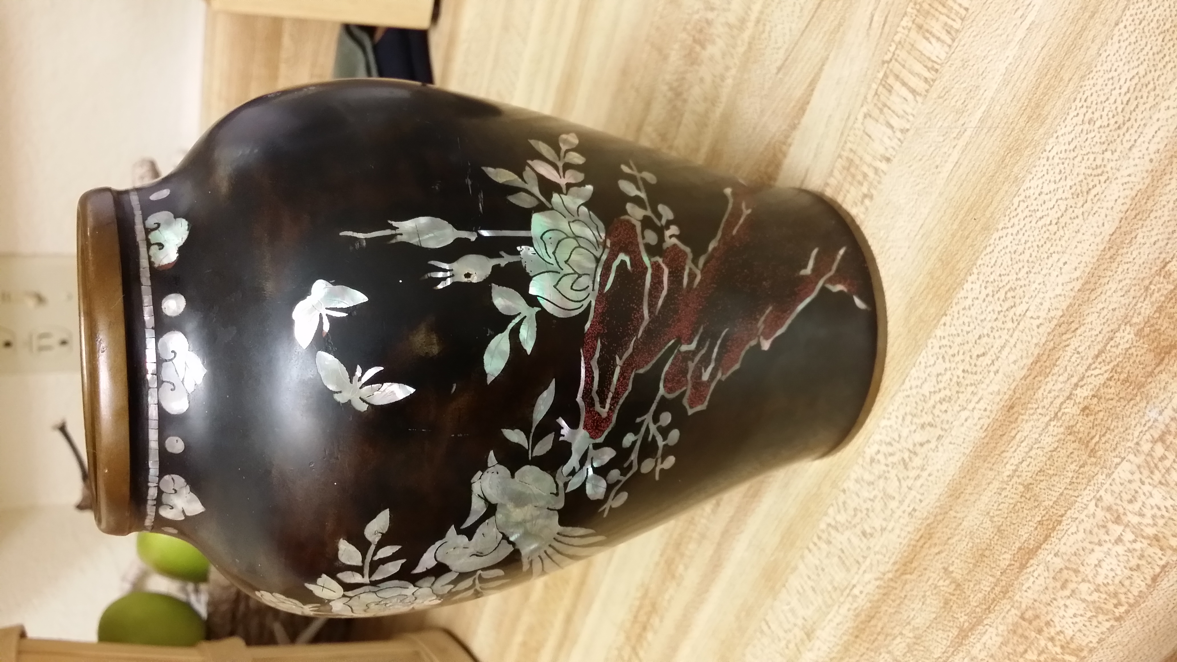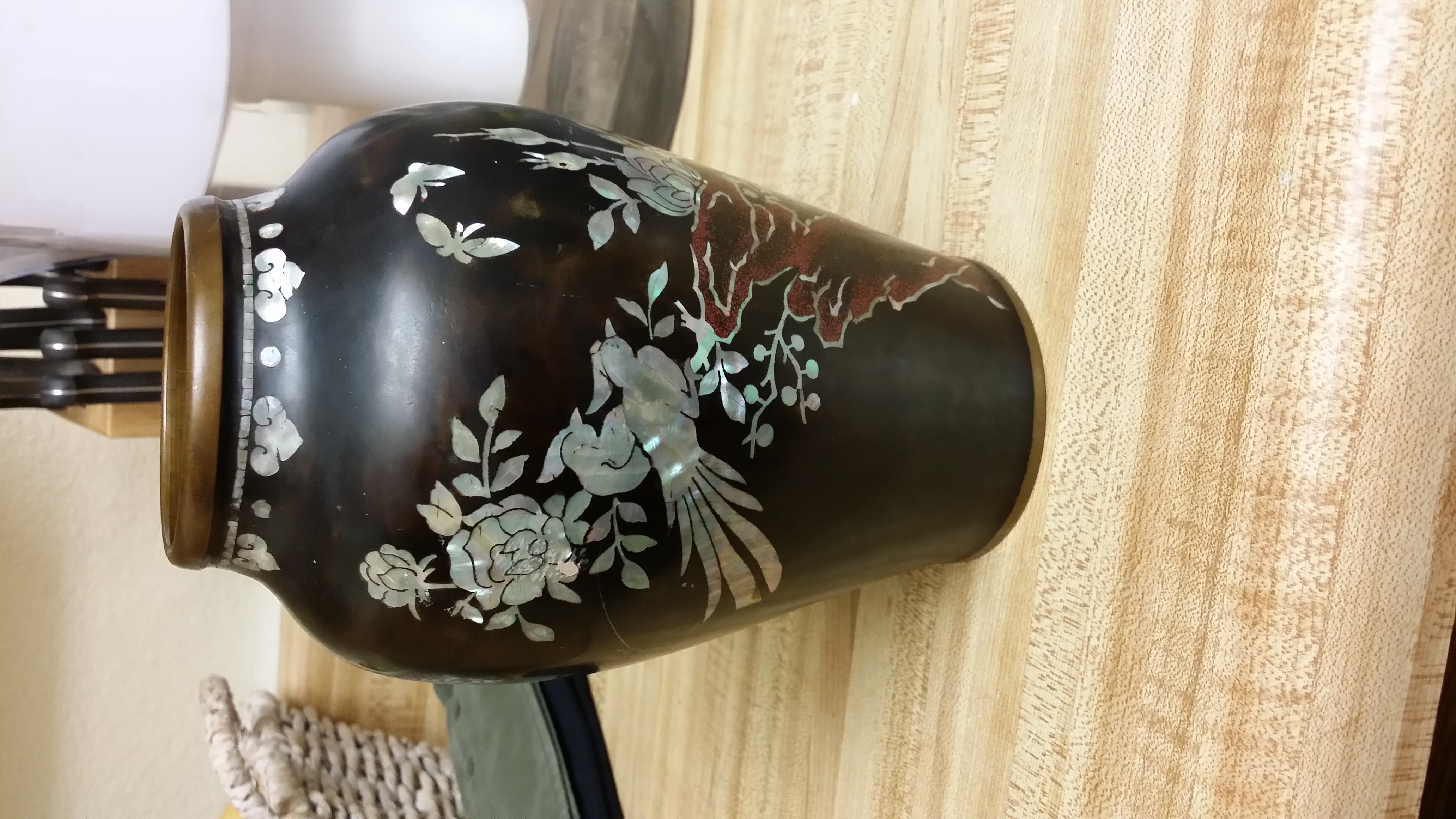 The vase is black and appears to be lacquer or enamel with mother of pearl inlay. The rim and inside appears to be a bronze metal. On the back there is an inscription that says