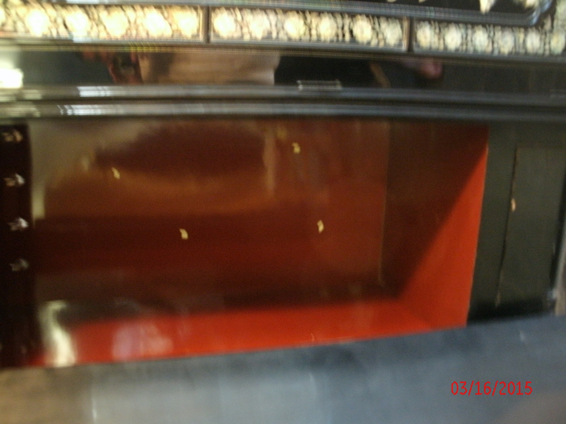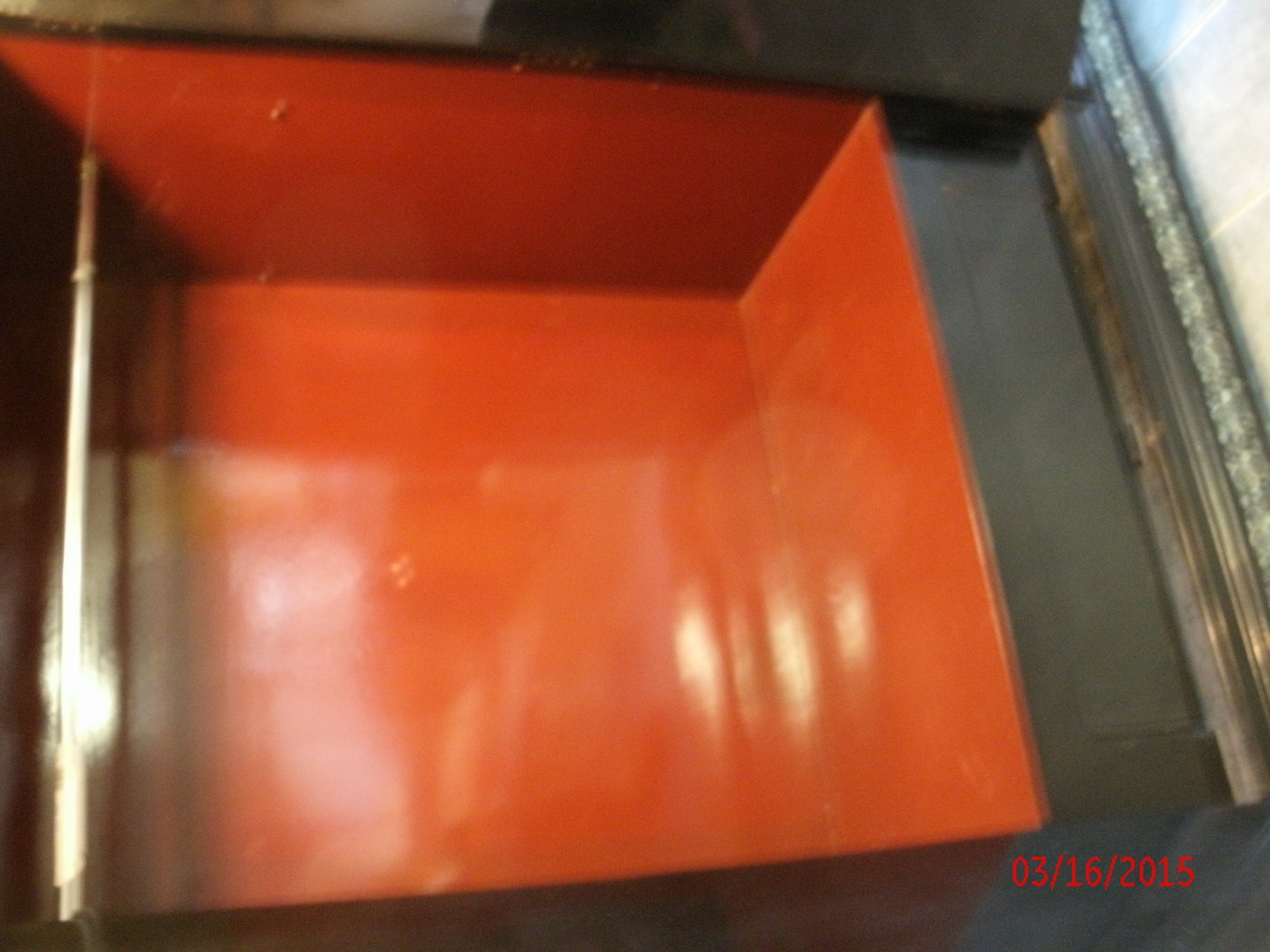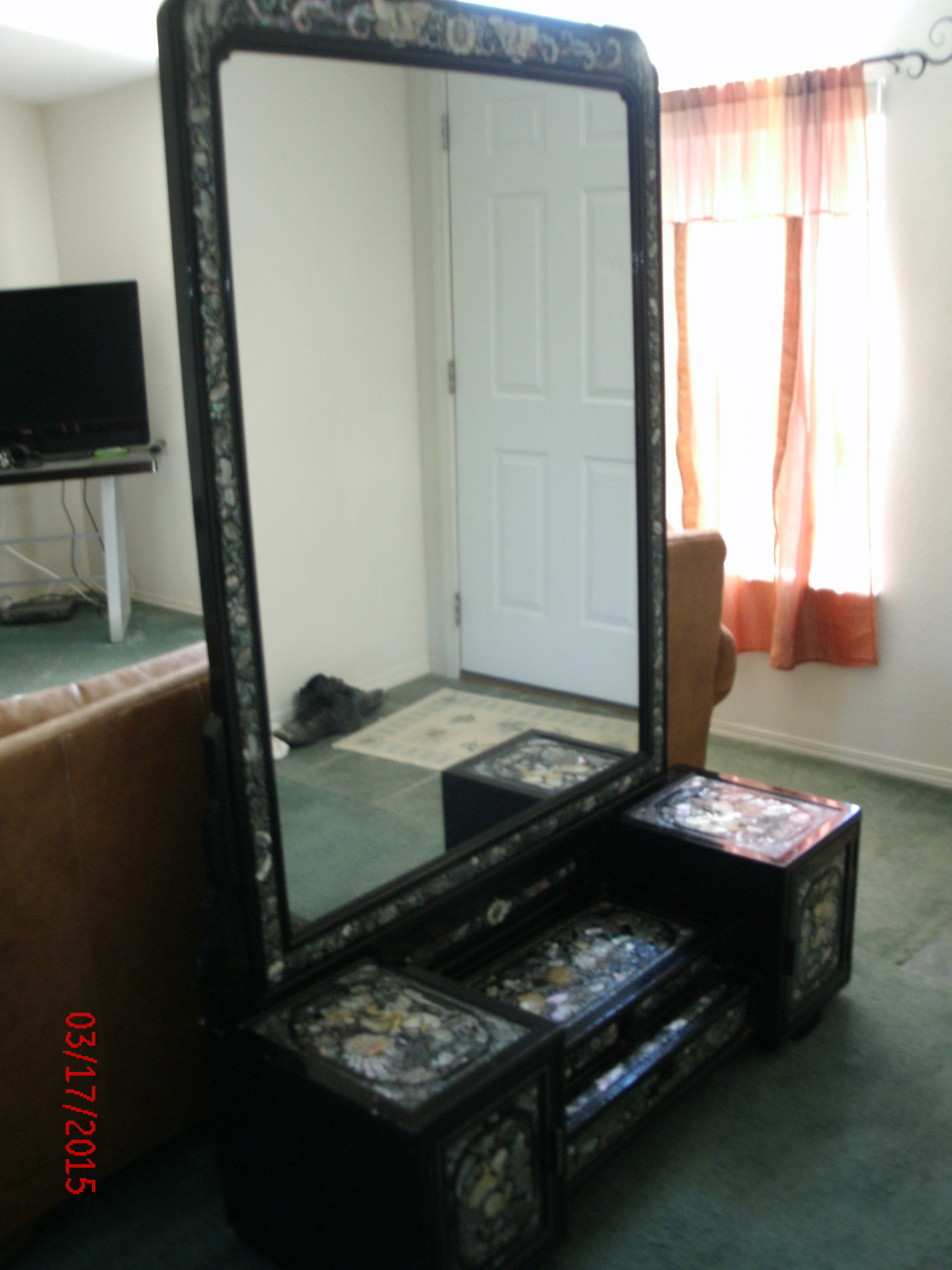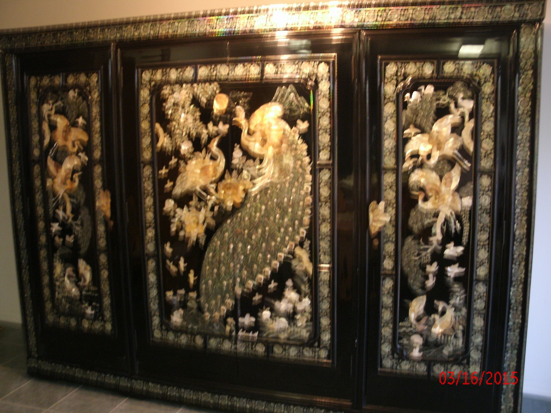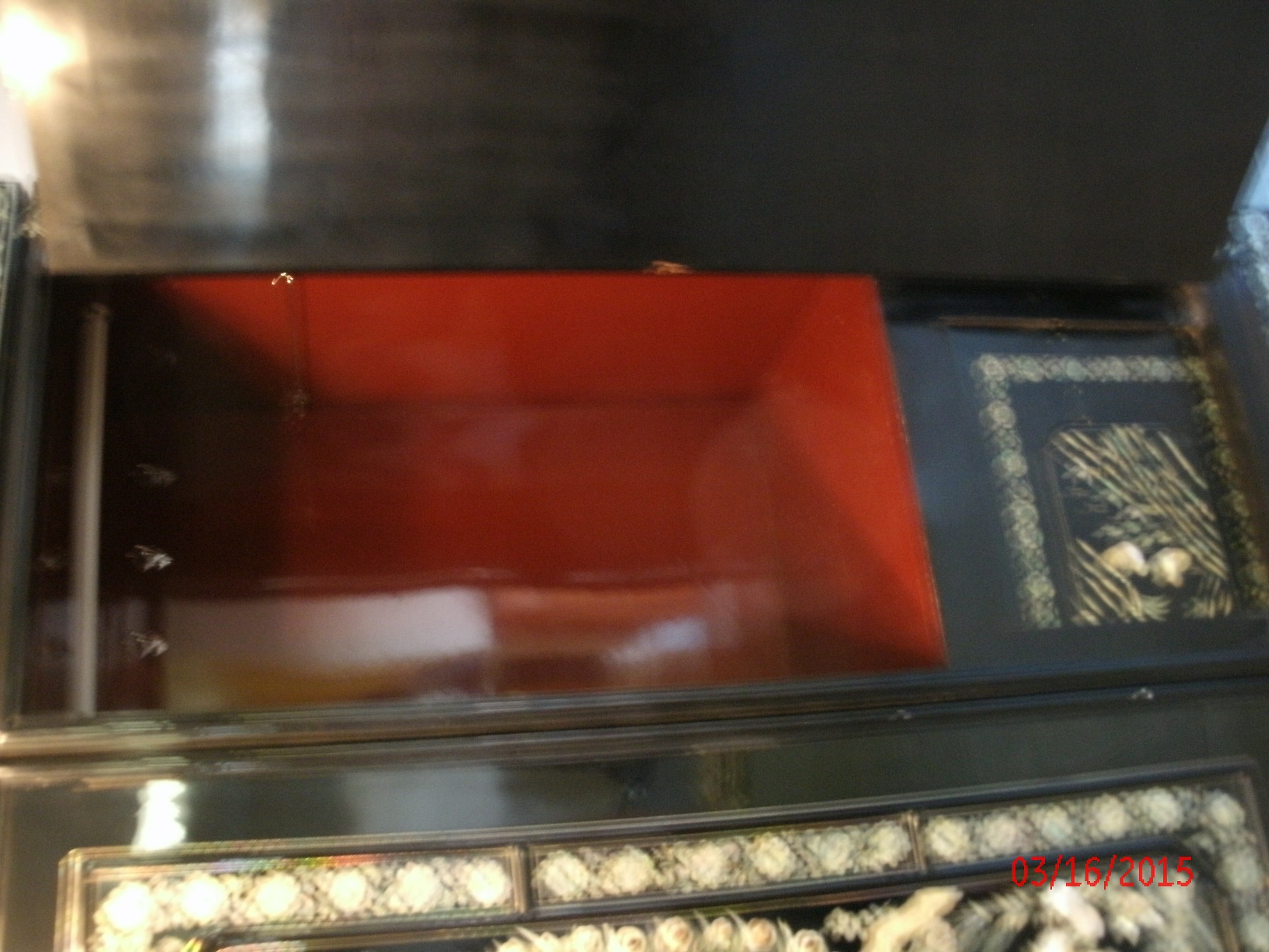 3 cabinets with 4 doors and pull out draws. I believe its black lacquer on the outside with mother of pearl and red lacquer inside.