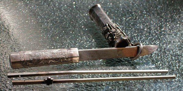 This is a Korean Ornamental Silver Knive and Chopstick Set, a jangdo, an ornamental knife, usually given and worn by women as protection. Jangdo can be Goggled for more information and history.