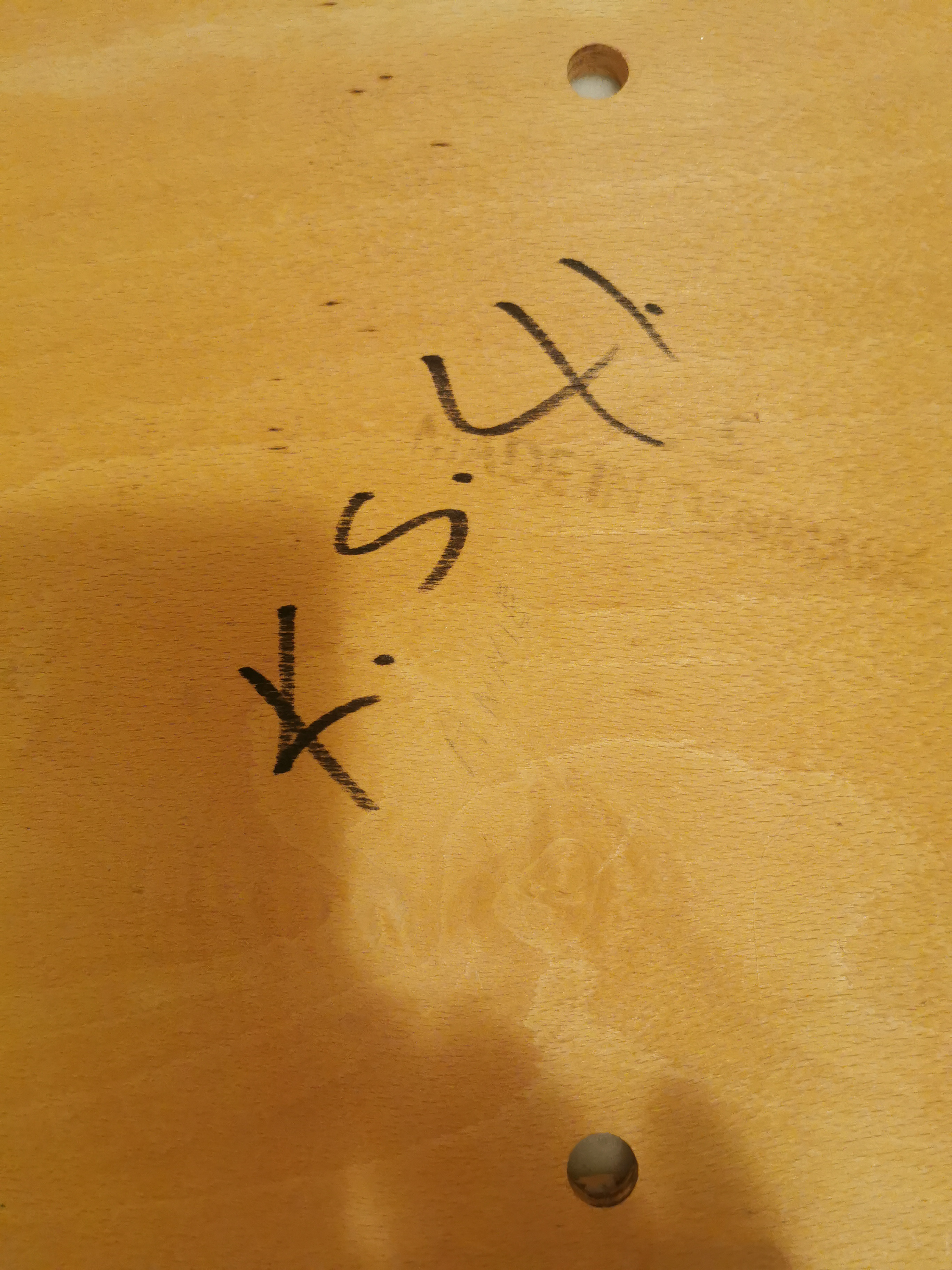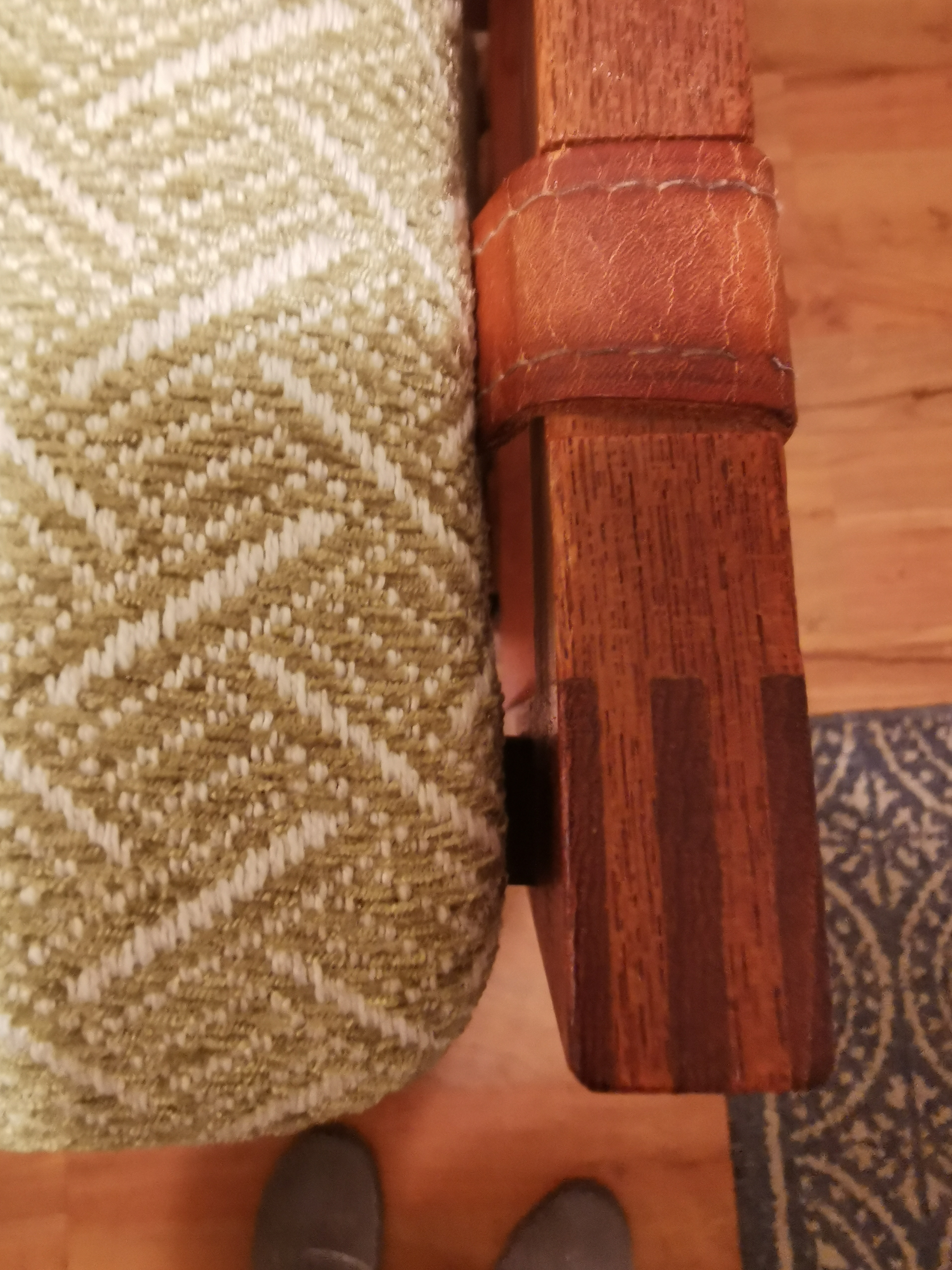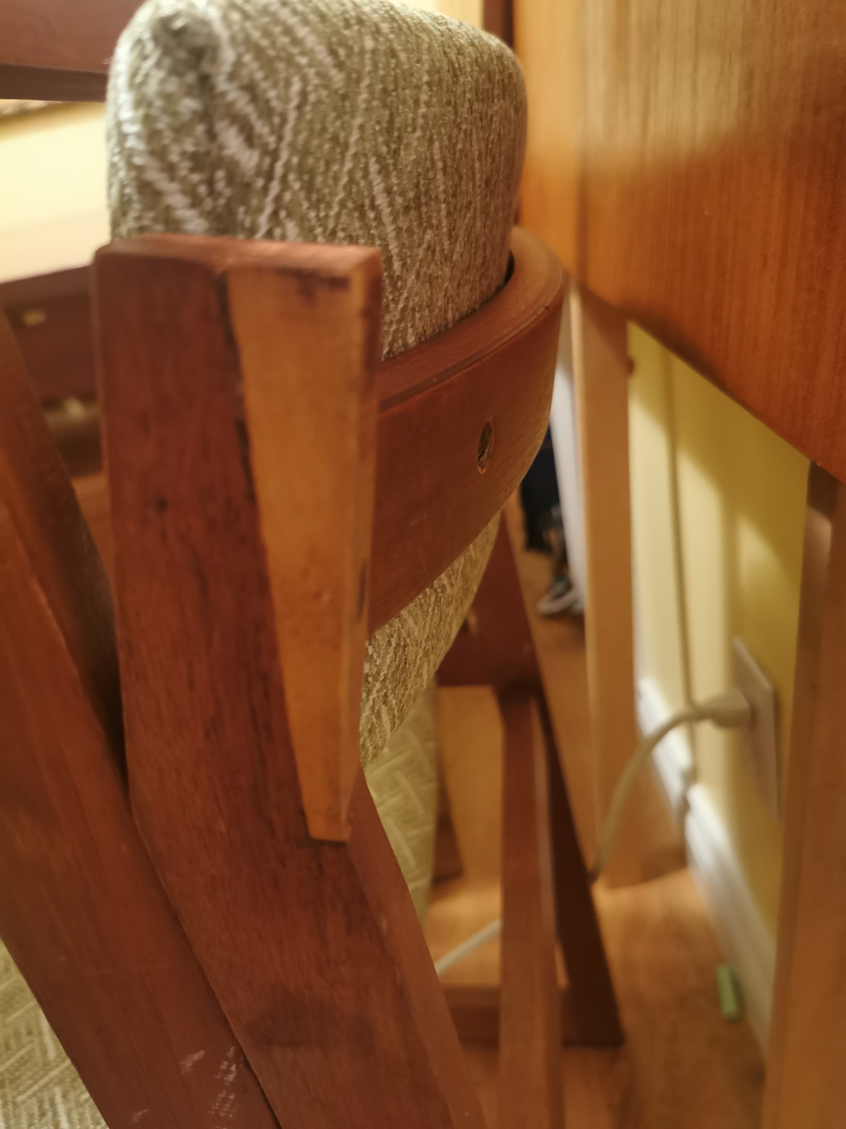 The chairs are unusual with seats attached by leather straps and have been reupholstered. One chair back has been repaired ( see last image) where the cushion attaches. Marked K.S. 41