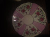 Cup rim has symmetrical wave pattern with pink 'wash' border that seems more painted with a rag/finger than a paintbrush or dipped. Hue inconsistency (in some area whiter than pink and asymmetrical) Between each wave there are like 2 or 3 punched in lines only seen when placed against light (unsure if decorative or with the purpose to make paint stick). Handle has some decorative motive, seems stuck separately before final glaze due to small gap I can see. It is definitively not ‘fine’ china by today’s standards as there are imperfections that are obviously 'baked' in rather than wear and tear. Plate saucer has similar characteristics but not as thin and no details between waves.