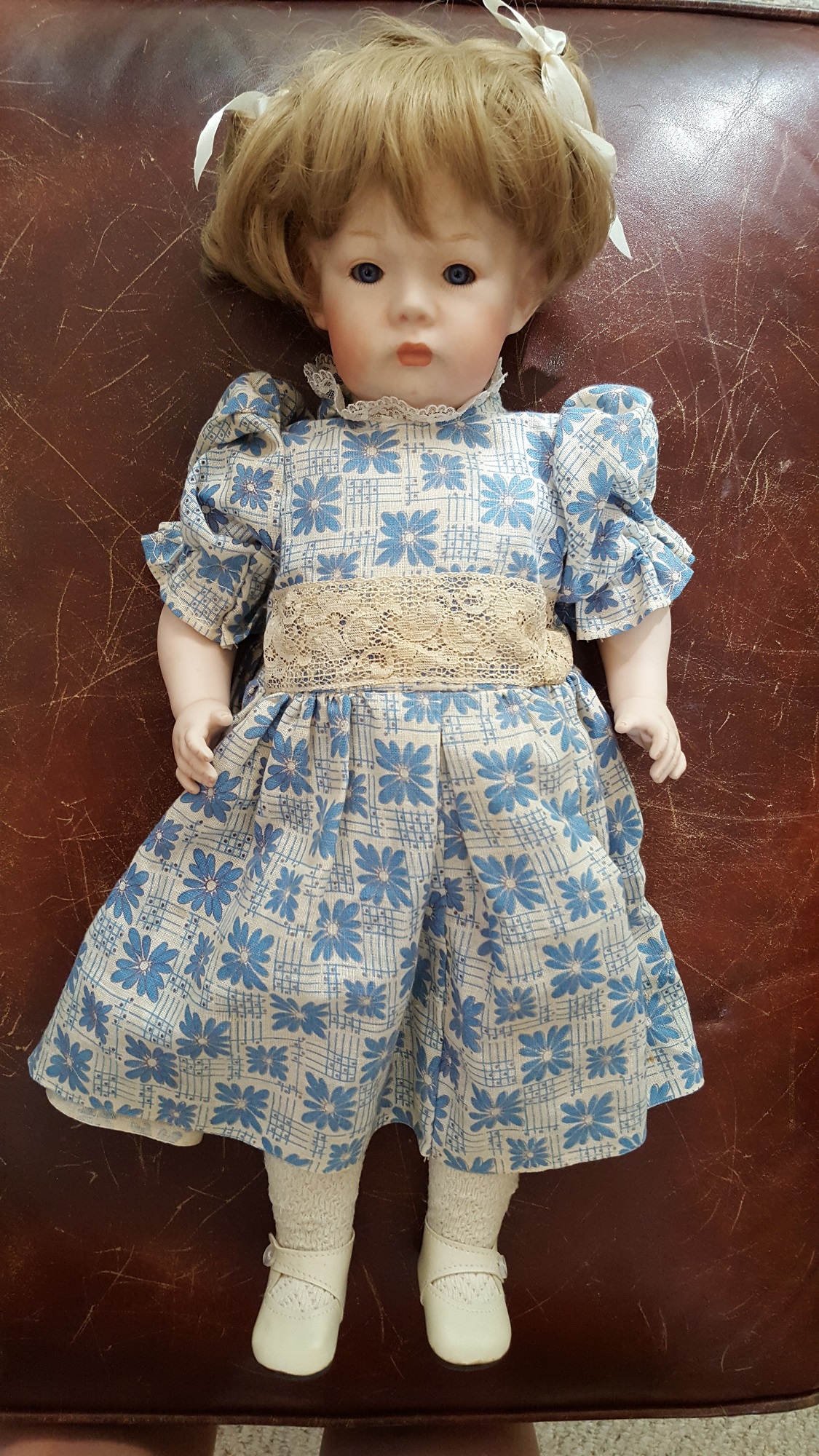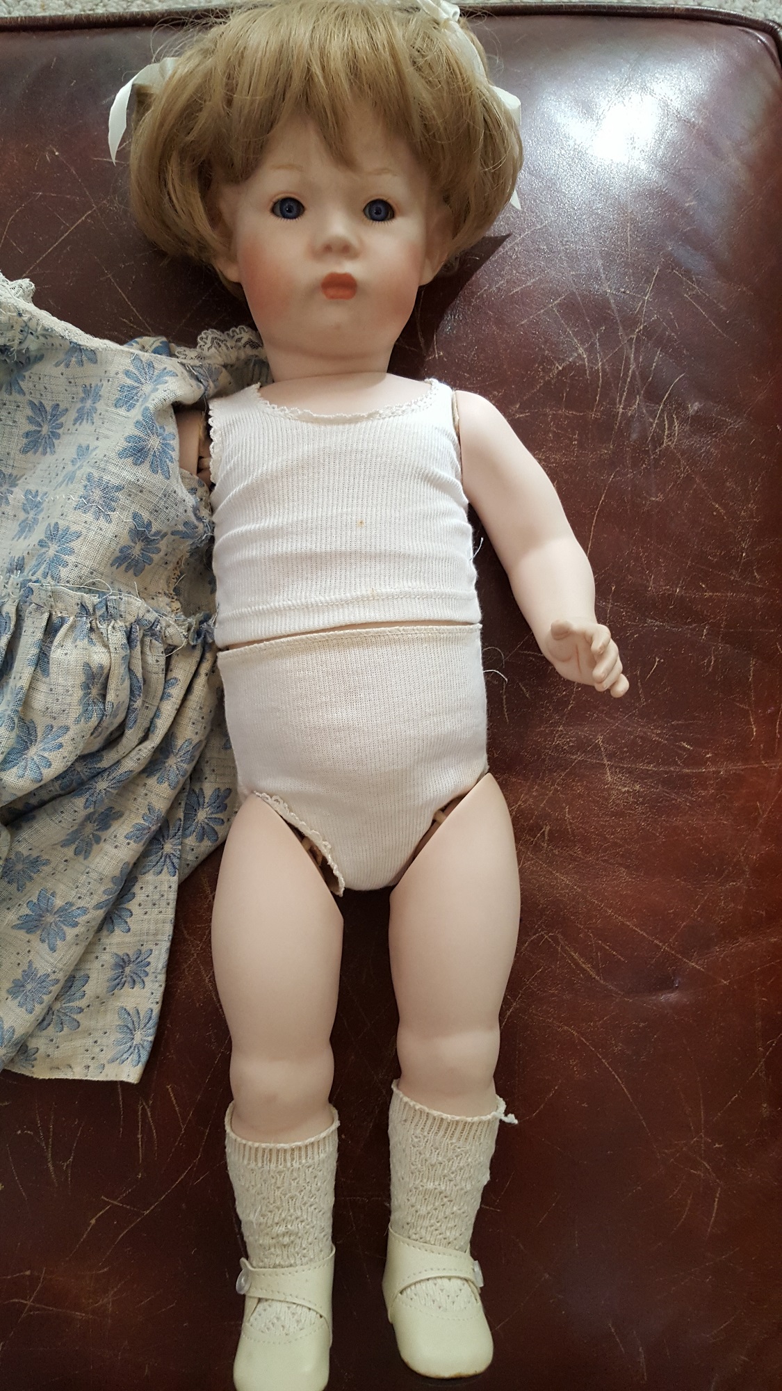 All ceramic doll, jointed/ movable head, arms and legs. Back of head reads K (star) & R Simon & Halbig 115/A Bell Ceramics. Approximately 20" tall, no nicks or scratches. Doll is wearing underclothing, crocheted socks, shoes, dress is old but may not be original, dress appears to be hand-made. Blonde hair with ringlet pigtails tied in cream colored bows, blue glass eyes with lashes,