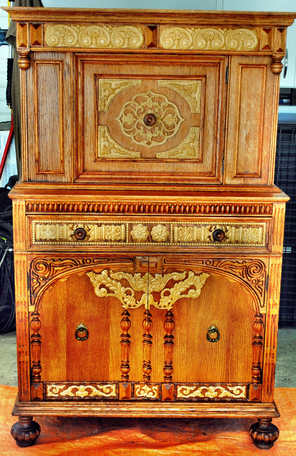 This set dates from the second quarter oof the 20th Century and is in the Jacobean Revival style.The style was popular from the late 1800's through the 1930's and most furniture makers produced a line of it. Demand for sets like this peaked in the ealy 1990's, demand since then has declined. We'd retail a set in very good conditon at $1500.00+