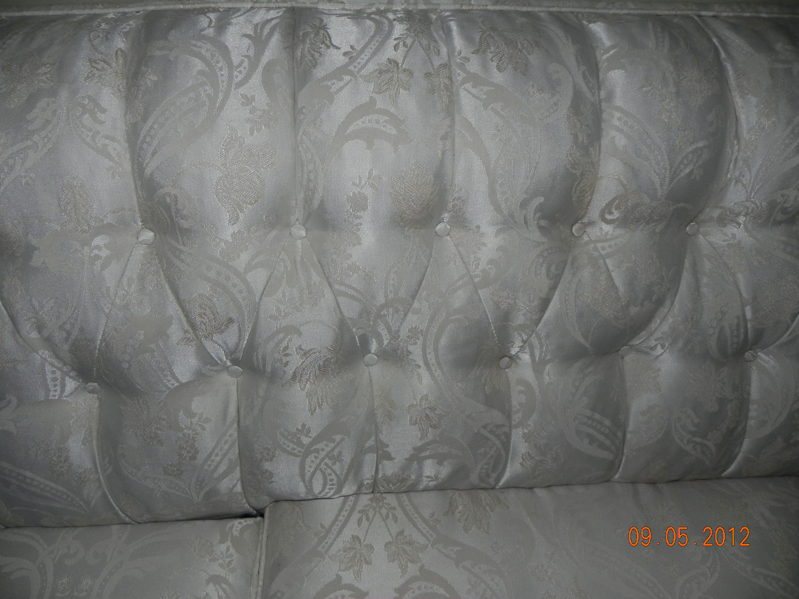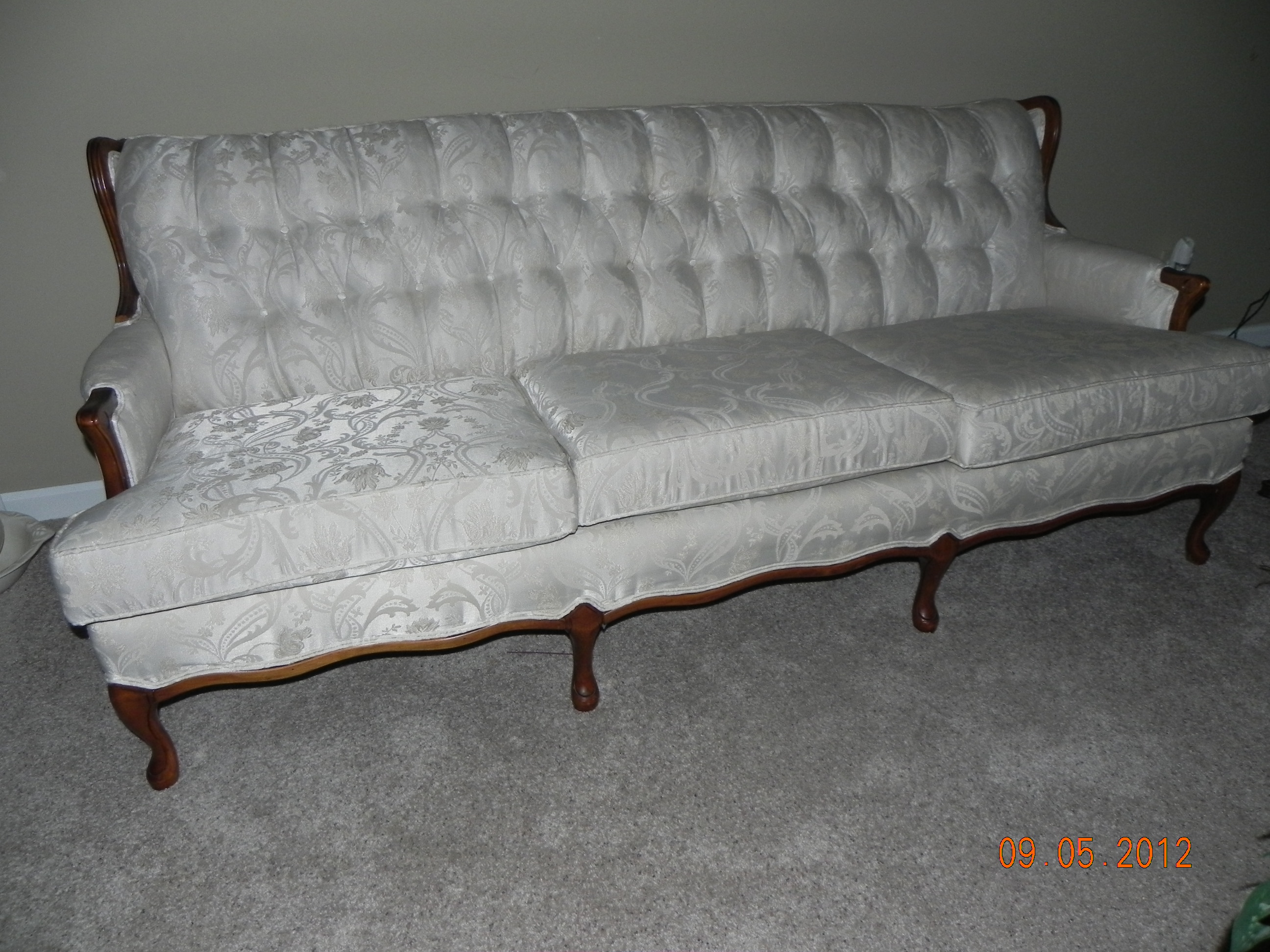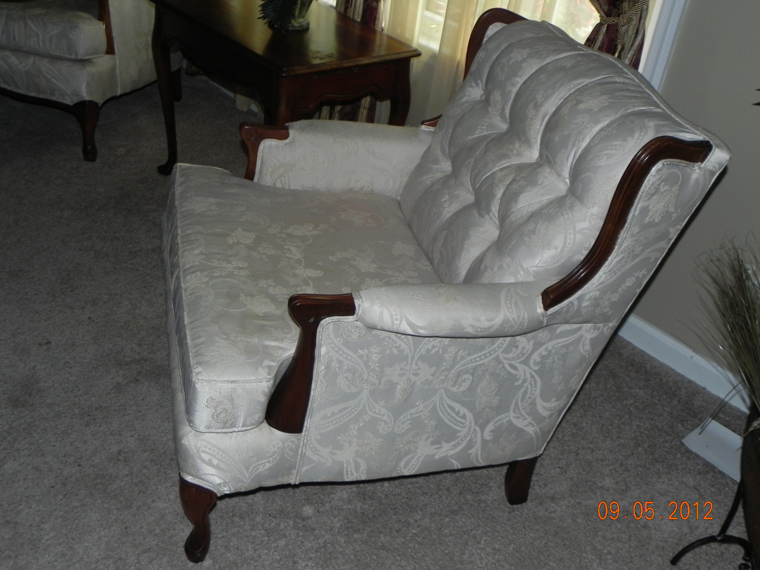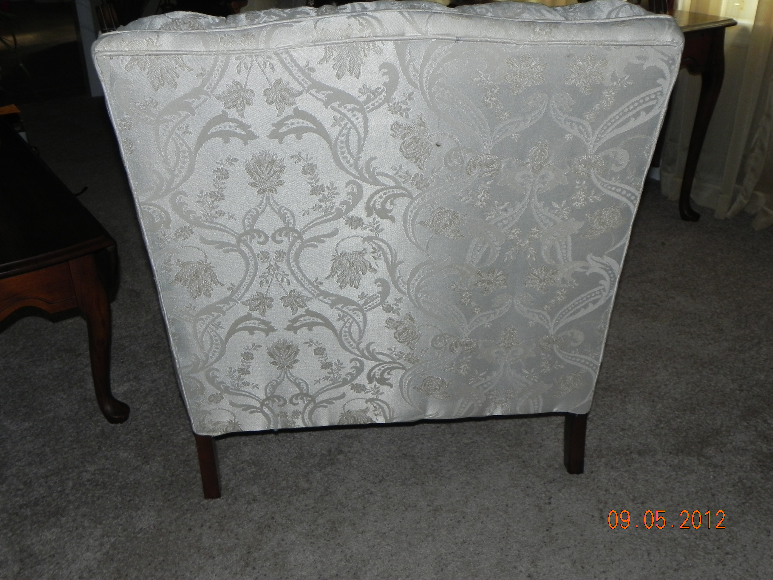 furniture set is covered in the original white fabric with a silver print pattern (as seen in photos). The trim is a smooth dark colored wood as are the tables. Would appreciate an idea on any history of the pieces and value. Please see the photos.
