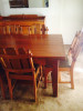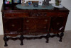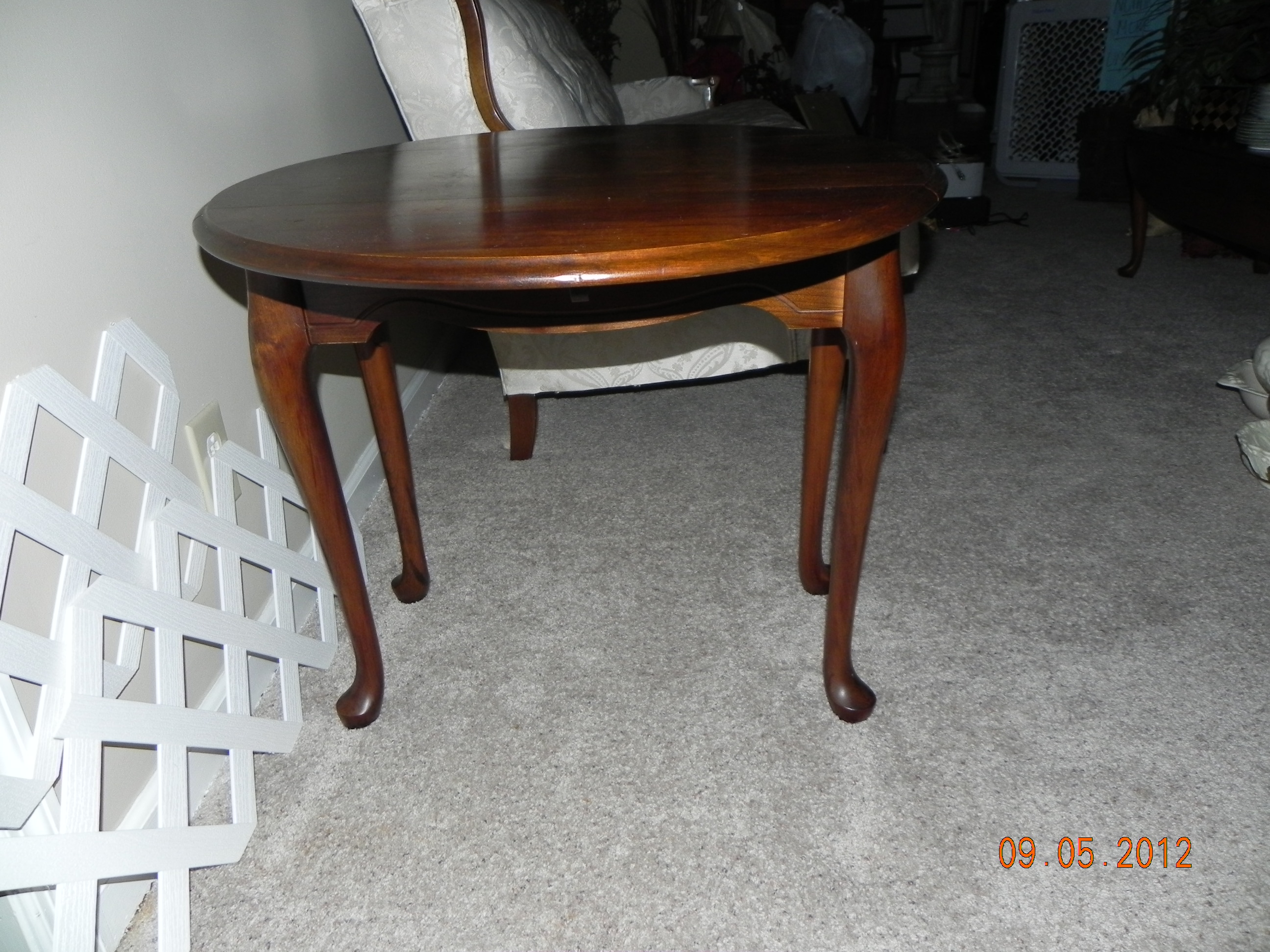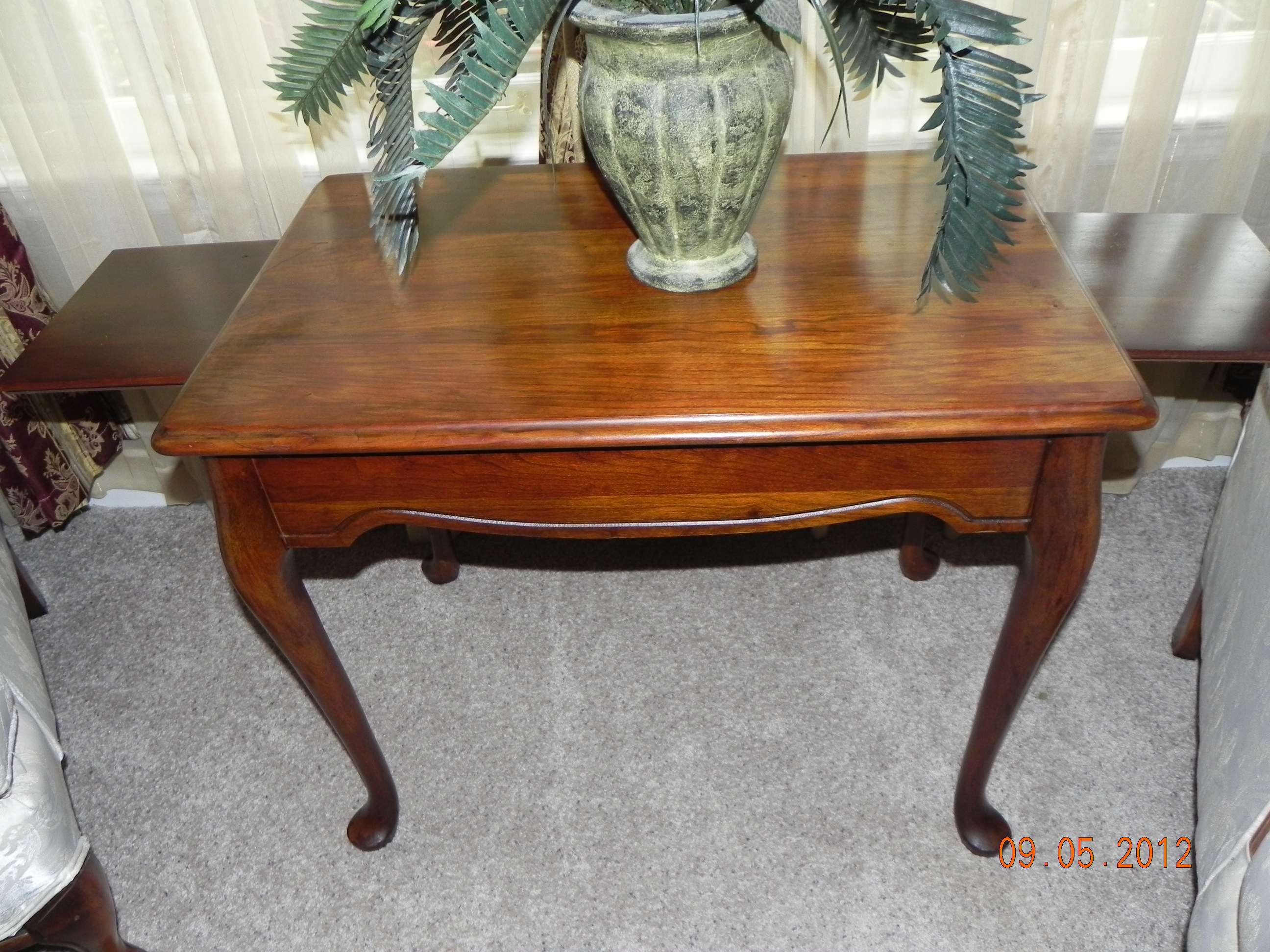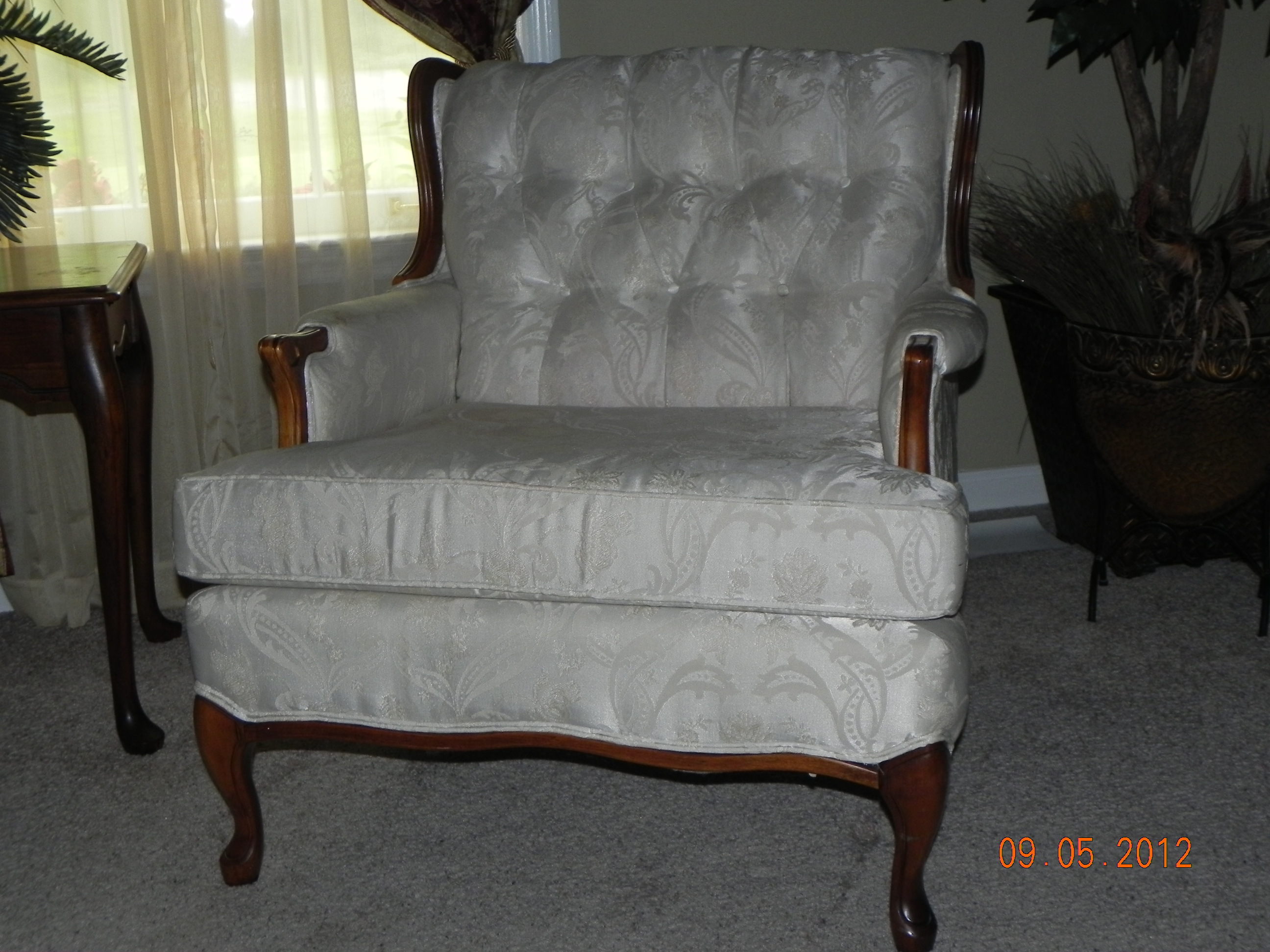 furniture set is covered in the original white fabric with a silver print pattern (as seen in photos). The trim is a smooth dark colored wood as are the tables. Would appreciate an idea on any history of the pieces and value. Please see the photos.