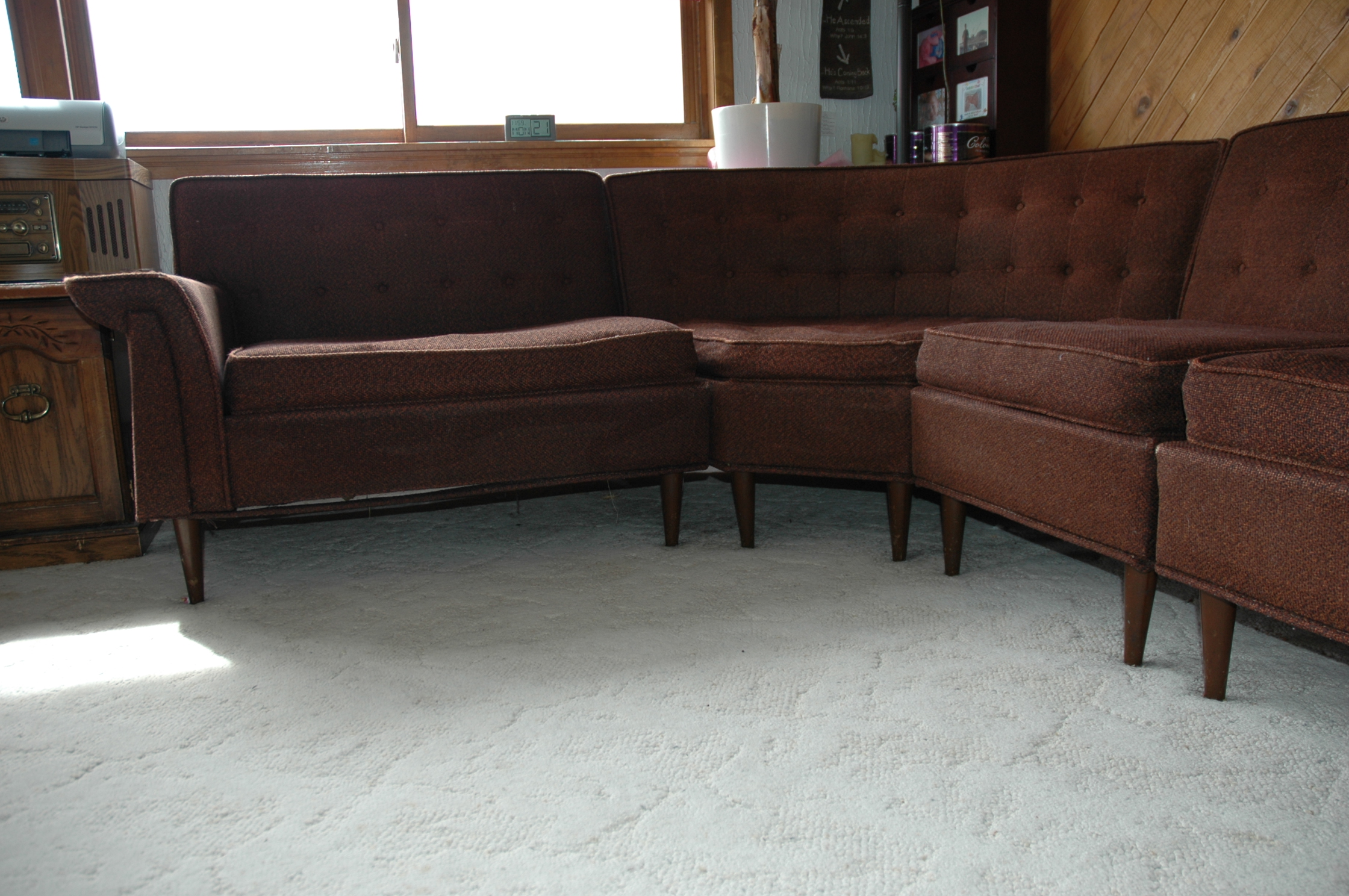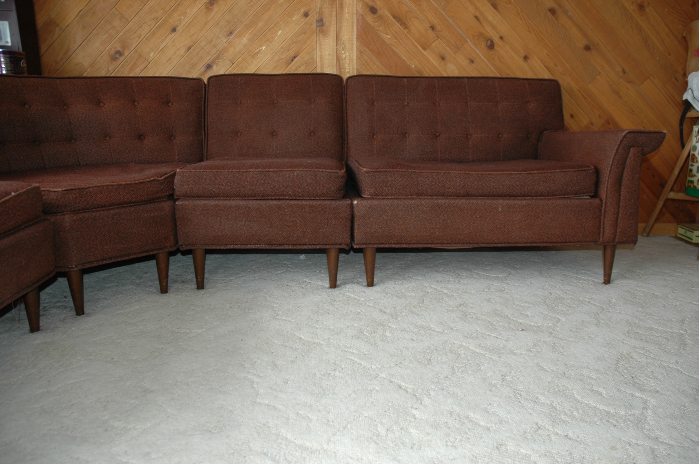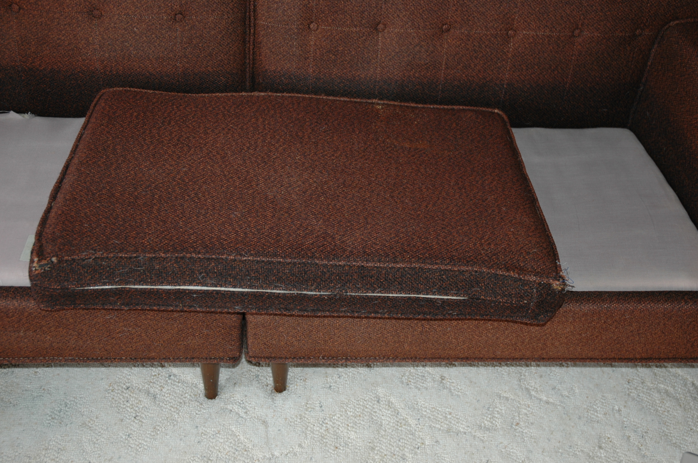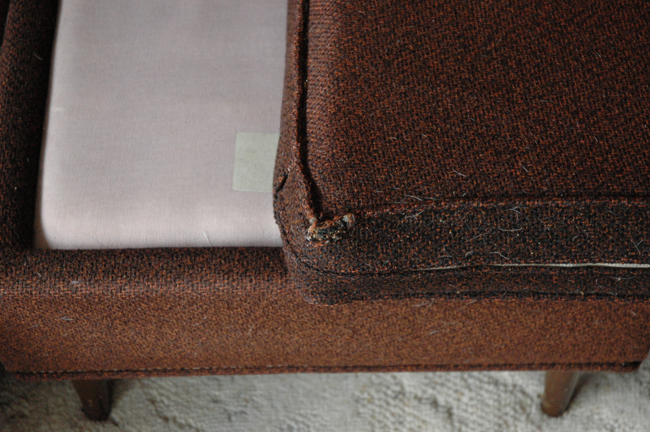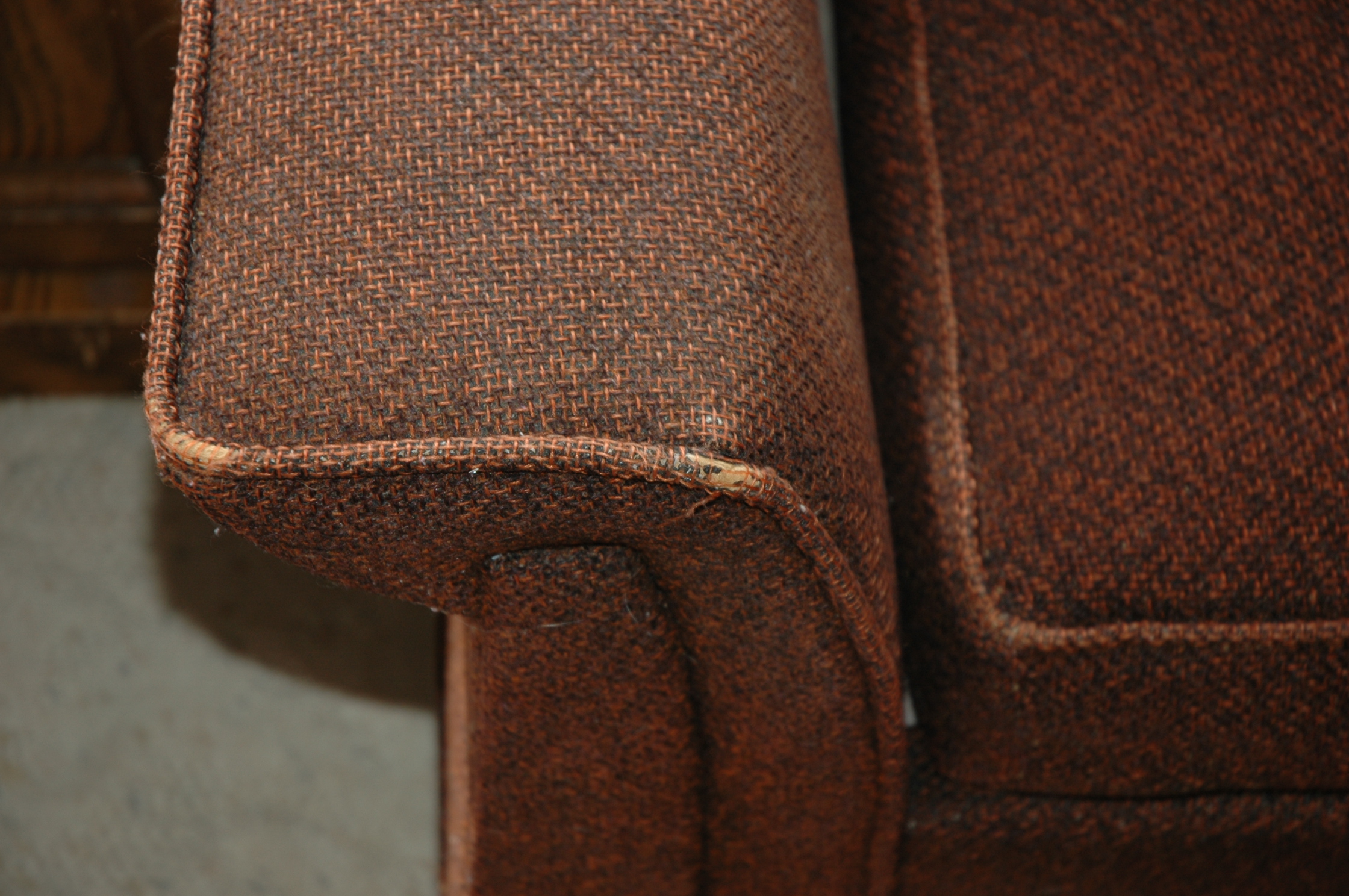 Notice how the upholstery is done, it is original and very much intact. There are some minor imperfections- some wear on the edges of the arms, and corners of the couches from rubbing (either against wall, other pieces, or from sitting).
