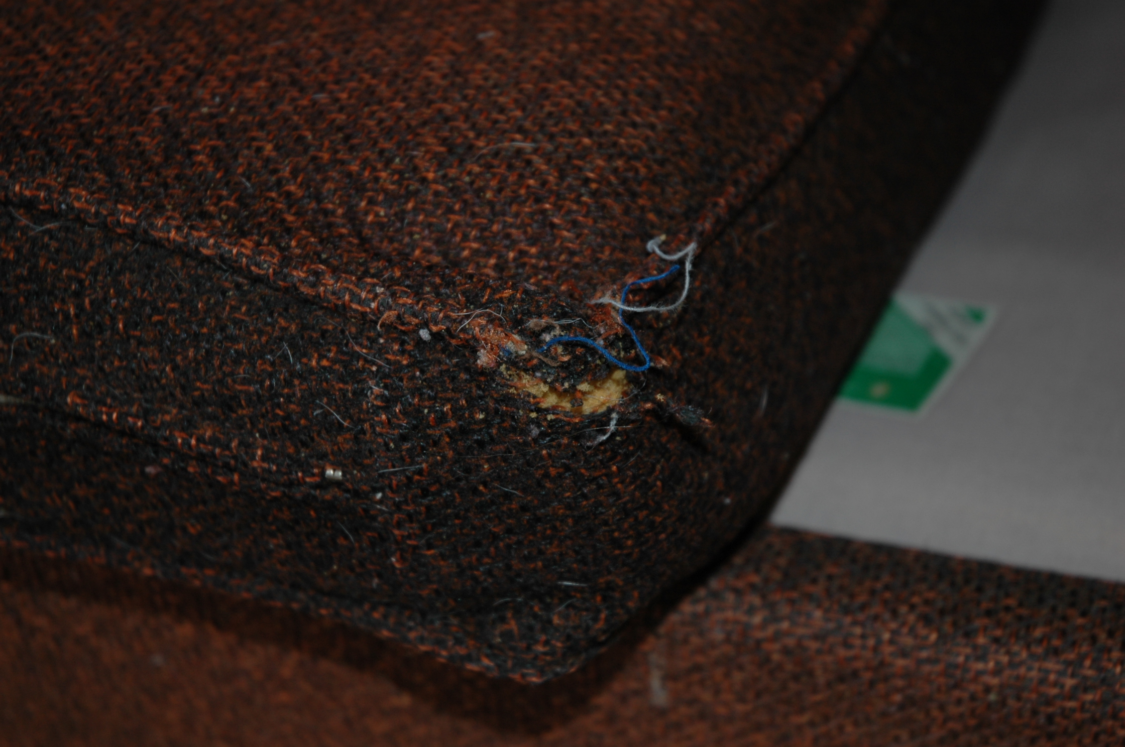 One Large cusion was nibbled on by our puppy on the corners at the back side (zipper side) of the cushion (Not visible with cusionposition with zipper at the rear). Some of the muslin covering hasgiven way under the cusions that covers over the springs and padding (NOT visible with cusions on). The cusions could use refilling as the foam is beginning to breakdown from age/use (A simple project for someone who has the time, as the original seat covers are in good shape)