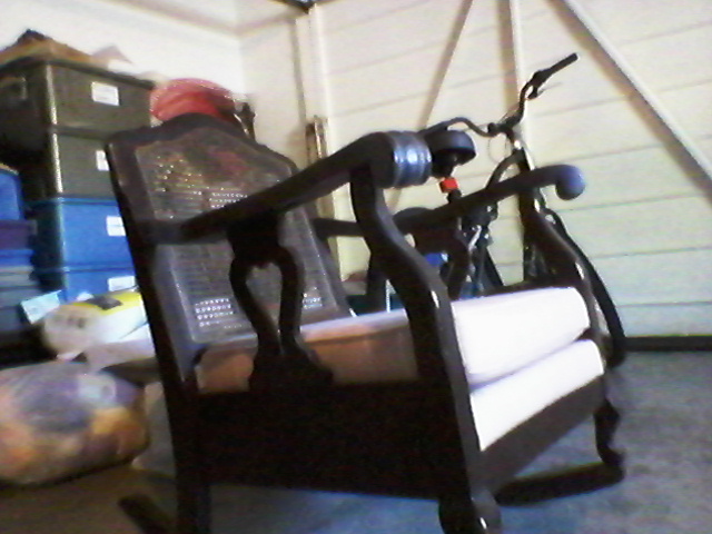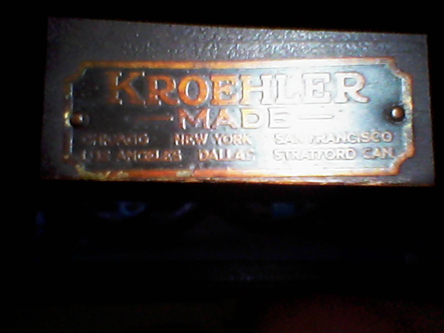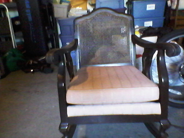 Wooden rocking chair with wicker back, metal kroehler name plate on back states Kroehler made, chicago, new york, san francisco, los angeles, dallas, stratford can.