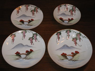 10", 7 1/2", 6 1/2" plates - 7 3/4, 5 1/2 bowls, 4" cup, 16x 10 1/2, 12x8 platters, 8 1/2 Dia. cov bowl, 11x 7 1/2 oblong bowl , 7" dia. 4"h teapot, 4" dia. 4" h creamer, 5" dia. 4"h sugar bowl