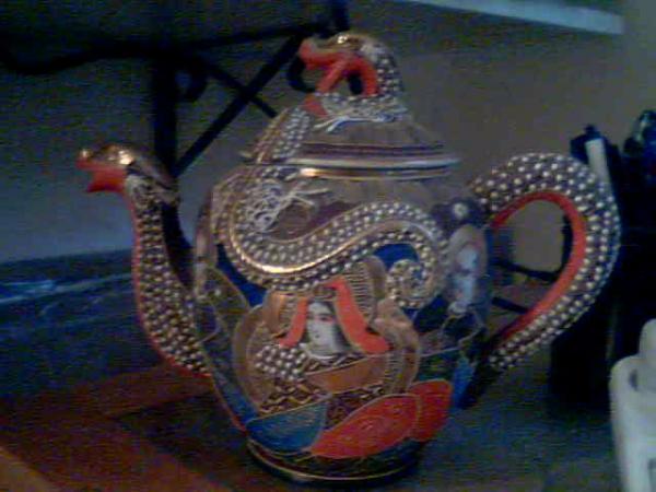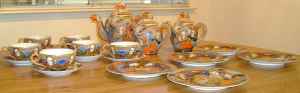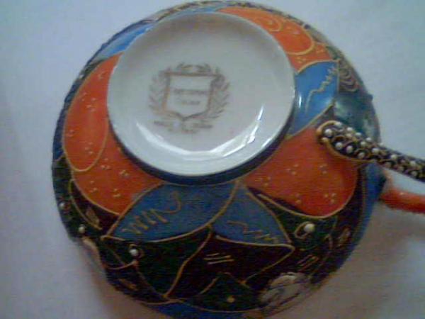 There are 5 plates, 6 cups and saucers, one teapot, a sugar and creamer. Colors are vibrant and include, brown, gold, orange, beautiful blues, green and raised white dots. Plates, saucers and cups rimmed too in gold. Cups are bone china and almost a paperweight. The set looks liek much of the satsuma I've seen but it's Kutani. My neighbor is Japanese and she said it's unusual to see Kutani china with depictions of men on them. This set, I was told, was bought in Japan in the 1950s. The colors are stronger in the upside down cup pic and teapot pic and much closer to the actually colors. Too much light in the other pics.