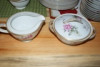 Kyoto china service for 8. The set is white with a metallic gold pattern that is very intricate. Includes 8 dinner plates, 8 salad plates, 8 dessert plates, 8 soup bowls, 8 dessert bowls, 8 teacups (1 with broken handle), 8 saucers (1 with chip), 1 large serving bowl, 1 sugar bowl. This was my grandmother's china and it is about 100 years old.
