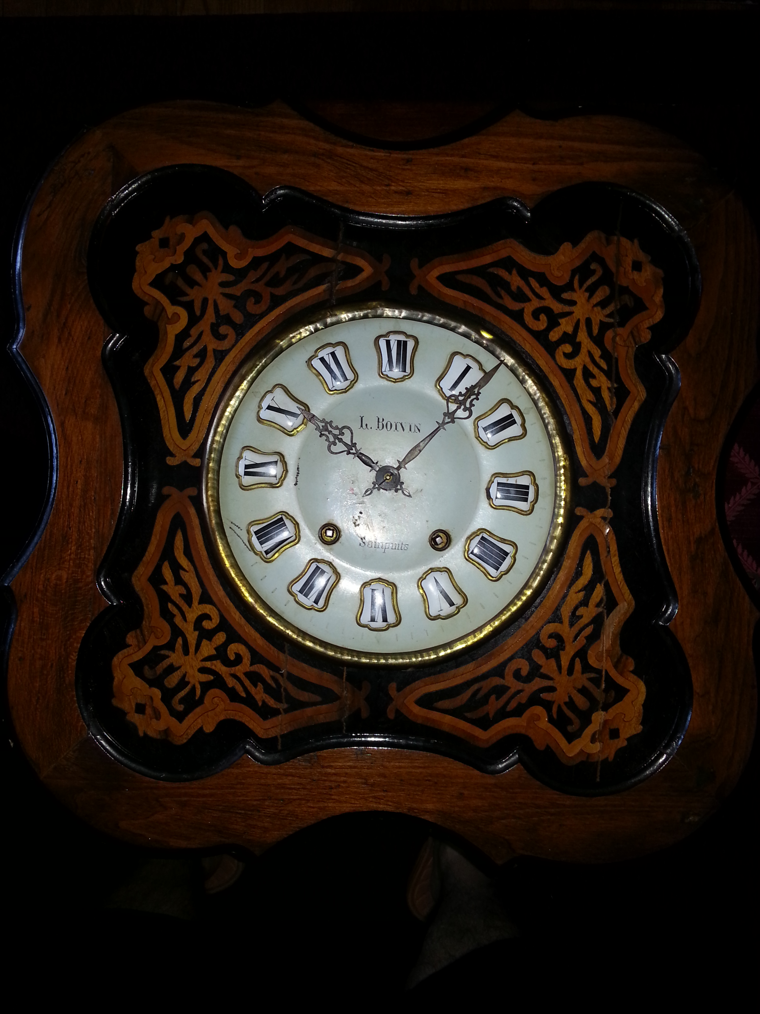 Below the 12 say's "L.Boivin" and above the 6 "Sainpuits". Since my wife and I enjoy Burgundy, we surmised it was from the town of Sainpuits but cannot find any record of this clock maker.