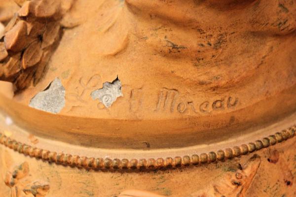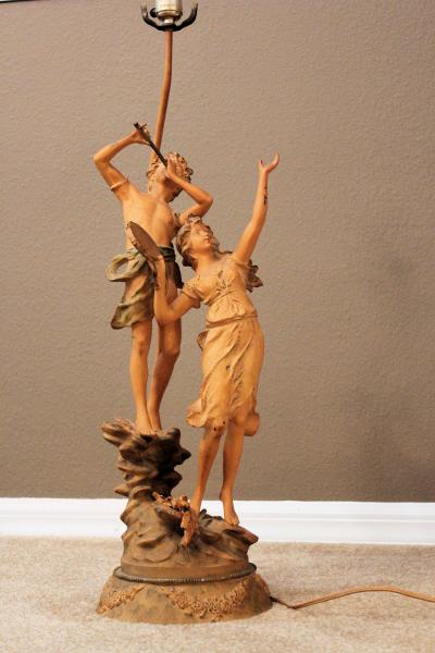 L & F Moreau staute/lamp in good/fair condition. This lamp was kept wrapped in a thick blanket in my husband's grandmother's closet for years, it was very important to her, but we are unsure of it's value. It was well kept but has chipping in the paint at various locations. I believe it traveled to the U.S. from Germany with her. I don't know much about the lamp other than that and value on the internet is hard to distinguish. Thank you for you time.
