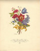 Print is of a beautiful bouquet of lilac, red rose blue tulip rwed& gold carnation with a gold ribbon holding the flowers together.