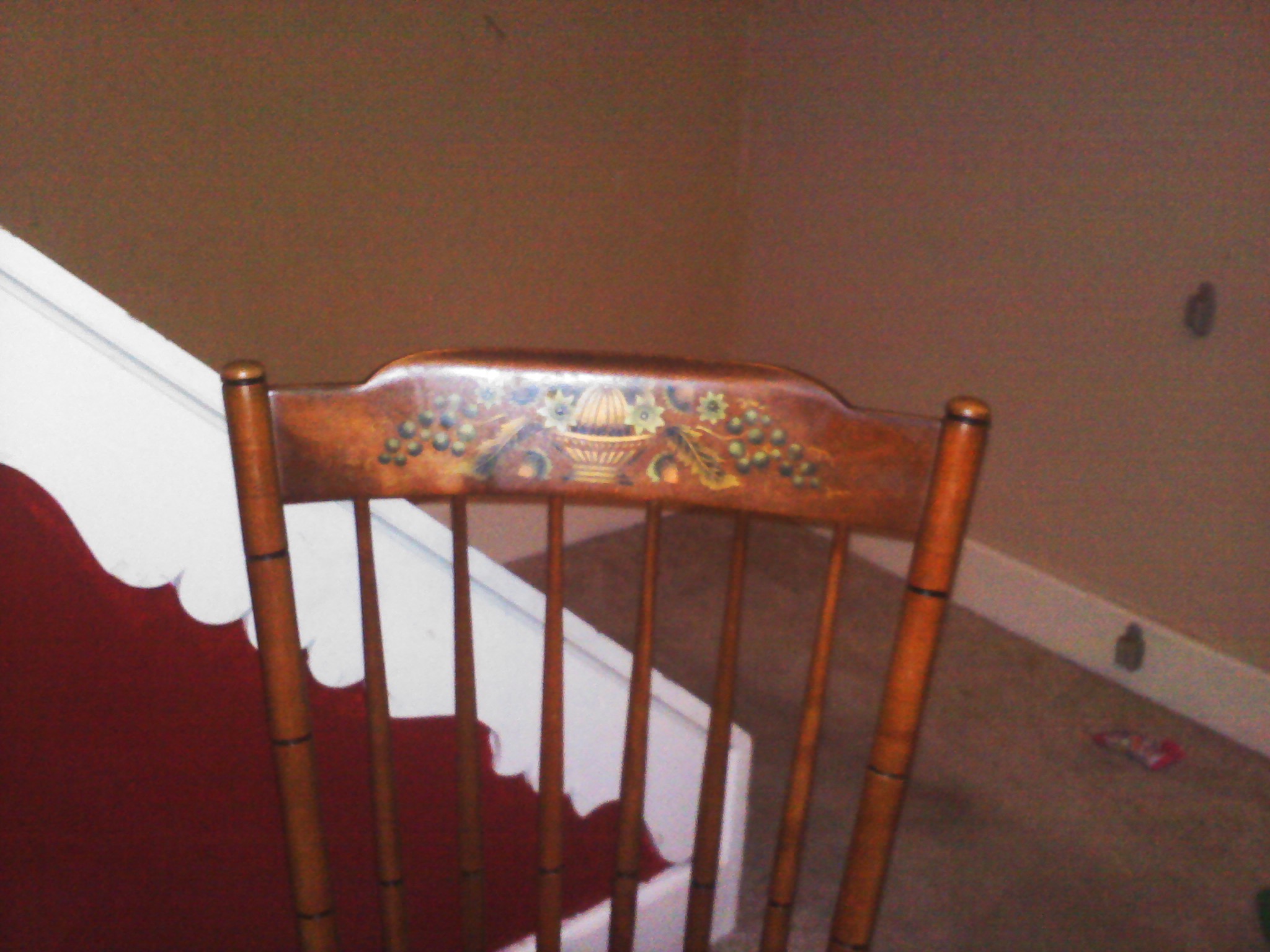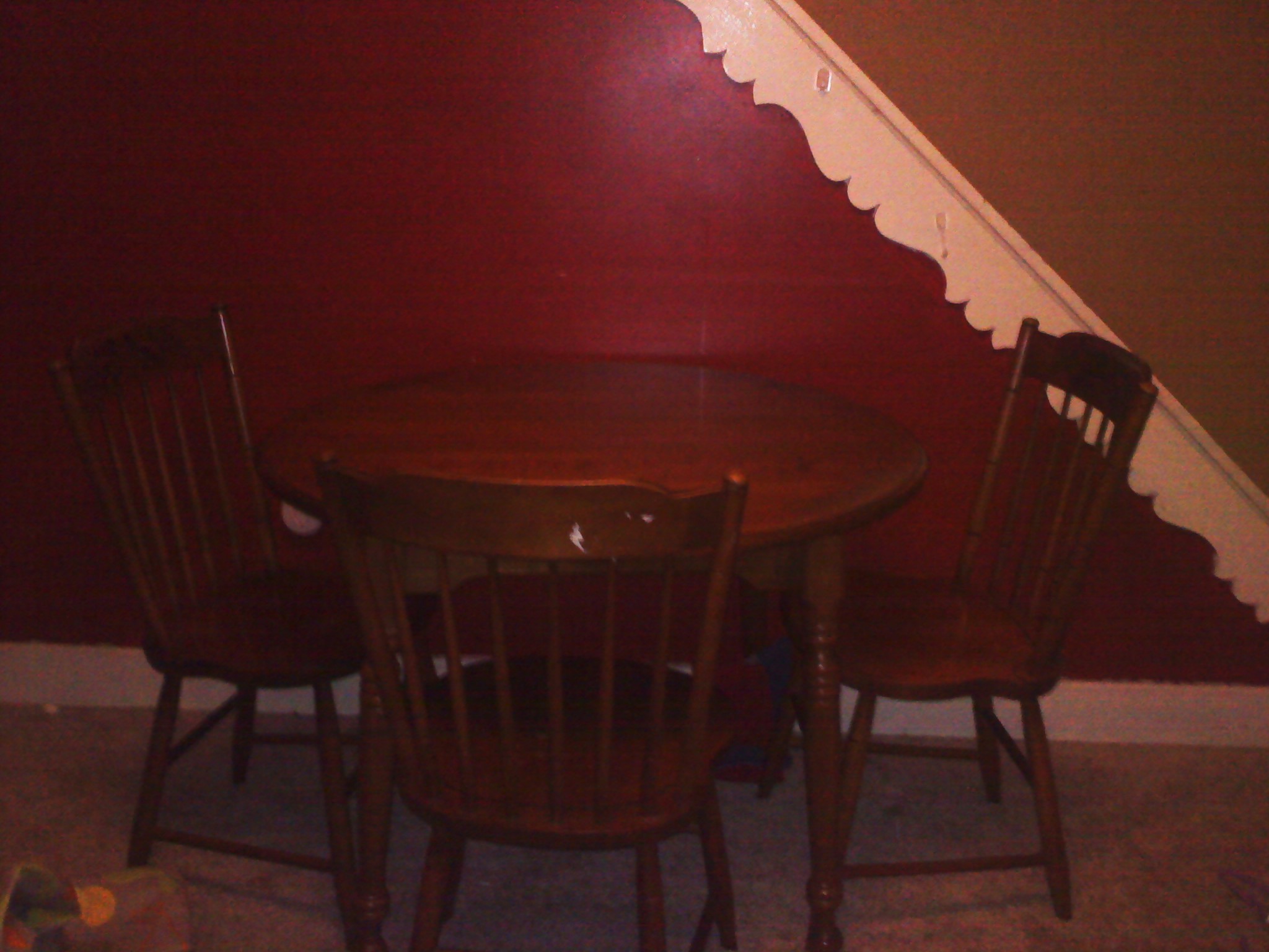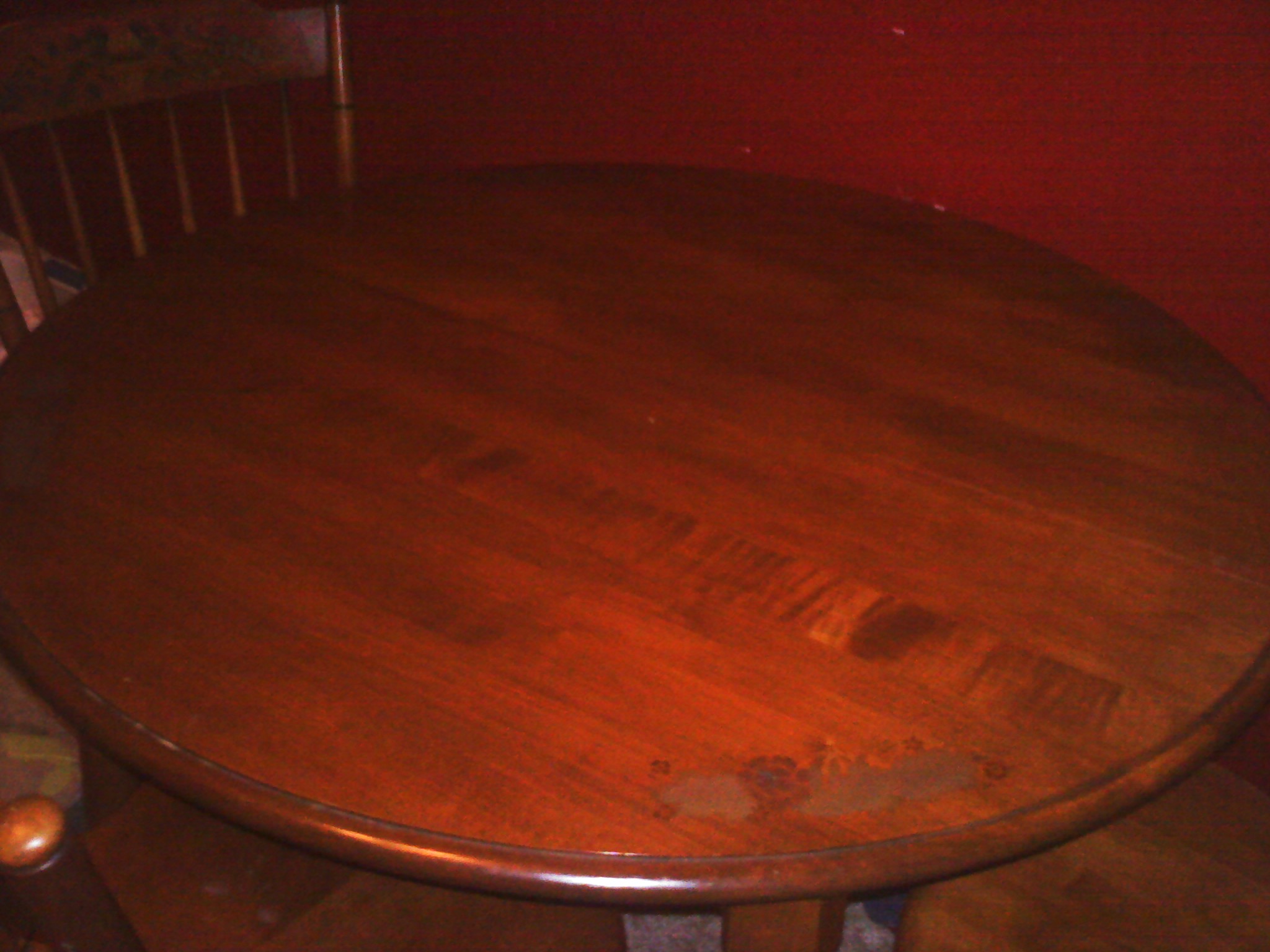 This Table and chair set was left in the house by our great aunt and we believe she bought it in the early 50's or 60's. it is in excellent condition and has the fruit motif on the table and chairs. we also have a leaf to make the table bigger and the protective coverings which are on it now. we have 2 children and we dont really use the table. the protective coverings are always on it so it never gets appreciated for what it really is.