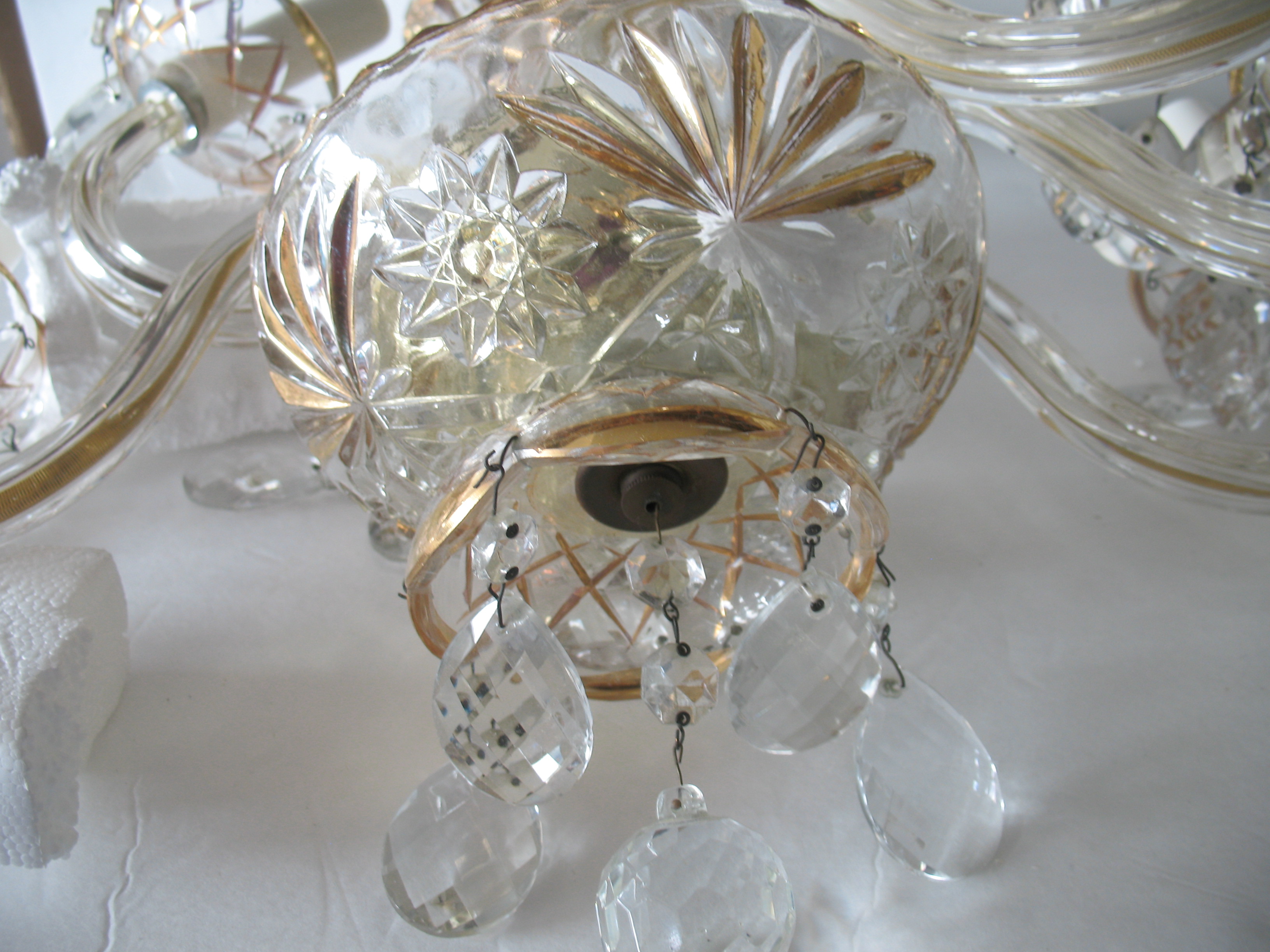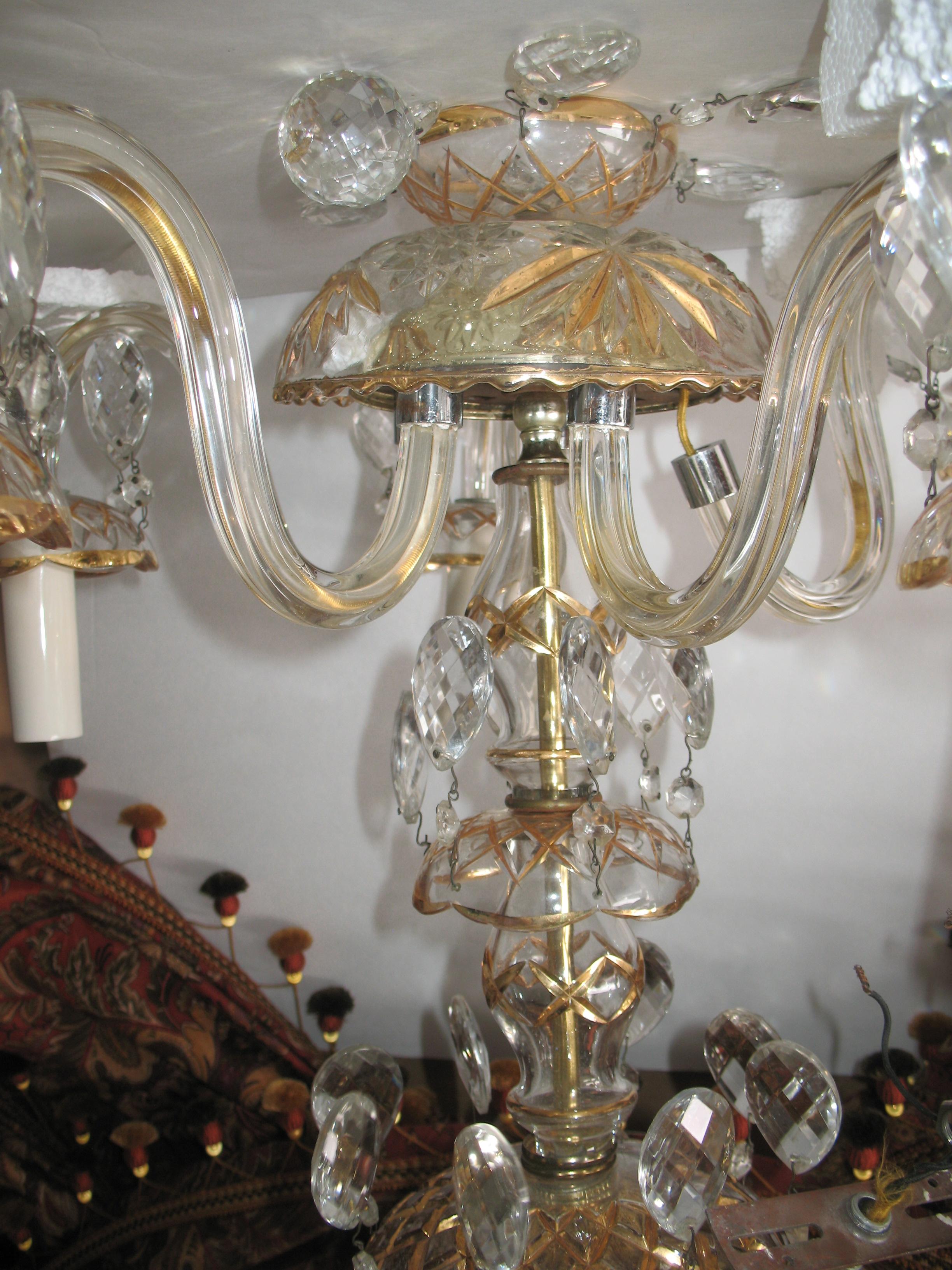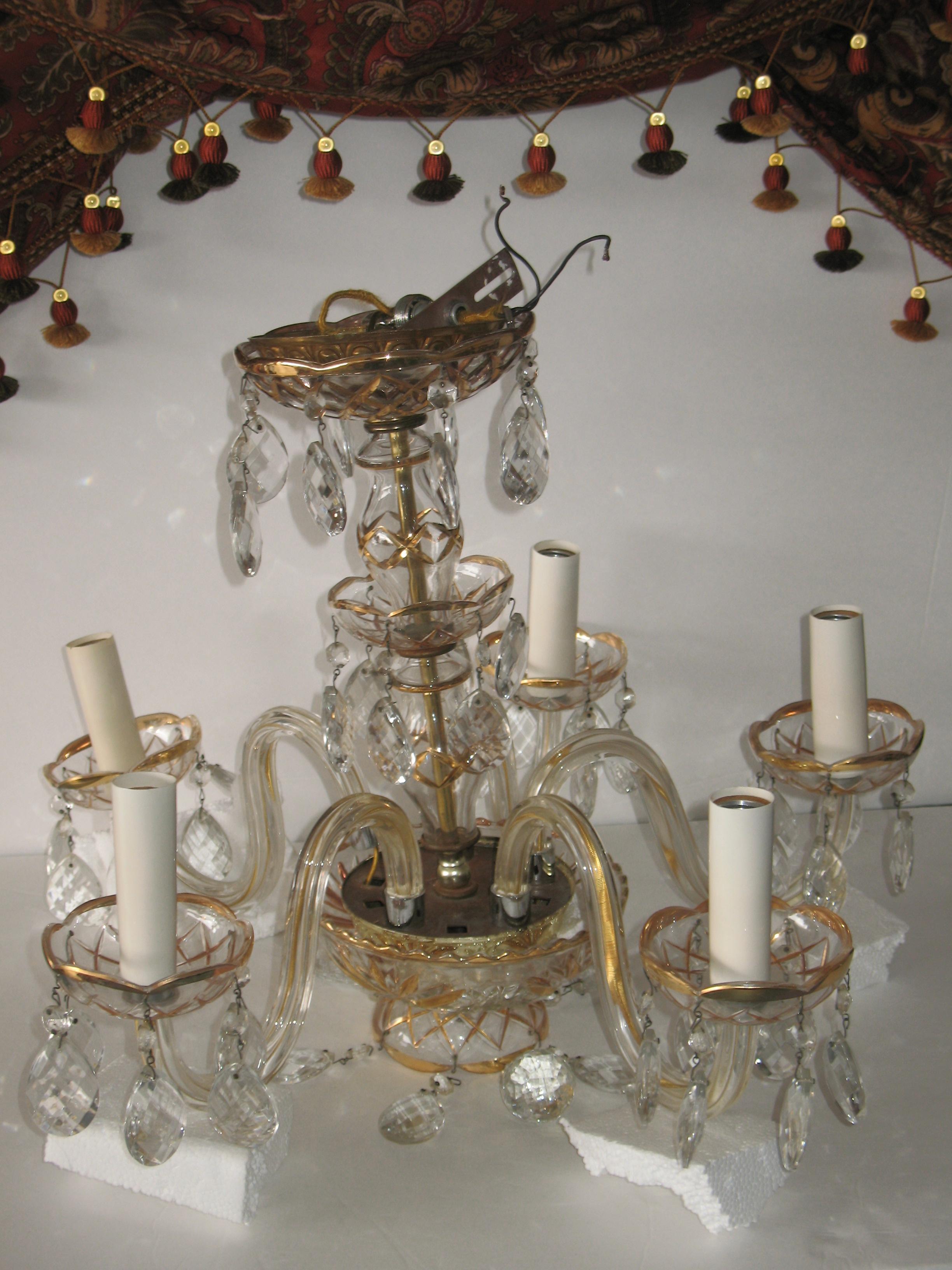 Please let me know what your estimated appraisel is for this crystal chandlier with gold etched class. I havent found anything online that looks like this one. Need to know estimated age, year, crystal or glass and of course price, style or pattern.