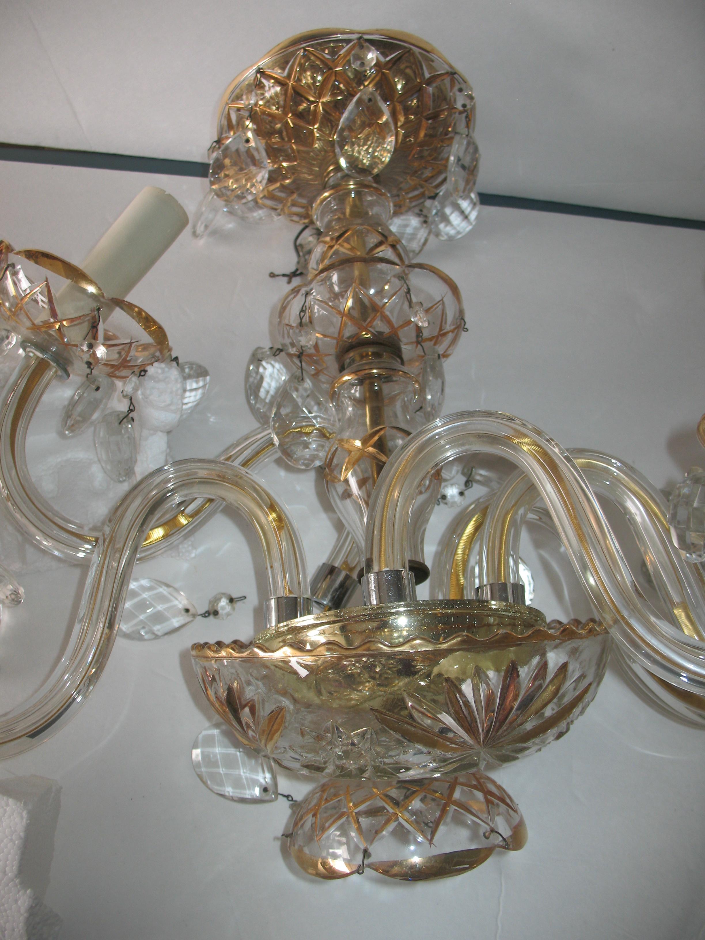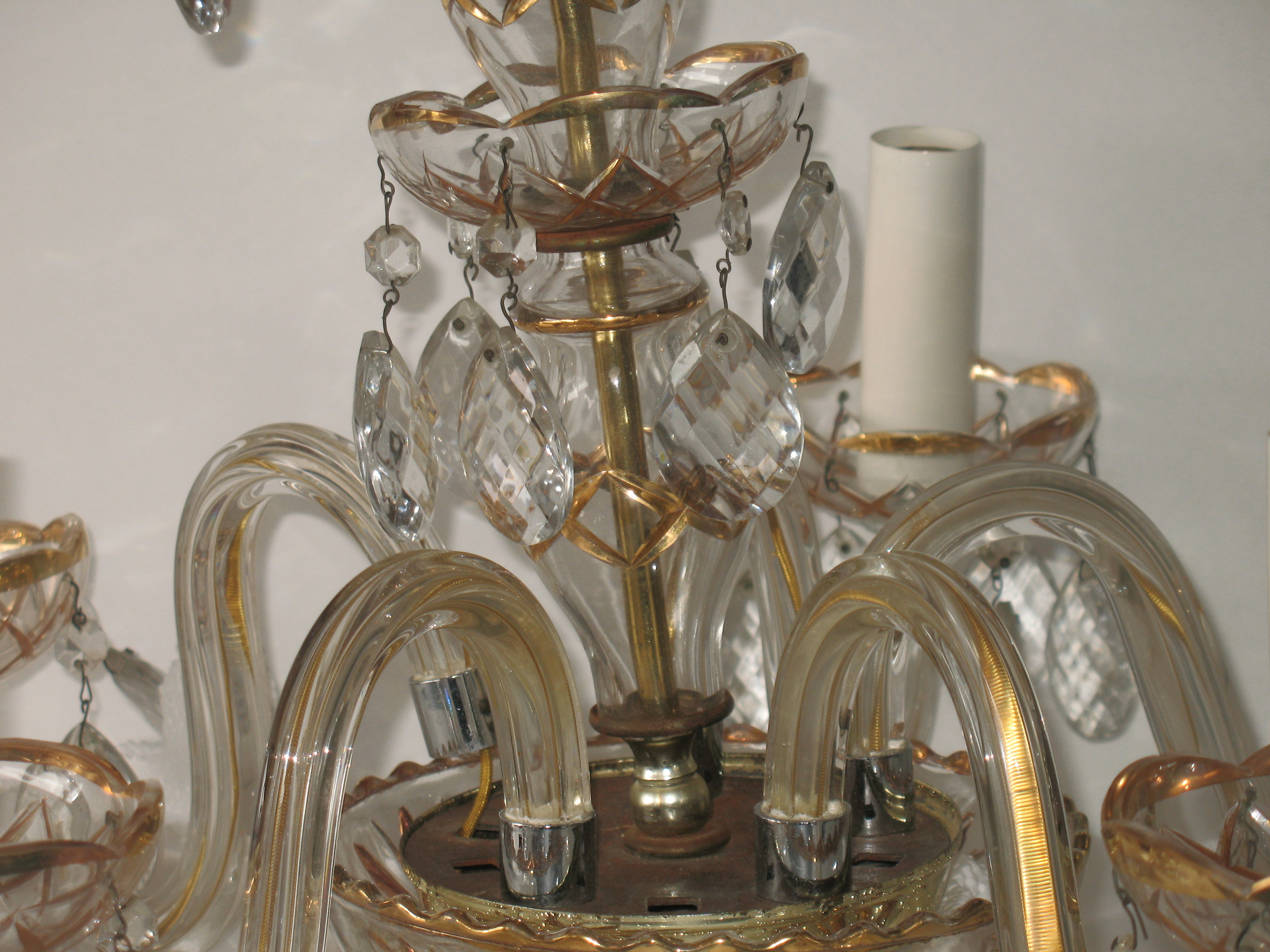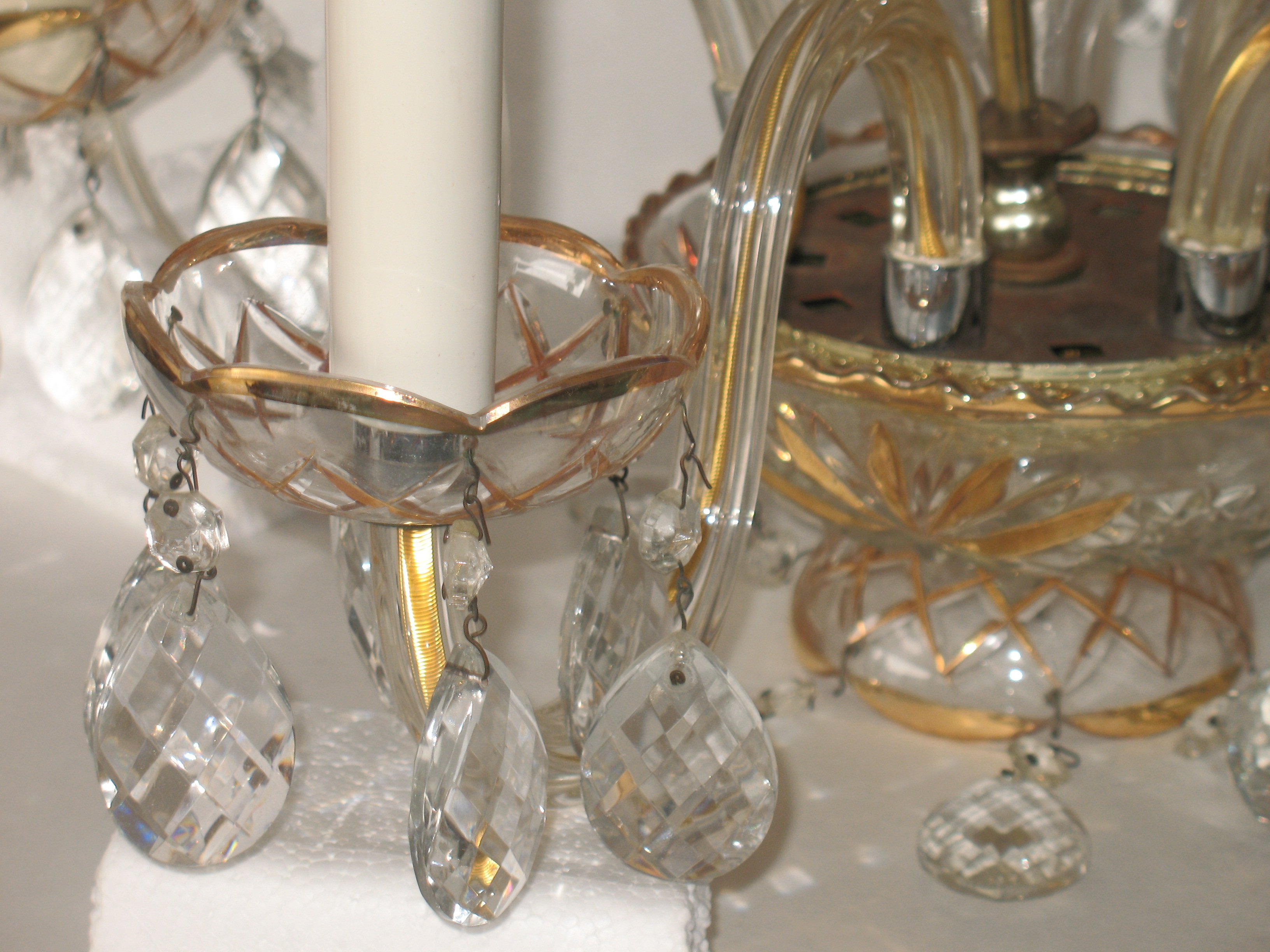 Please let me know what your estimated appraisel is for this crystal chandlier with gold etched class. I havent found anything online that looks like this one. Need to know estimated age, year, crystal or glass and of course price, style or pattern.
