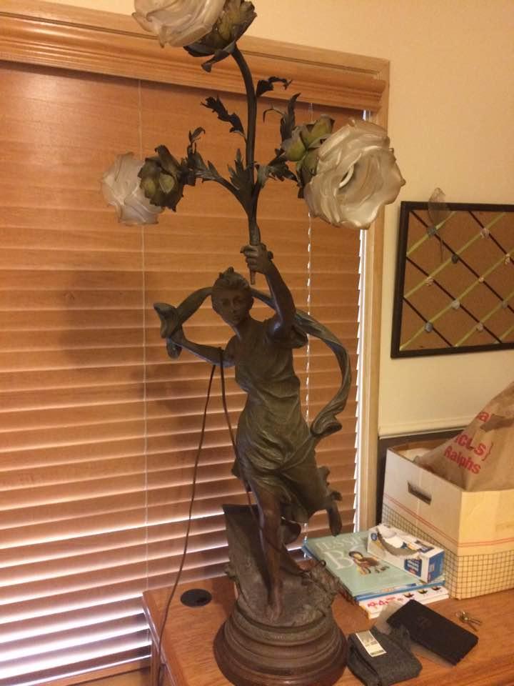 I have seen other lamps and statues by L. Madrassi but not this one. I am not really sure of the overall condition. It is 43 inches tall and 17 inches wide, very heavy with three lights. Any information or price indicators? Thank you
