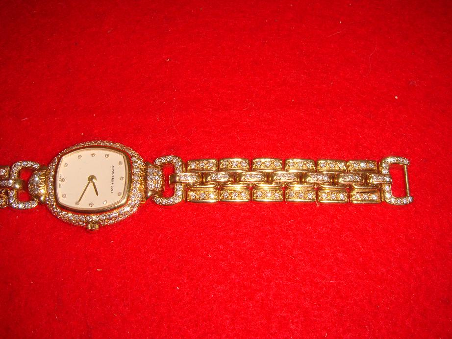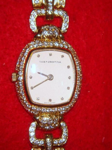 Ladies Audemars Piquet 18K yellow gold watch (Audermarine) with a diamond pave case and bracelet. Approx. weight in diamonds 4 CTW and the diamonds grade G in color VS1 in clarity. Serial number C87898. Watch also has a diamond dial.