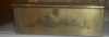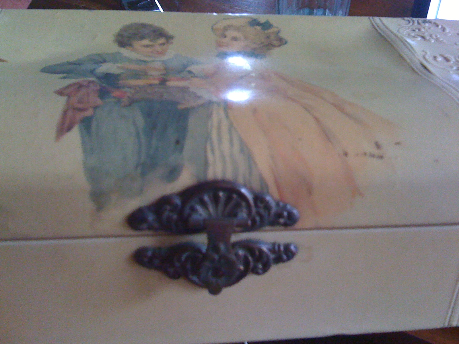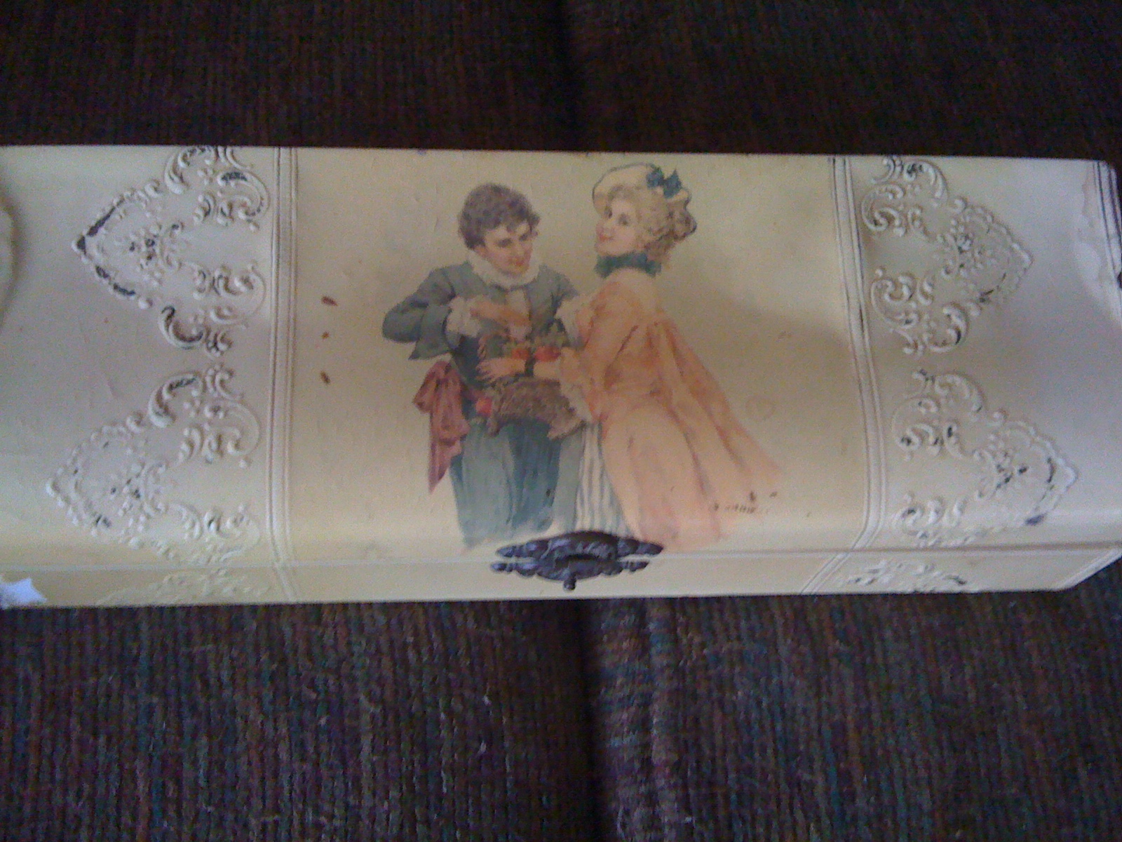 Yellowed box with some type of coating which is peeling up on the edges. The center has a picture of a man dressed in blue, large cuffs on jacket, pants appear to stop just below the knees. Has white shirt with ruffles at cuff and collar. He has some type of scarf tied at waist in a bow on right side. She is wearing a blue and white striped skirt, a yellow jacket that seems to stop at thighs. the sleeve ends in ruffle just past elbow, with white ruffle peeking out from under jacket sleeve. Blue ruffle at neck and blue bow on yellow hat. Basket of flowers in hand.