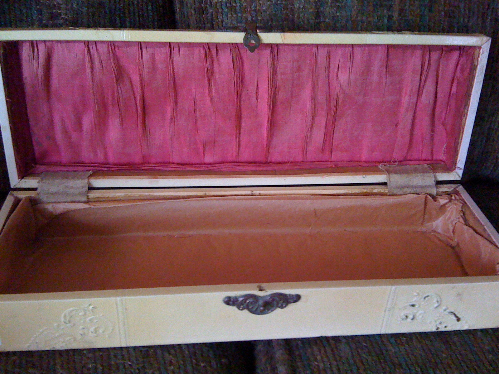 The box itself seems to have cloth hinges, tissue paper lining on bottom with red cloth lining the inside top