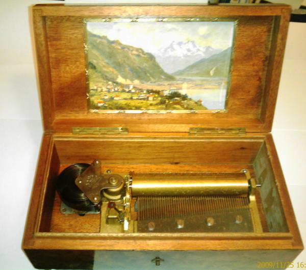 postcard of 'Glion et les Dents du Midi' in Switzerland.Underneath is part of a label listing the 6 tunes the box plays, but the label torn and only part can be read.