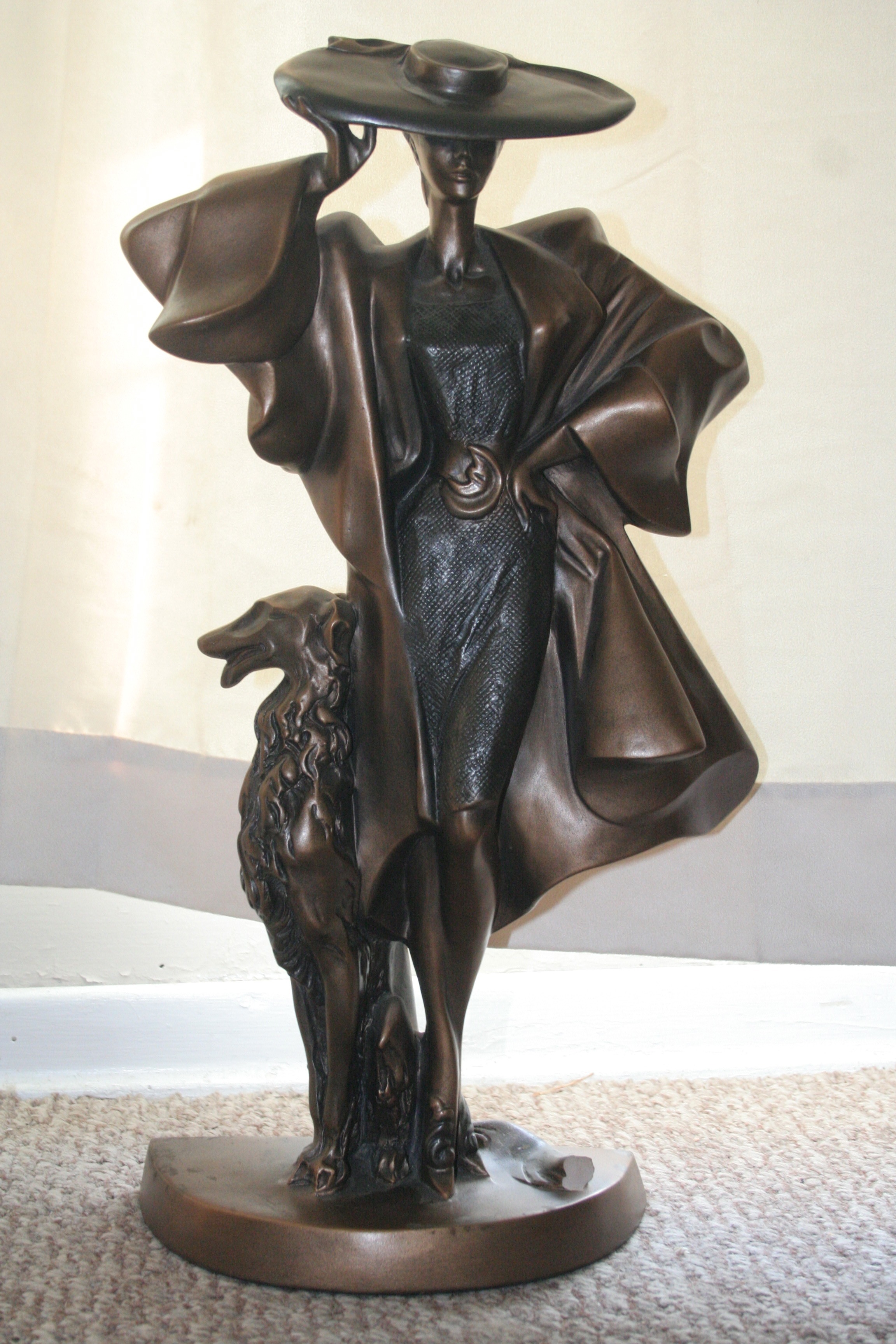 The bottom still has a barcode which reads "fashionable". The peice is bronze in colour but feel to be plaster or ceramic. The figurine is about 11" tall.