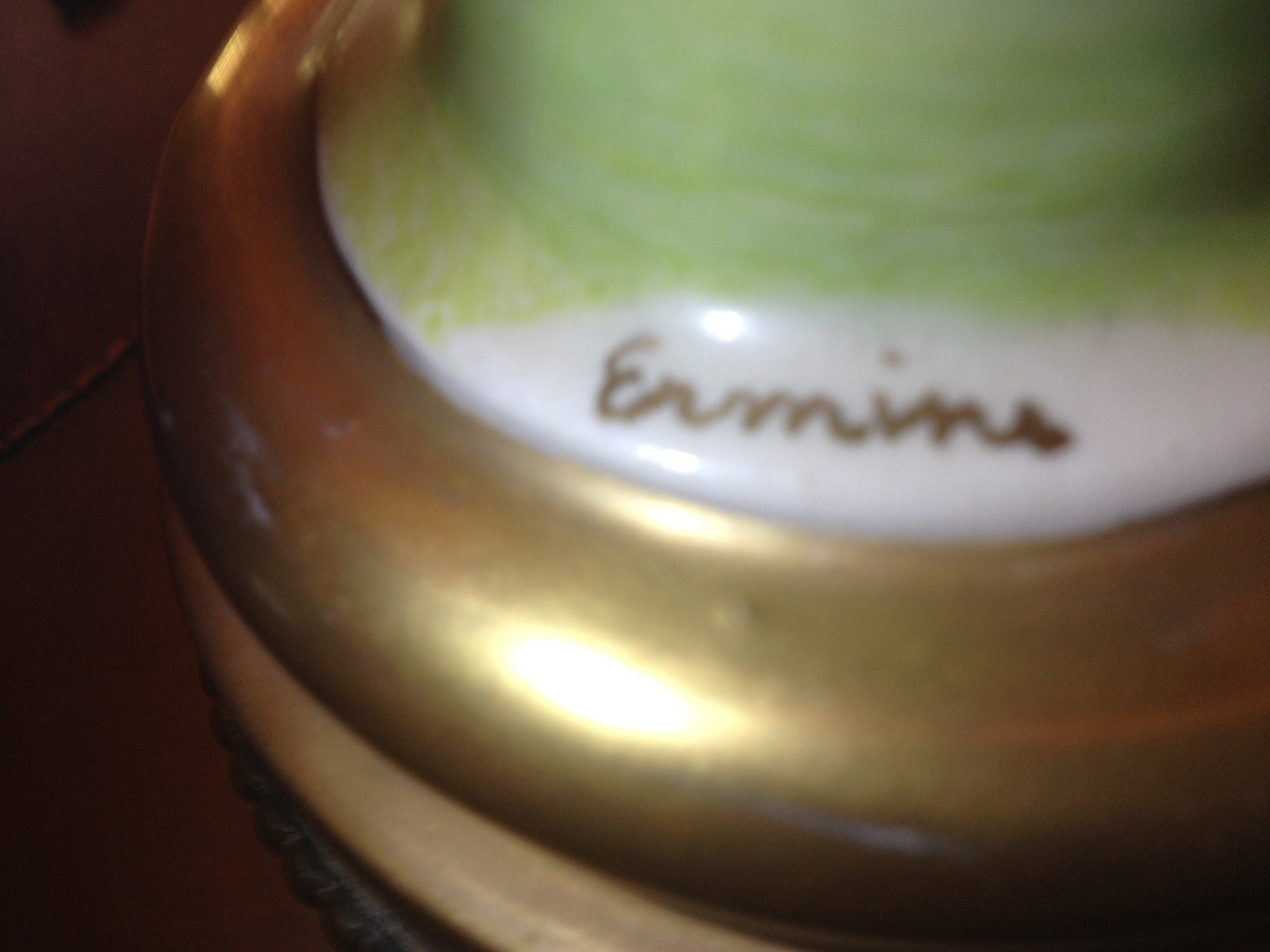 The lamps appear to be ceramic or porcelain. They have a brass looking bottom. They are both signed in gold paint in back of the waist(Ermine)