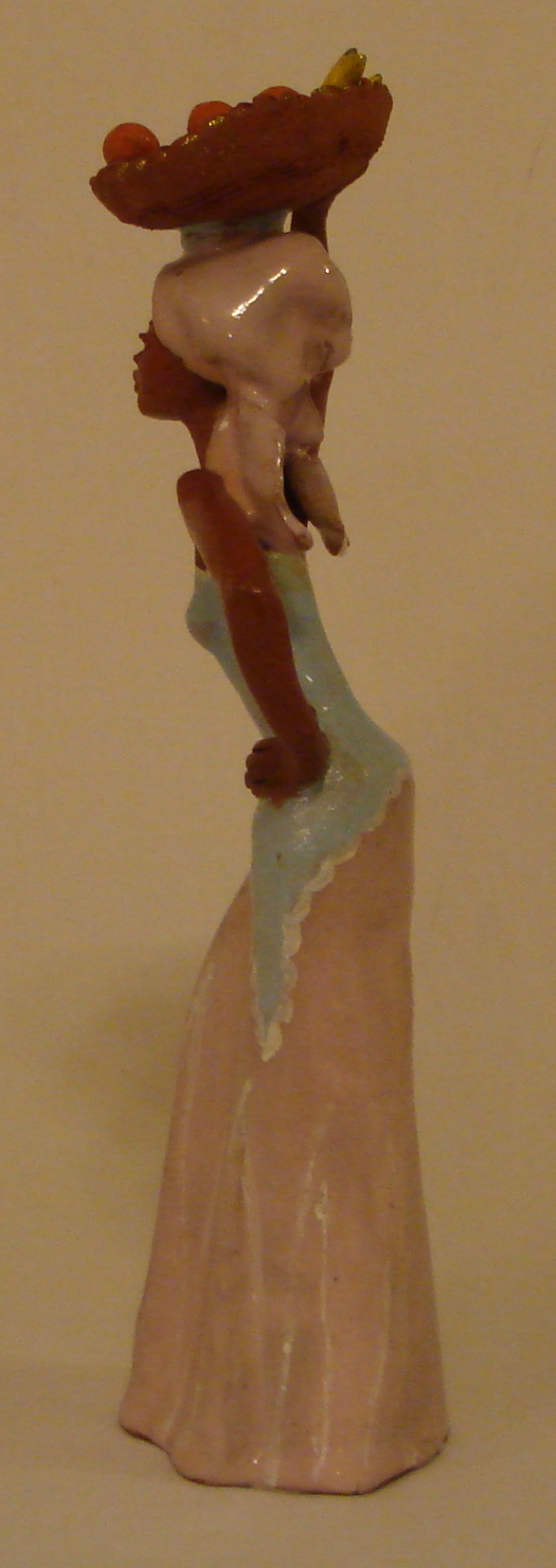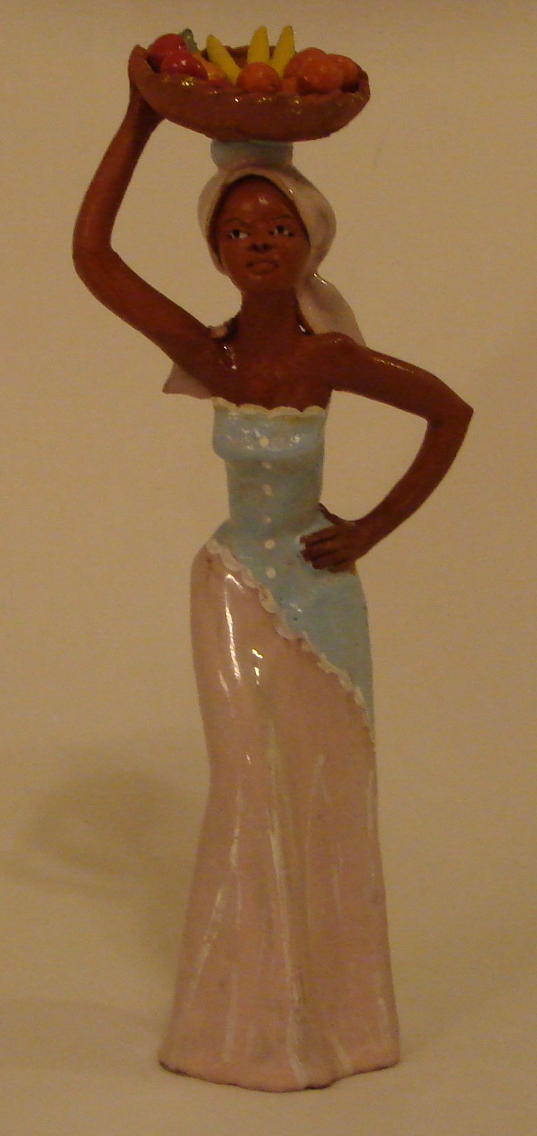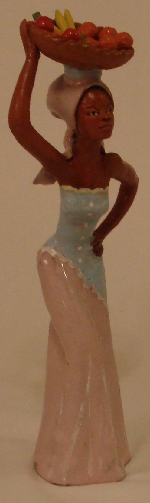 I have seen a similar figurine on ebay described as German pottery - African woman with a fruit basket on her head....
