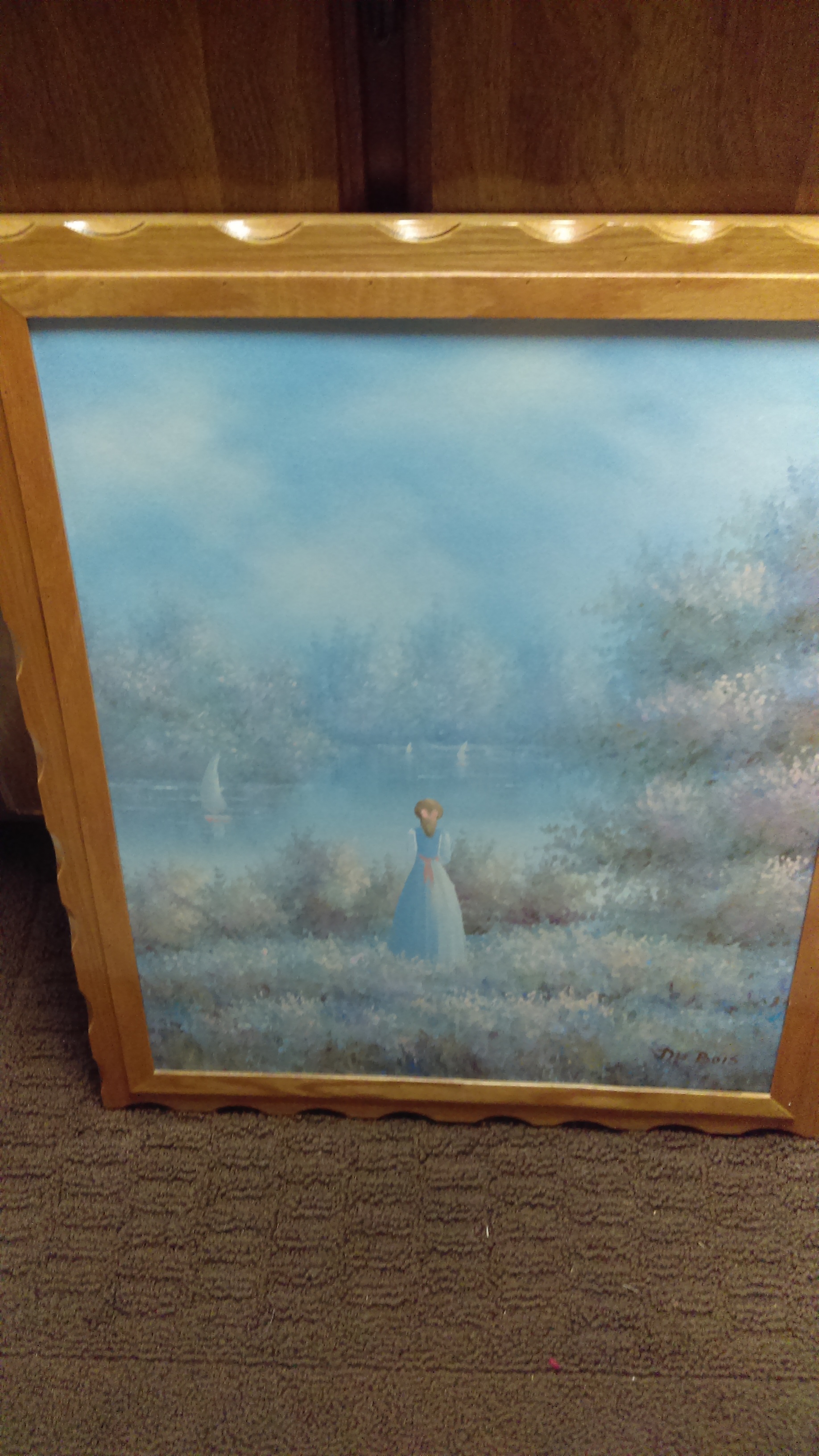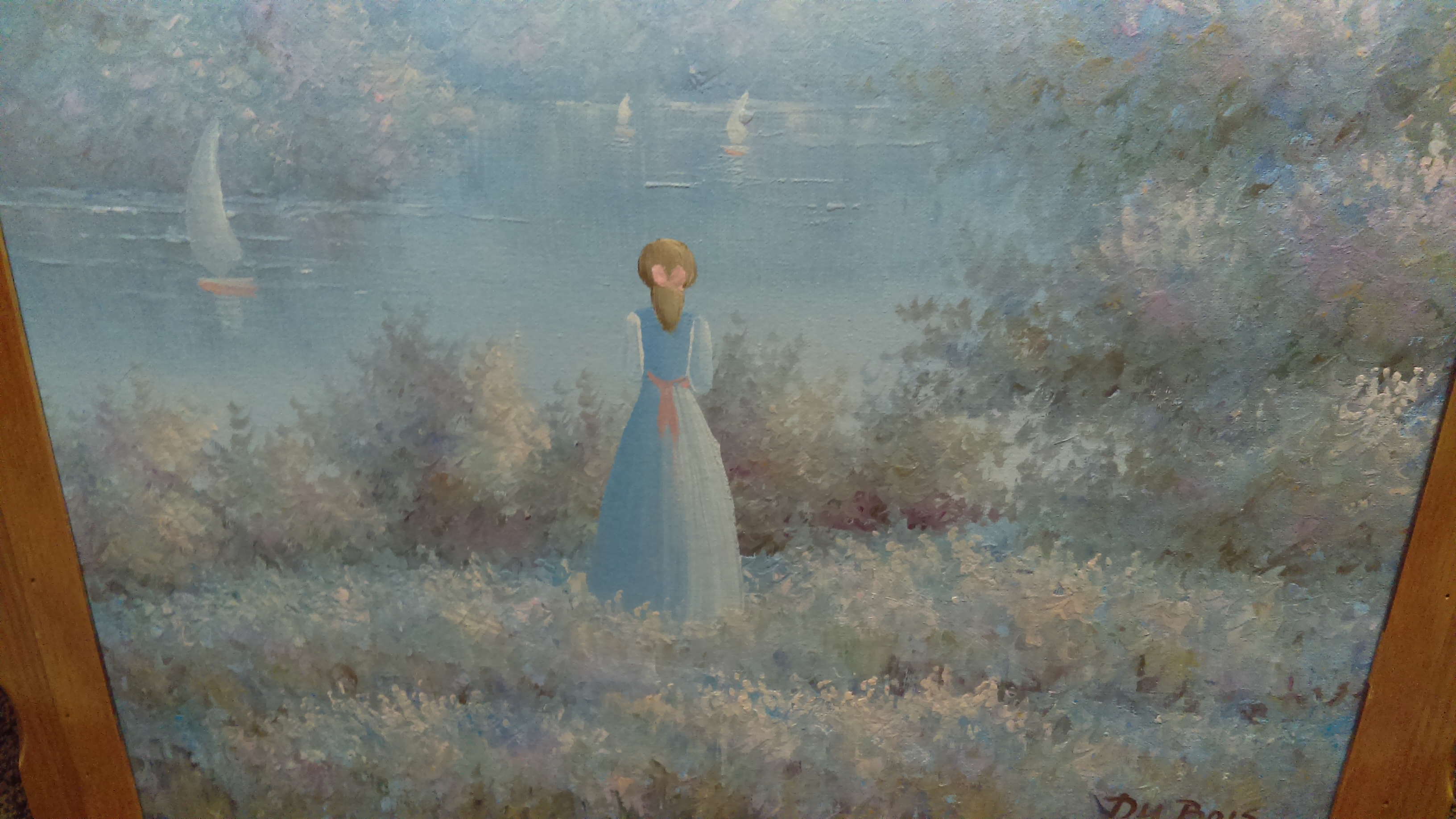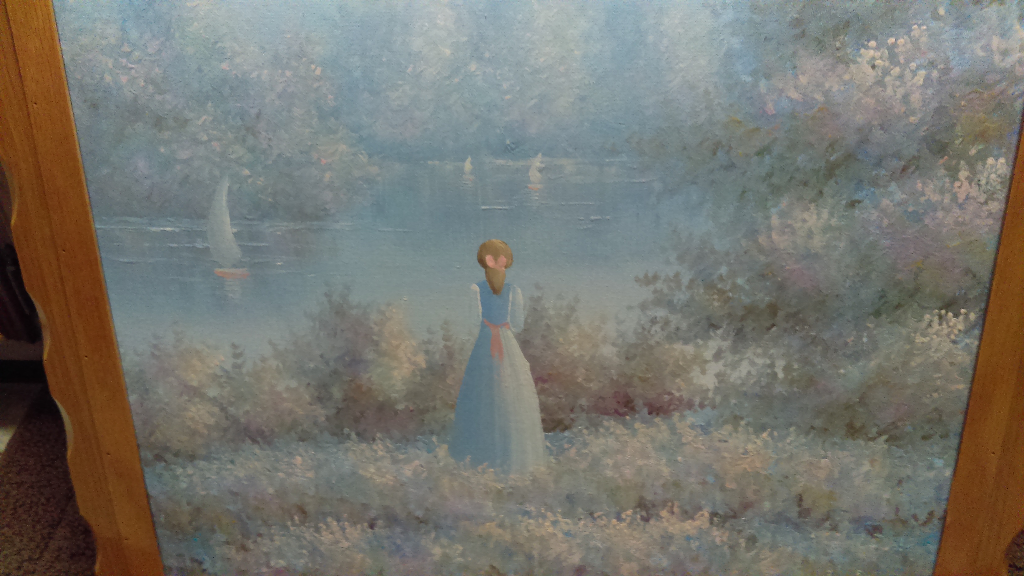 Lady in blue long dress with pink bow on back of dress blonde hair in pony tail with pink bow she is looking out at the lake watching sail boats in field of flowers possibly or pastel grass with trees to the side of her