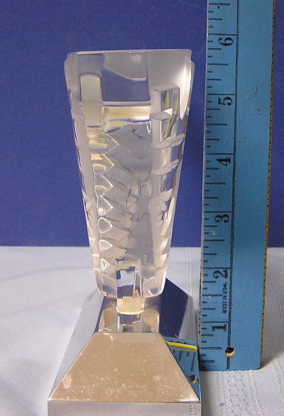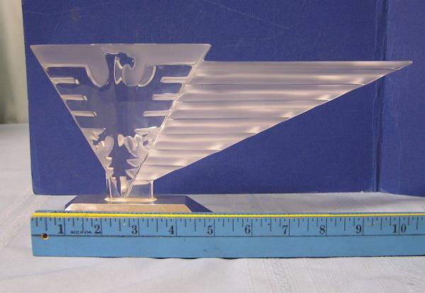 Puchased this Lalique glass sculpture fashioned like a mascot or hood ornament mounted on a chrome or silver plate base. It has an Indian southwestern design with the likeness of a Thunderbird. It has the Lalique France etched signature with the copyright "R" in the middle.