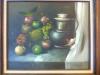 Long mirror black and gold in color with fuit basket on top with leaves and round fruit and grapes. Back tag says Lambert Hitchcock agent chair manufacturer, (CONN)