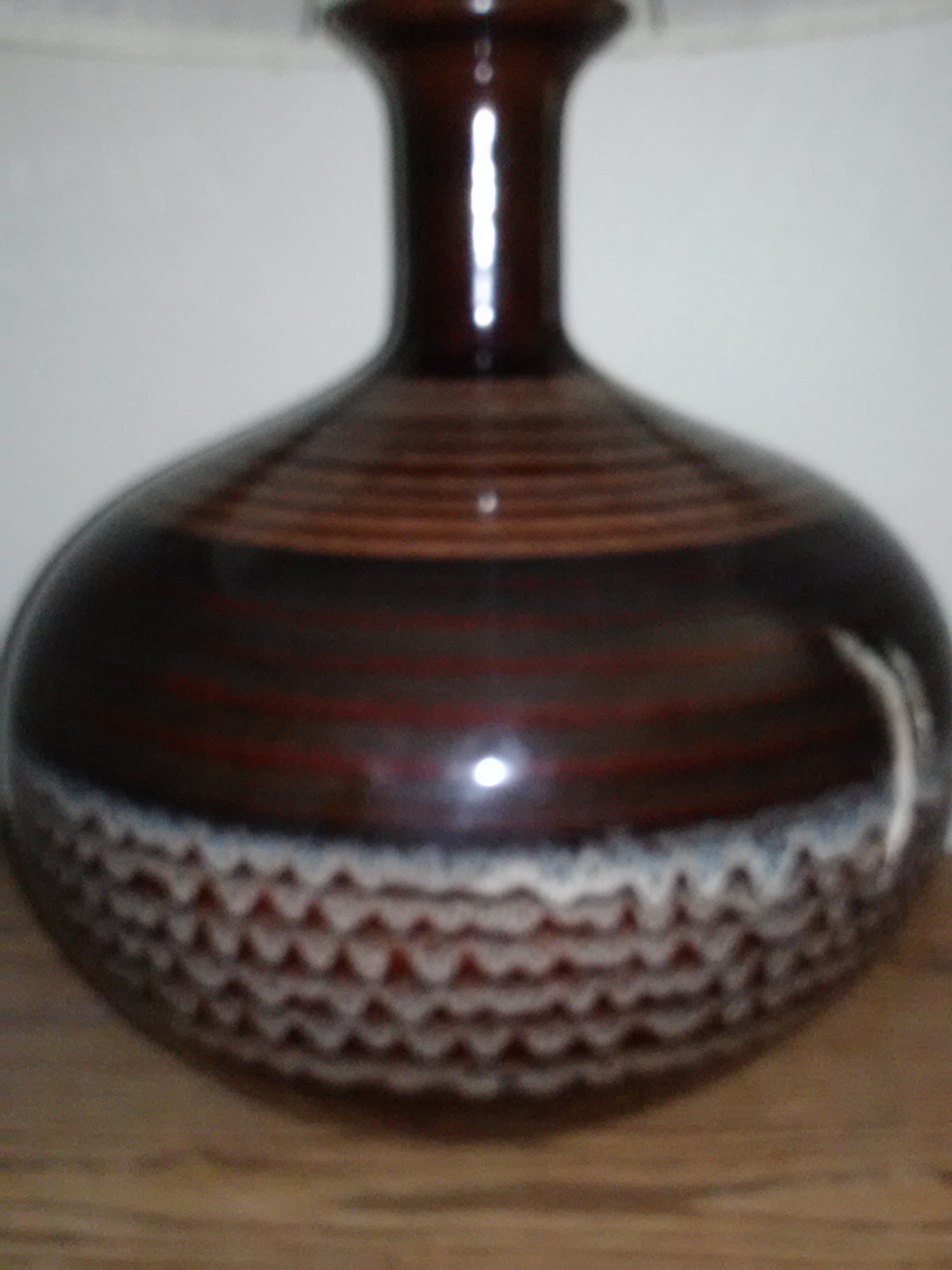 I believe it is a ceramic lamp. The lamp shade says F. Cooper, the lamp socket says Leviton and the top of the harp says Chilo.