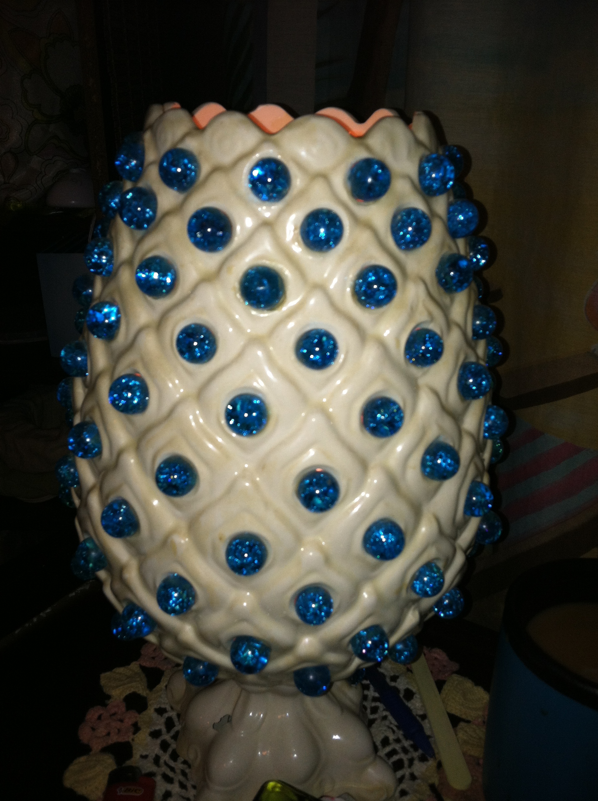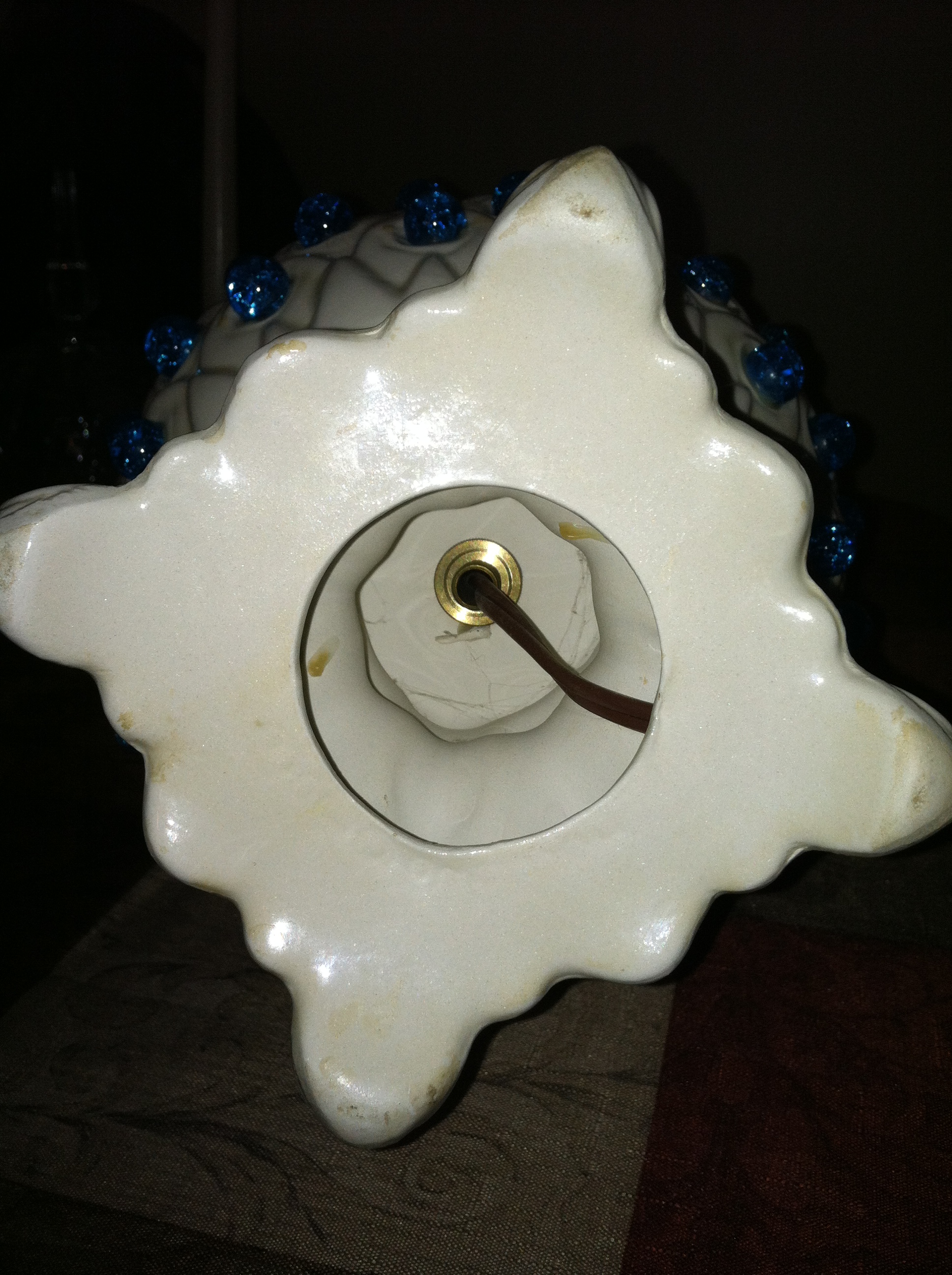 I purchased this lamp from a garage sale for $10.00 last week. It's so ugle it's beautiful. It has holes with all the blue round stones, balls or crystals (not sure) around 100 balls. Looks to have a very old working light bulb. Two prong sideways plug on brown cord. Base and vase looking part are two pieces yet I dont know if they come apart. No marking visible.