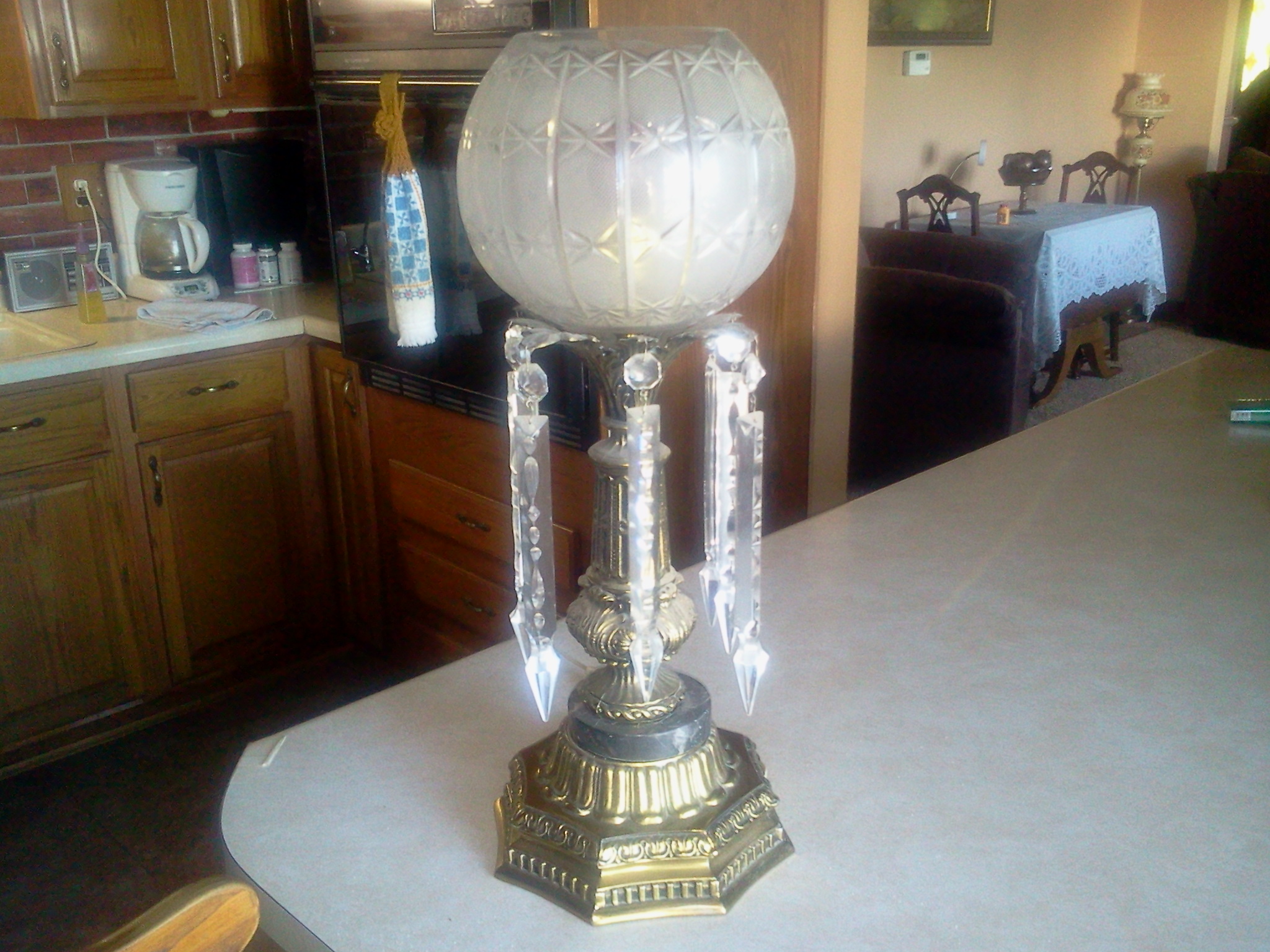 I got this lamp several years ago at a small antique shop and I would like to know if anyone has an approximate age. It is very heavy. A marble (?) piece near the bottom. I believe the globe is lead crystal and glass prisms. I think the metal is brass.