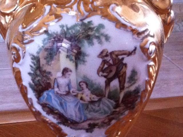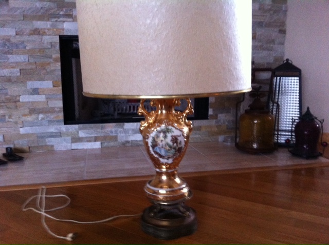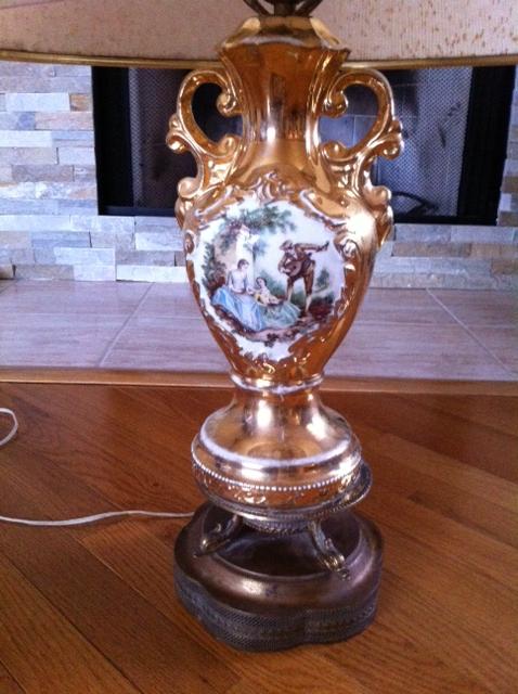 Gold lamp with male playing an instrument - birds for the base of the lamp - base appears to be brass