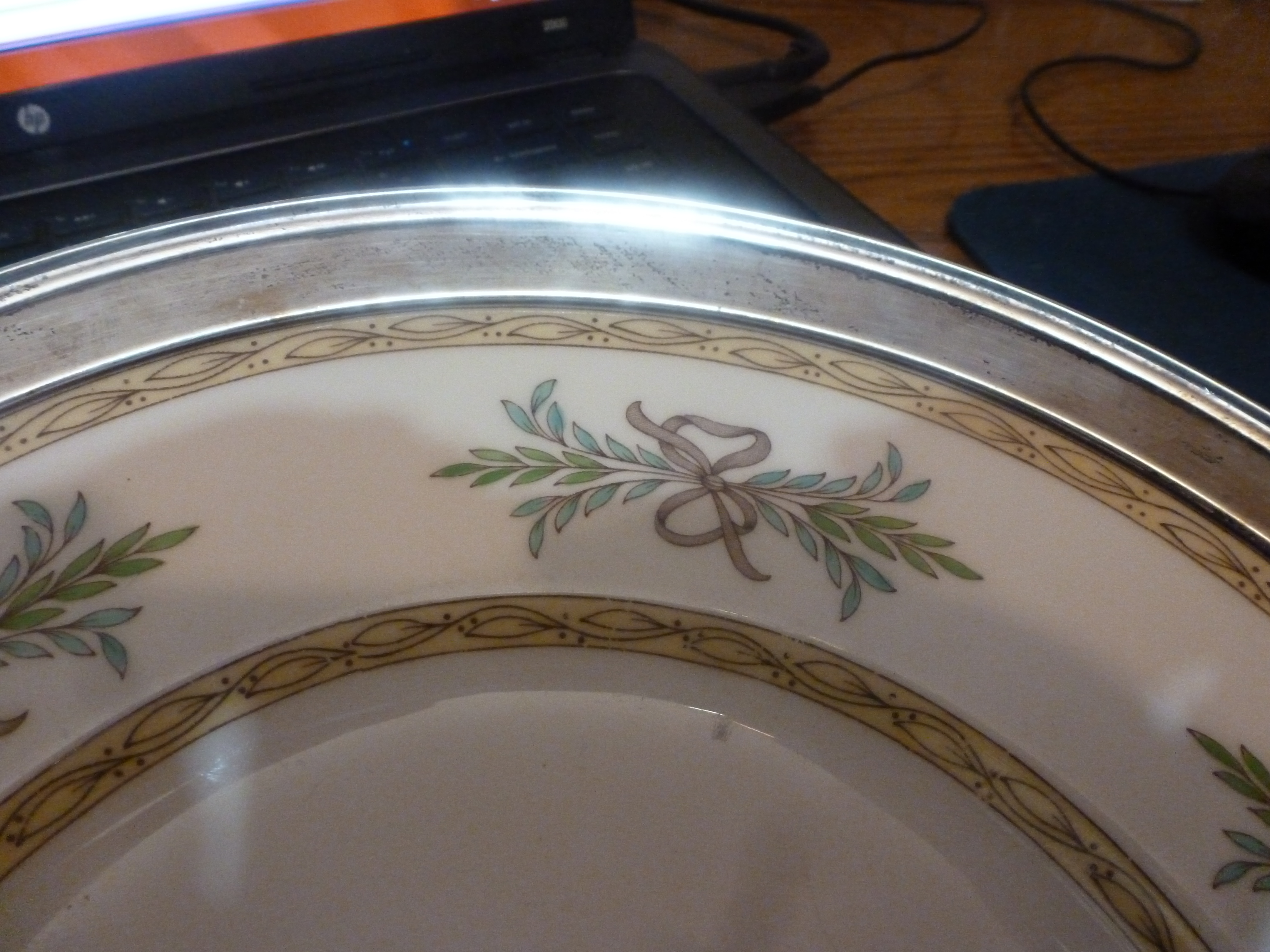 Lamp is made of two ceramic pieces and a metal base. Pink with gold floral designs. Has 4 groups of 3 small holes (petals i think). Has 4 pictures painted? on it. Appears to be a woman with trees in each picture. Lamp is sitting on a metal base