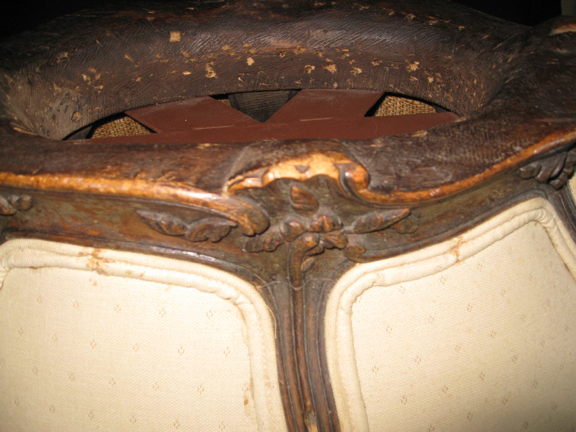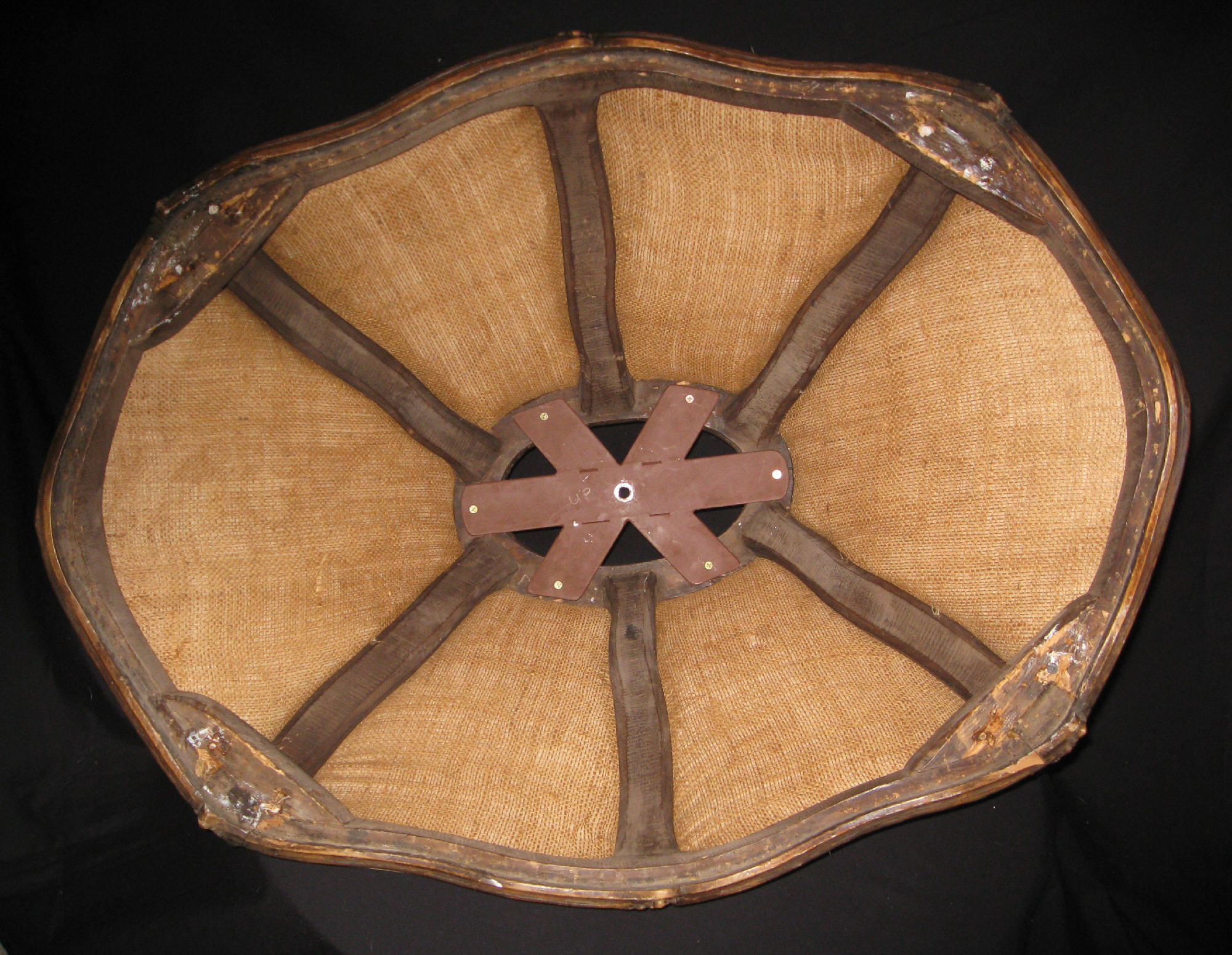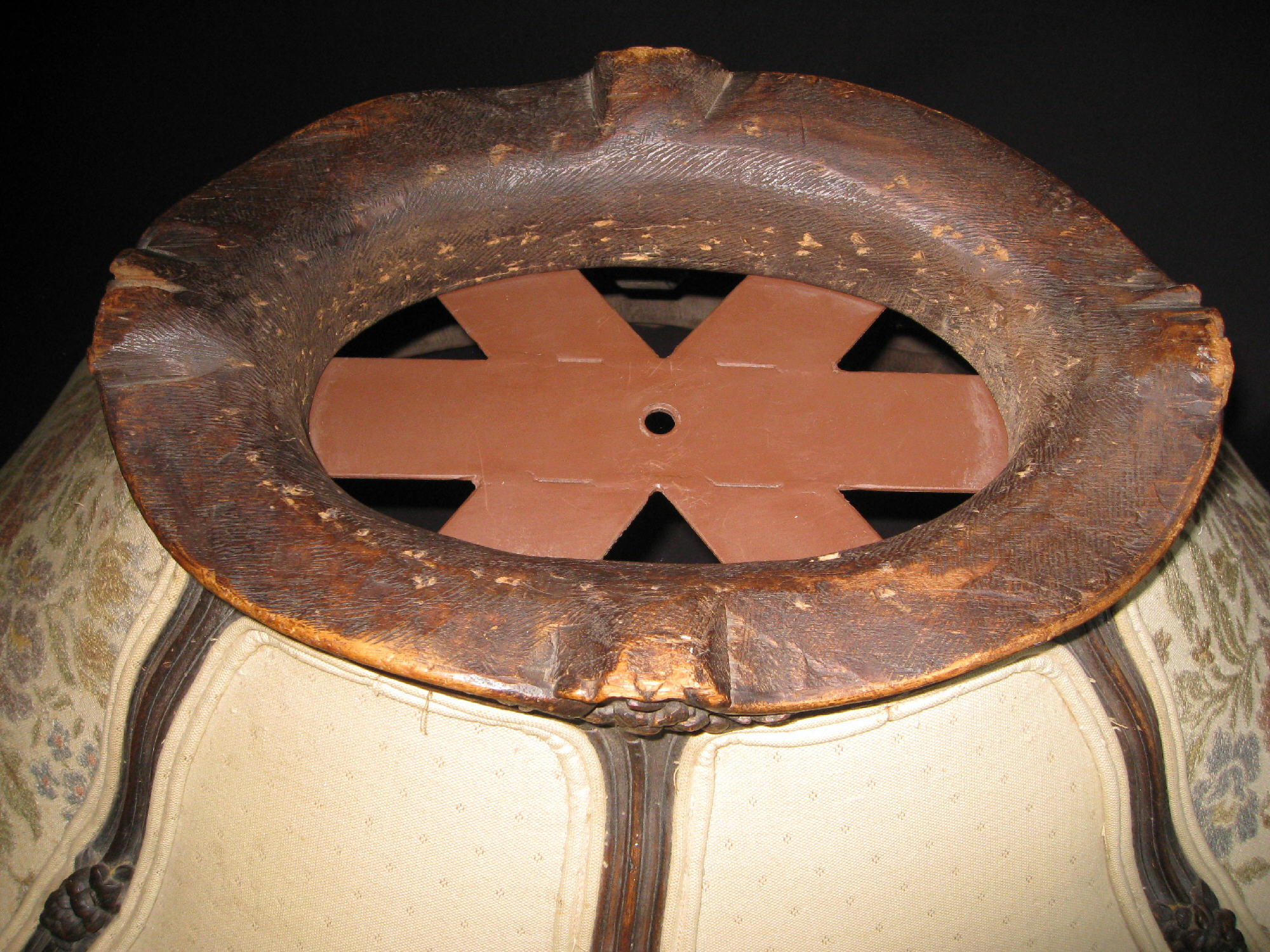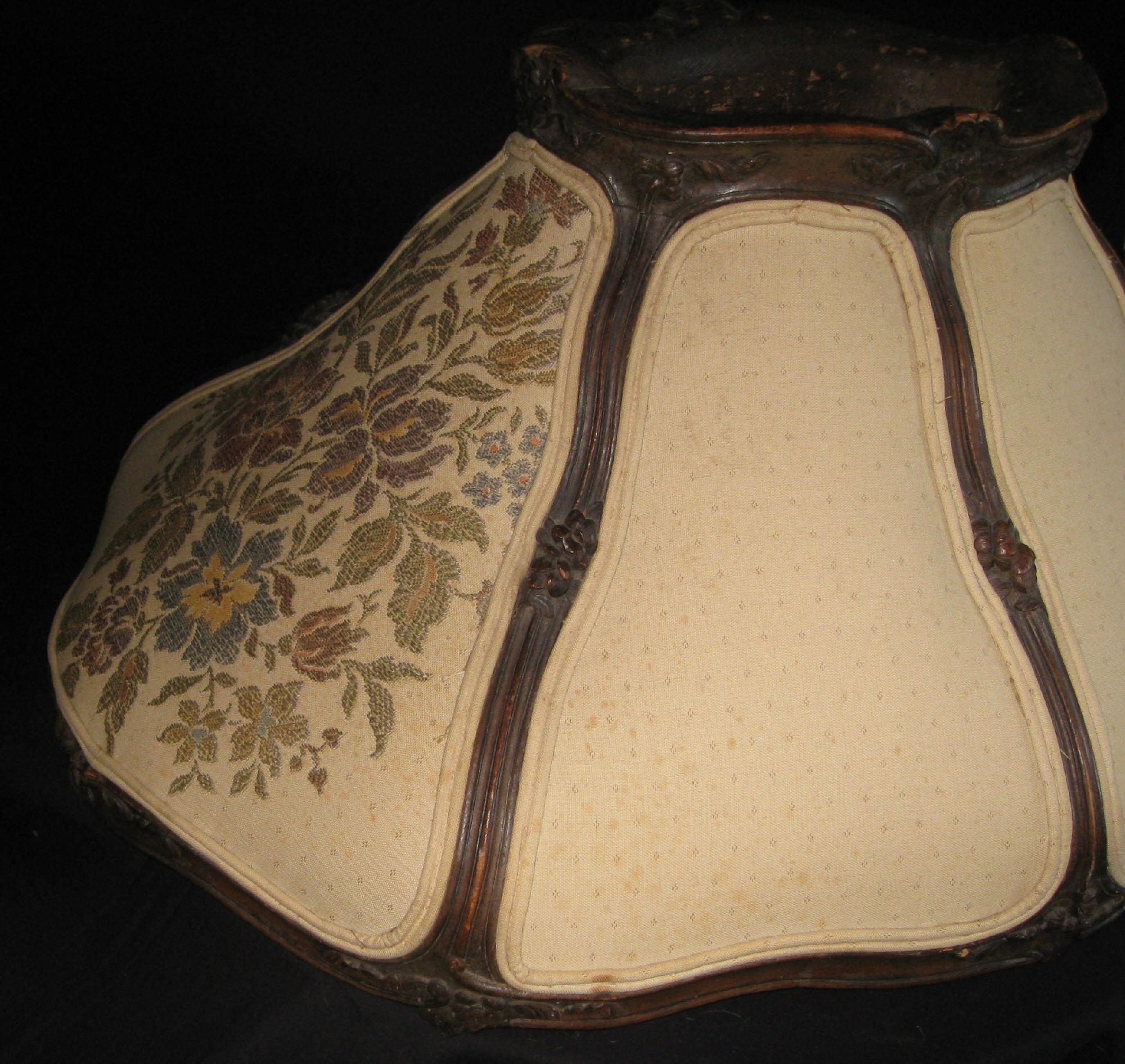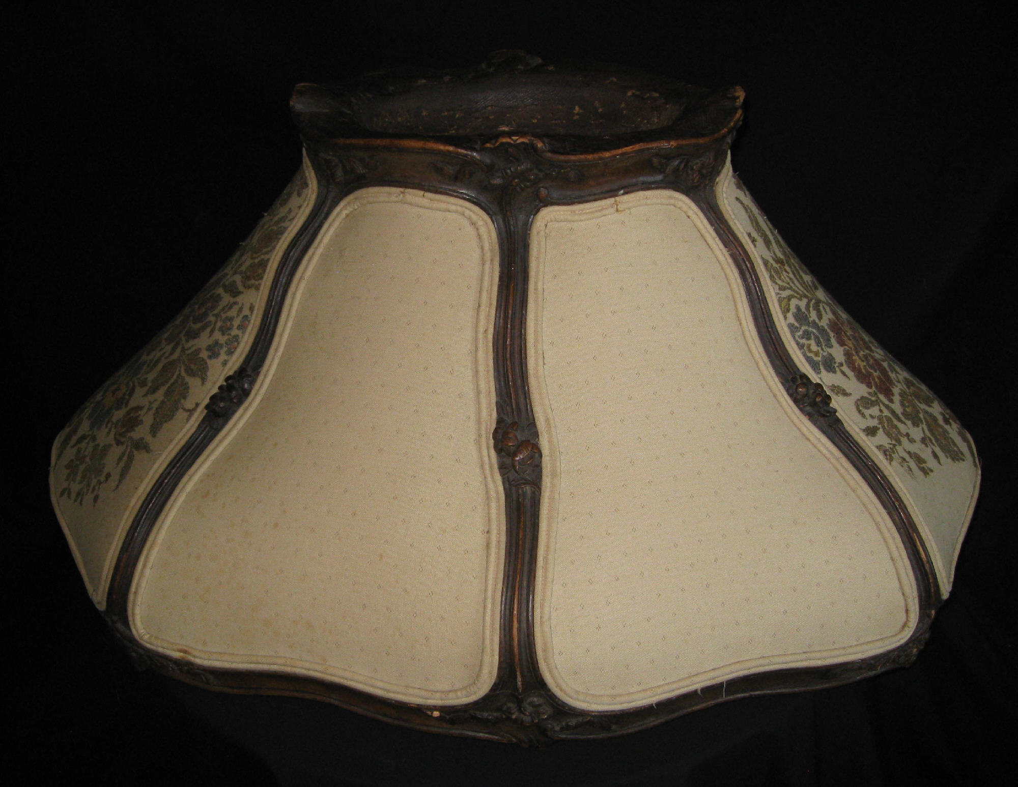 Lamp shade. Hand carved wooden frame and hand embroidery. Big and heavy, at bottom 36" long side, 26" short side, 16" tall. Top "crown" 15" long side 10" short side.