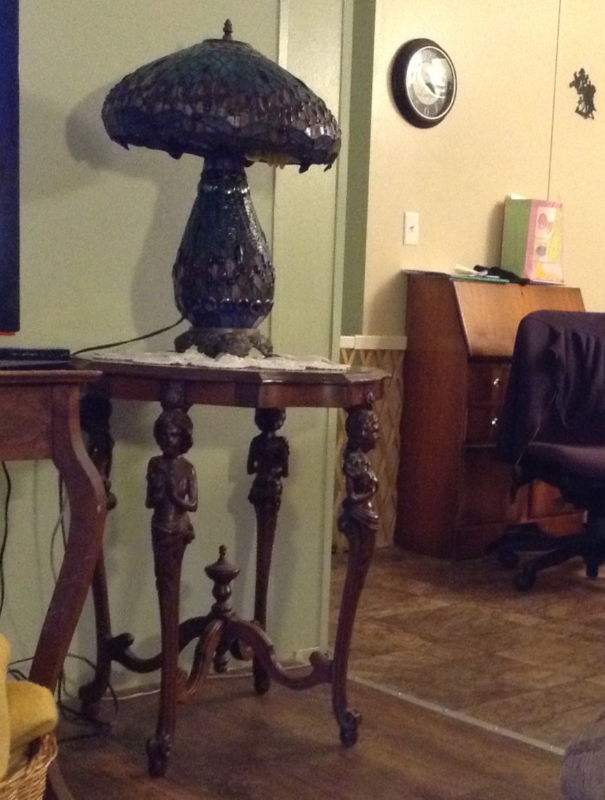 Unique one of kind table, carved lady heads with long carved flowing hair as legs. Veneer wood carved top. This table has been in the family 60yrs. No markings on bottom.