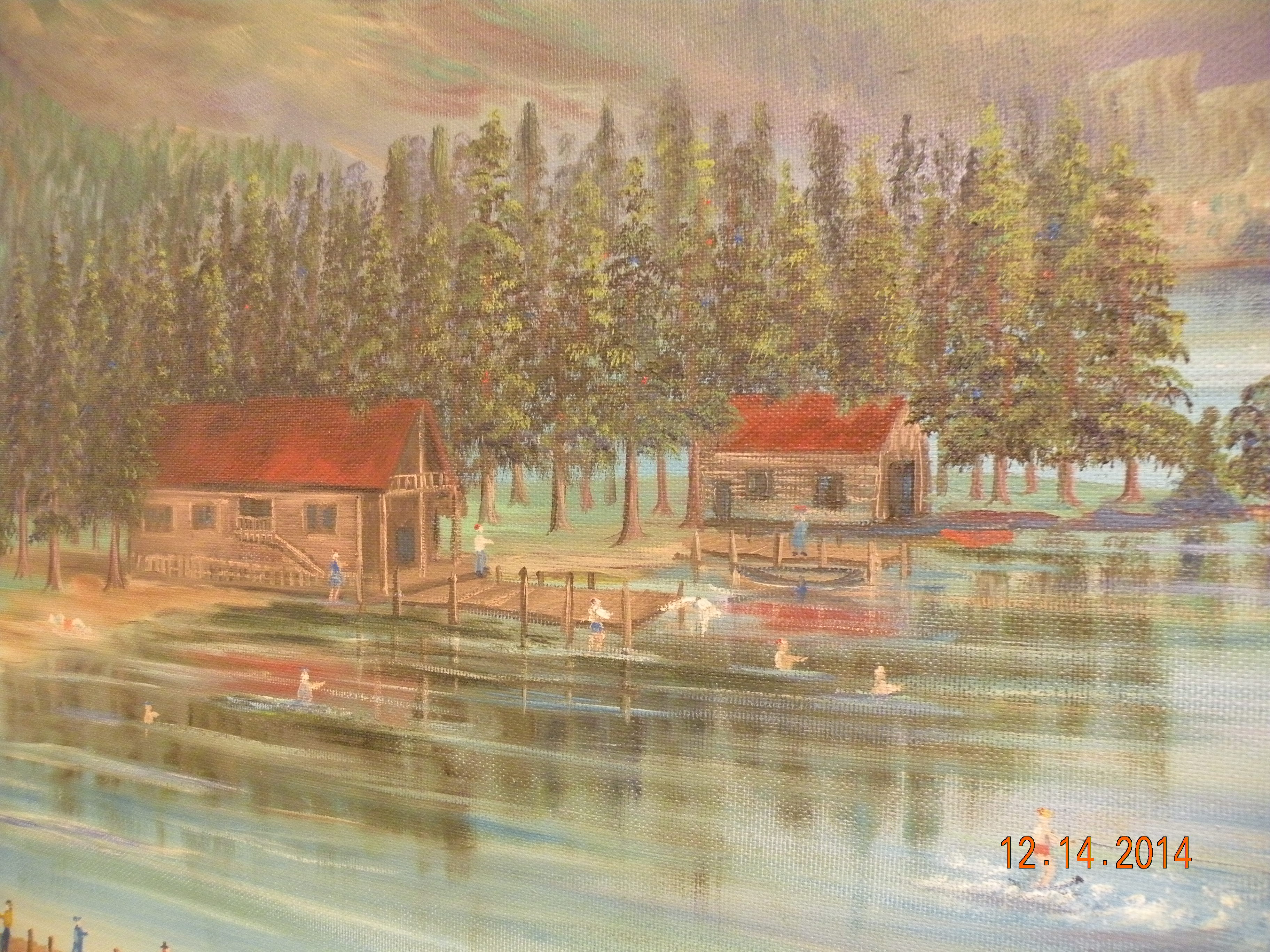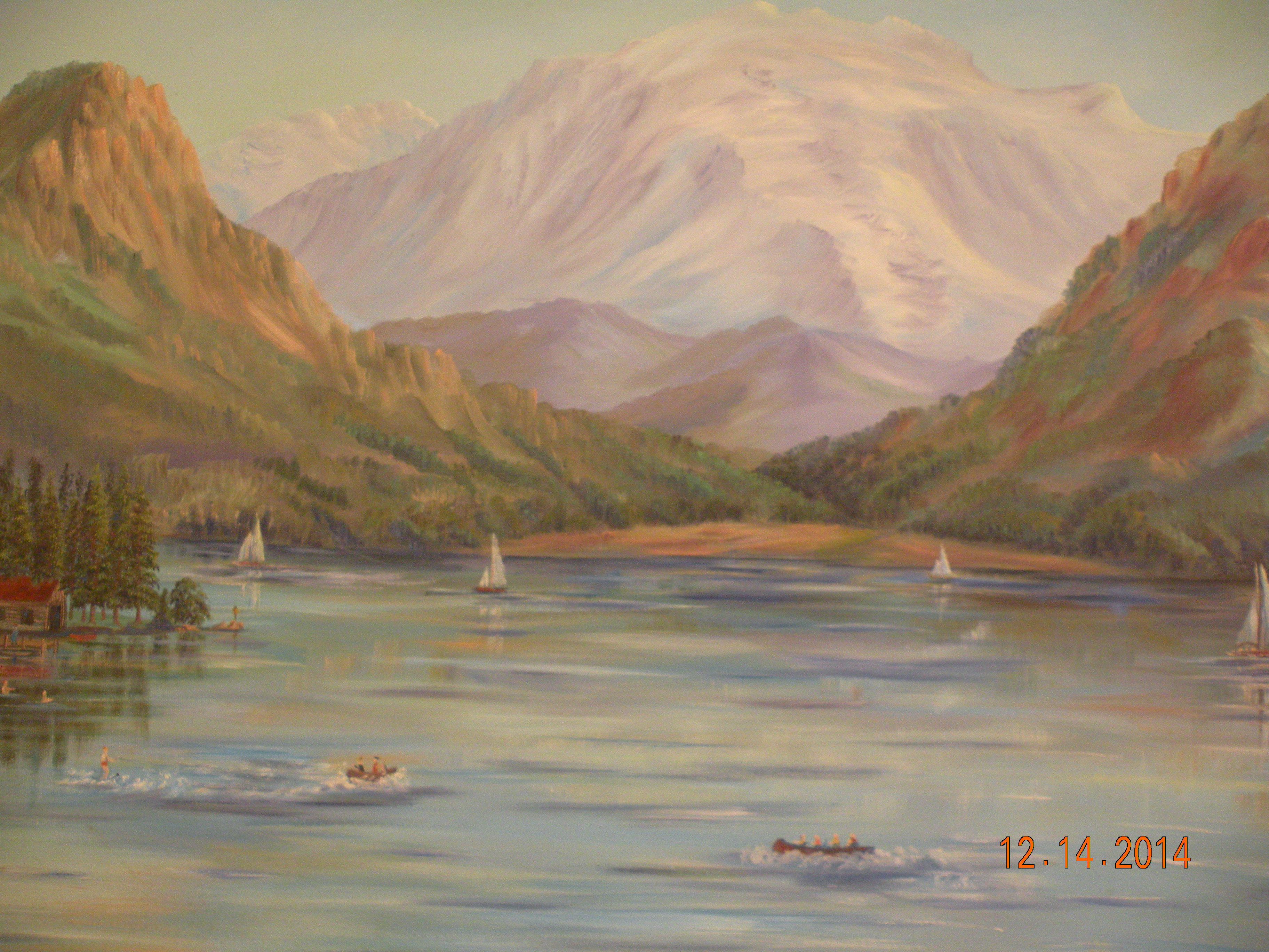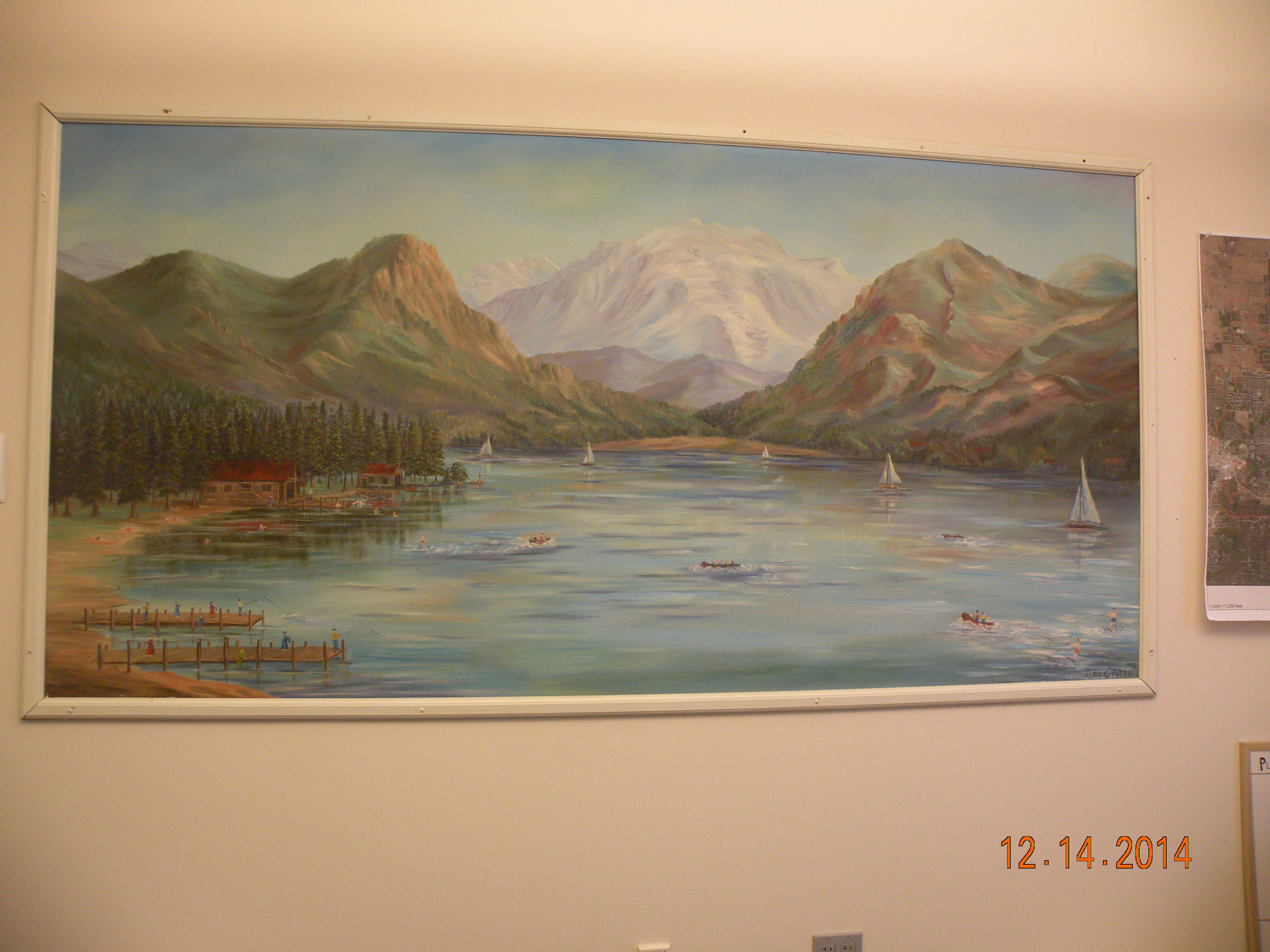 It appears to be Grand Lake, Colorado and features a resort scene in the foreground and a mountain range in the background. The painting is signed in the lower right Elsie C. Patty 1956. What little information i was able to find was that Patty was a artist in Colorado and may have had a studio at one time in the Grand Lake area. I've seen a few smaller paintings done by her but nothing near this size.