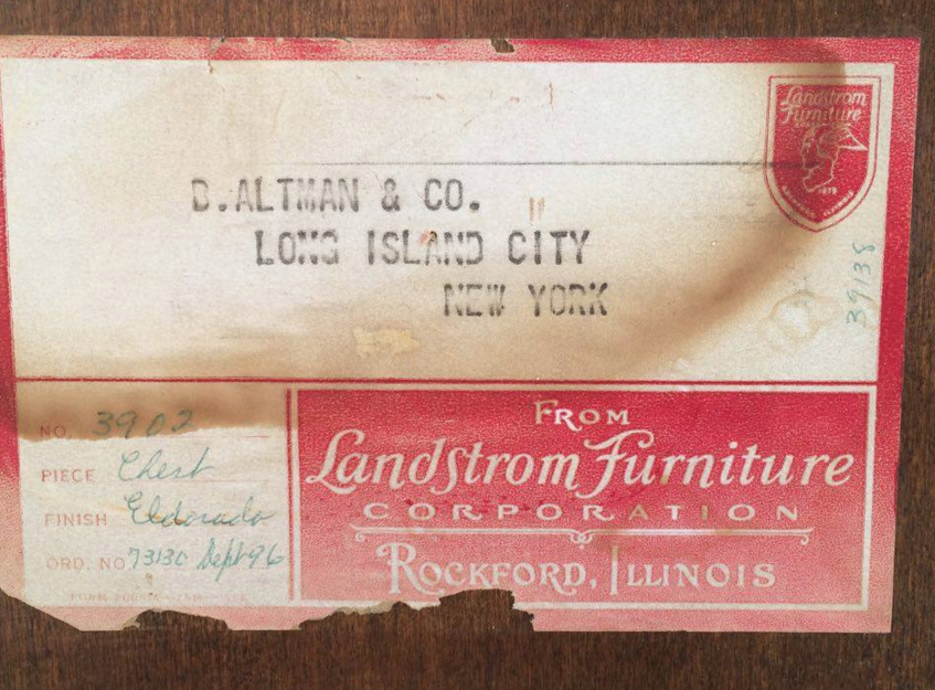 This piece is a beautiful 5 drawer chest from Landstrom Furniture. Will show pics of paper on the back and all the good stuff. Middle drawer has dividers and everything is in excellent condition on the inside. It seems to be Cedar. Would that be right? It is 38Wx20Dx46 1/4H.