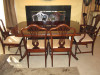 Landstrom mahogany dining table with 6 chairs including 1 captains chair with original upholstery. Table measures 62" x 42" and also includes 3 seperate fillers measuring 12" each. All 3 fillers come in a seperate box with a tag identifying Landstrom Furniture Rockford, IL pattern #2112 order #16321. Table was made sometime between 1879-1958.
