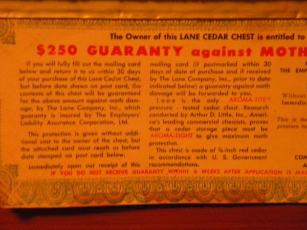 I recently acquired this chest from an estate sale. I believe I am now the 2nd owner. The material on the lid is in near perfect shape. No tears, discoloration,etc. It comes with all original hardware and the original $250.00 guaranty card.
