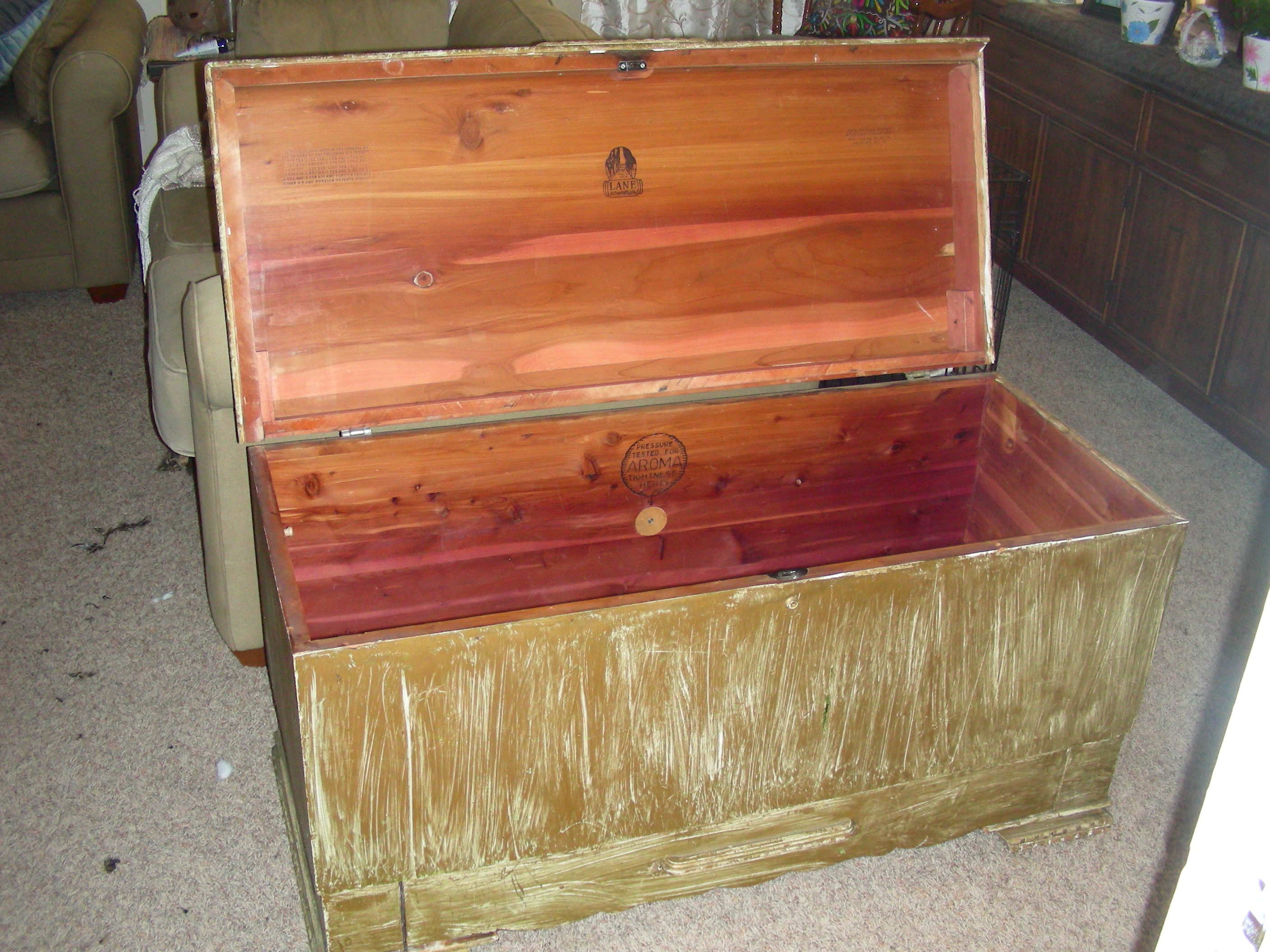 It looks as if it had been painted. There is a pull out dawer at the bottom of chest.