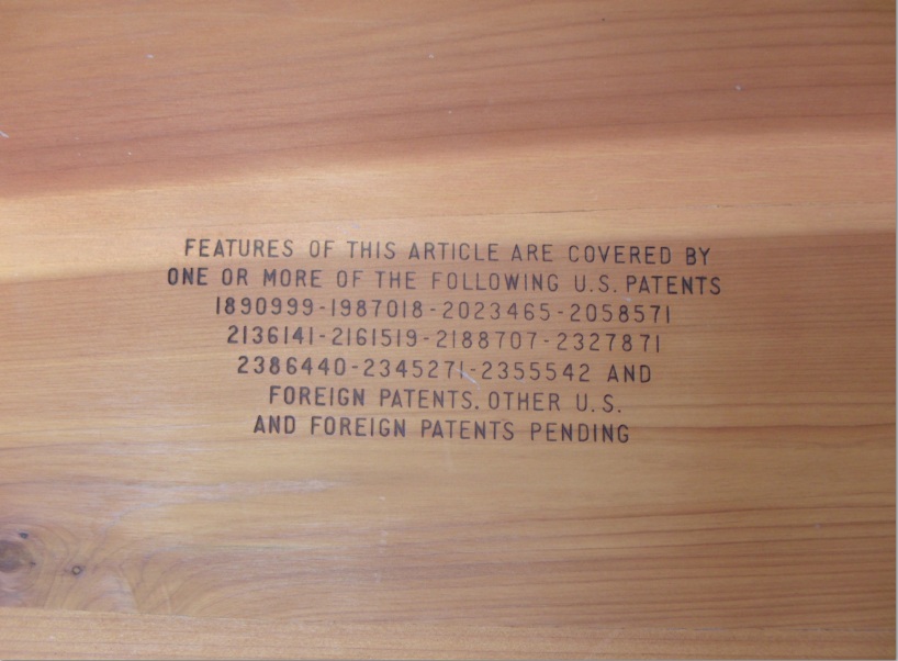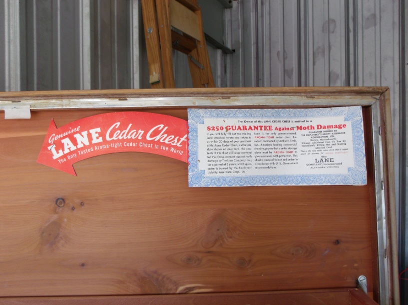 Alright, so we just bought this Lane cedar chest at a yard sale over the weekend. Have been trying to date it. Have not been able to find a serial number or style number. The legs on bottom look like they have been replaced with pine, as they are a different color, there is also pieces on the bottom that look like were used to hold a drawer on the bottom, but there is no drawer and pieces also look to be made from pine so unsure if original. There is an "Aroma Tite" plug in the back of it. Also has paper that says $250 Guarantee against moth damage. Has Lane stamp in lid, and another stamp talking about patent numbers.
